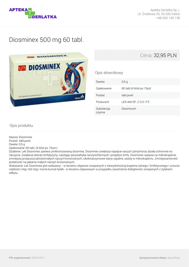 Apteka Derlatka Sp. j. Ul. Źródłowa 20, 25-335 Kielce +48 530 145 138 Diosminex 500 mg 60 tabl. Cena: 32,95 PLN Opis słownikowy Dawka 0,5 g Opakowanie 60 tabl.(4 blist.po 15szt Postać tabl.powl. Producent LEK-AM SP. Z O.O. P.F. Substancja czynna Diosminum Opis produktu Nazwa: Diosminex Postać: tabl.powl. Dawka: 0,5 g Opakowanie: 60 tabl. (4 blist.po 15szt.) Działanie: Lek Diosminex zawiera zmikronizowaną diosminę. Diosminex zwiększa napięcie naczyń żylnychoraz działa ochronnie na naczynia. Zwiększa drenaż limfatyczny, nasilając perystaltykę naczyńchłonnych i przepływ limfy. Diosminex wpływa na mikrokrążenie, zmniejsza przepuszczalnośćmałych naczyń krwionośnych, okołonaczyniowe stany zapalne, zastój w mikrokrążeniu. Zmniejszarównież podatność na pękanie małych naczyń krwionośnych. Wskazania: Lek Diosminex jest wskazany: - w leczeniu objawów związanych z niewydolnością krążenia żylnego i limfatycznego:• uczucie ciężkości nóg;• ból nóg;• nocne kurcze łydek.- w leczeniu objawowym w przypadku zaostrzenia dolegliwości związanych z żylakami odbytu. Plik wygenerowano: 08-03-2017 Powered by TCPDF (www.tcpdf.org) Oprogramowanie sklepu: AptusShop