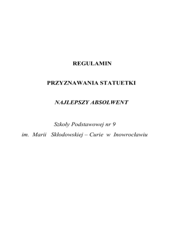 REGULAMIN PRZYZNAWANIA STATUETKI NAJLEPSZY ABSOLWENT Szkoły Podstawowej nr 9 im. Marii Skłodowskiej – Curie w Inowrocławiu I WSTĘP Zgodnie ze Statutem Szkoły § 150 pkt. 2 corocznie przyznaje się w Szkole Podstawowej nr 9 im. Marii Skłodowskiej – Curie w Inowrocławiu statuetkę „ Najlepszy Absolwent”. Celem przyznawania statuetki „Najlepszy Absolwent” jest promowanie w środowisku postaw uczniów, którzy za swoje najważniejsze zadanie uznają uzyskiwanie jak najwyższych wyników w nauce, sporcie oraz innej działalności szkolnej w ciągle całego cyklu nauczania. Jest to forma wyróżnienia, docenienia i podziękowania za pracowitość i umiejętność jak najlepszego wykorzystania swoich zdolności. Możliwość otrzymania statuetki powinna motywować uczniów do osiągania jak najwyższych wyników w nauce oraz do aktywności społecznej. Niniejszy Regulamin określa zasady i kryteria przyznawania statuetki „Najlepszy Absolwent”. 2 II KRYTERIA WYMAGAŃ Uczeń lub uczennica kończący szkołę podstawową może otrzymać statuetkę i tytuł „Najlepszy Absolwent” po spełnieniu wszystkich poniżej wymienionych kryteriów : - najwyższa wśród szóstoklasistów średnia ocen na świadectwie ukończenia szkoły, co najmniej 5,0 oraz wzorowe zachowanie ; - uzyskanie co najmniej 34 pkt. ze sprawdzianu przeprowadzonego w szóstej klasie szkoły podstawowej ; - świadectwo z nagrodą po ukończeniu klasy III ; - świadectwo z wyróżnieniem na zakończenie klasy IV i V ; - osiągnięcia w konkursach i działalność społeczna . III PROCEDURY PRZYZNAWANIA STATUETKI „Najlepszy Absolwent” 1. Wychowawcy klas szóstych typują ucznia spełniającego powyższe wymagania i składają wniosek ( załącznik nr 1) na klasyfikacyjnej Radzie Pedagogicznej. 2. Rada Pedagogiczna podejmuje uchwałę o przyznaniu statuetki „Najlepszy Absolwent”. 3. Wręczenie statuetki odbywa się podczas uroczystej akademii na zakończenie roku szkolnego w obecności uczniów, nauczycieli, rodziców i zaproszonych gości. 3 Załącznik nr 1 do Regulaminu przyznawania statuetki Najlepszy Absolwent Szkoły Podstawowej nr 9 im. Marii Skłodowskiej – Curie w Inowrocławiu . WNIOSEK O PRZYZNANIE STATUETKI NAJLEPSZY ABSOLWENT SZKOŁY PODSTAWOWEJ nr 9 im. Marii Skłodowskiej – Curie w Inowrocławiu . Wnioskuję o przyznanie statuetki Najlepszy Absolwent Szkoły Podstawowej nr 9 im. Marii Skłodowskiej - Curie w Inowrocławiu dla : ..................................................................................... nazwisko i imię ucznia, klasa Uzasadnienie wniosku: ........................................................................................................................................... ........................................................................................................................................... ........................................................................................................................................... ........................................................................................................................................... ........................................................................................................................................... ........................................................................................................................................... .......................................................................................................................................... ........................................................................ data i podpis wychowawcy 4 Załącznik 2 ( karta zbiorcza punktów dla wychowawcy ) IMIĘ I NAZWISKO UCZNIA ŚREDNIA OCEN UZYSKANA NA ŚWIADECTWIE W KLASACH IV – VI KL.IV KL.V KL.VI Razem SUMA PUNKTÓW ZDOBYTYCH ZA OGÓLNOPOLSKI SPRAWDZIAN SZÓSTOKLASISTÓW ŚWIADECTWO Z NAGRODĄ PO UKOŃCZENIU KLASY III Osiągnięcia edukacyjne Konkursy Kl. III Kl. IV Kl. V Kl. VI Razem Kl. V Kl. VI Razem miejskie powiatowe / rejonowe wojewódzkie ( w tym kuratoryjny ) ogólnopolskie Tytuł finalisty w konkursie kuratoryjnym Tytuł laureata w konkursie kuratoryjnym Działalność społeczna Kl. III Kl. IV Aktywność w Samorządzie Uczniowskim Wolontariat i akcje charytatywne 5 Załącznik 3 ( wyjaśnienie przyznawania punktów ) 1. Osiągnięcia edukacyjne od III do VI klasy KONKURSY : miejskie - I – III miejsce – 3 pkt x ilość konkursów powiatowe/ rejonowe - I – III miejsce – 5 pkt x ilość konkursów wojewódzkie , w tym konkurs kuratoryjny - 8 pkt x ilość konkursów ogólnopolskie ( za punktowane miejsce ) - 10 pkt x ilość konkursów Uzyskanie tytułu finalisty w konkursie kuratoryjnym - 20 pkt Uzyskanie tytułu laureata w konkursie kuratoryjnym - 40 pkt Średnia ocen uzyskana na świadectwie w klasach IV, V i VI - x 10pkt Suma punktów za Ogólnopolski Sprawdzian Szóstoklasistów - 34 pkt – 40 pkt Świadectwo z nagrodą po ukończeniu klasy III - 30 pkt 2. Działalność społeczna od III do VI klasy Aktywność w Samorządzie Uczniowskim - 0 – 15 pkt ( punkty przyznaje opiekun SU i wychowawca ) Wolontariat i akcje charytatywne - 0 - 15 pkt ( punkty przyznaje pedagog i wychowawca) 6