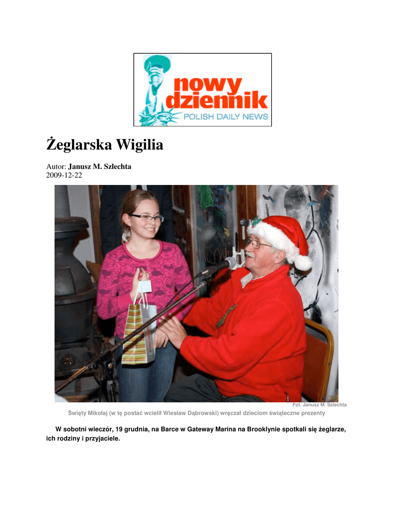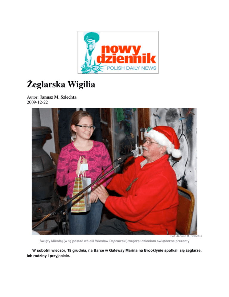 eglarska Wigilia Autor: Janusz M. Szlechta 2009-12-22 Fot. Janusz M. Szlechta wity Mikołaj (w t posta wcielił Wiesław Dbrowski) wrczał dzieciom witeczne prezenty W sobotni wieczór, 19 grudnia, na Barce w Gateway Marina na Brooklynie spotkali si eglarze, ich rodziny i przyjaciele. 2 Polski Klub eglarski w Nowym Jorku od pocztku swego istnienia organizuje przedwiteczne spotkania w gronie miłoników eglarstwa. Byli te specjalni gocie: wity Mikołaj i zaprzyjaniony z eglarzami Jerzy „Porba” Porbski, który wraz z on Helen specjalnie przyjechał na to spotkanie z Polski. Na Barce pojawiła si piknie przystrojona choinki. Wszystkie okna zostały przyozdobione witecznymi malunkami: na jednym był wity Mikołaj, na innym yczenia „Wesołych wit” na tle zielonych jodełek, na jeszcze innych przystrojone lene wierki lub niene bałwanki. A na rozstawionych stołach przygotowane było jedzenie: pierogi ruskie oraz z grzybami i kapust, bigos, łazanki, ryba smaona. Janusz Kdzierski, komandor klubu, stojc przy migotajcej wiatłami choince, złoył wszystkim serdeczne yczenia witeczne, yczył te zdrowia, ale i pomylnych wiatrów w przyszłym roku. Potem wszyscy nawzajem składali sobie yczenia zdrowia, spełnienia marze i dalekich rejsów! A kiedy skoczyło si to przekazywanie sobie ycze, wszyscy przystpili do wspólnej wigilijnej kolacji. Na stojco, bo nie było innej moliwoci. Mimo fatalnych warunków atmosferycznych – w sobot wieczorem bowiem rozpoczła si ostra i niena zima – dotarło na Bark blisko 100 osób. Komandor wrczył nagrod przyznan przez Polski Zwizek eglarski 9-letniemu Mateuszowi luszkiewiczowi dla Najlepszego Optymistrza, czyli najlepszego i zarazem najmłodszego eglarza polonijnego w USA pływajcego na aglówkach typu „Optymist”. PZ przyznał te specjaln nagrod dla Polskiego Klubu eglarskiego w Nowym Jorku za najlepsz prac wród dzieci i młodziey polonijnej. A Polish Yachting Association in North America (PYANA) przyznał nowojorskiemu klubowi nagrod za udział w czerwcu 2009 roku w regatach „TALL SHIPS ATLANTIC CHALENGE 2009” na trasie Bermudy – Charleston SC – Halifax. Po raz pierwszy polonijna młodzie – płync piknym jachtem „Fazisi” – wziła udział w tych regatach, które maj ju 50-letni histori. Komandor wrczył wszystkim uczestnikom tego rejsu płyt DVD z nagranymi wydarzeniami z tego pamitnego rejsu. Potem wity Mikołaj rozdał dzieciom prezenty, które przyniósł ze sob w przepastnym worku. Było przy tym mnóstwo umiechów i radoci. W tajemnicy dowiedzielimy si, e upominki przygotował zarzd klubu. Kiedy wity Mikołaj skoczył swoj bardzo wan prac, wycignł harmonijk ustn i zaczł gra razem z Jurkiem Porbskim. Rozpoczło si wic piewanie kold przy choince. Trwaj wic koldo, trwaj Nie odpły za szybko swym statkiem Graj nam koldo, graj Daj złama si z sob opłatkiem.... Jurek Porbski grał na gitarze, a reszta braci eglarskiej piewała. Płynły wic jedna za drug pikne polskie koldy: „Bóg si rodzi”, „Cicha noc”, „Oj, maluki, maluki”... Zapiewano te i „eglarsk kold”, któr napisał dobrze w tym rodowisku znany Andrzej Korycki. A w krótkich chwilach przerw Jurek Porbski zapiewał kilka swoich piosenek, m.in. „Cztery piwka” i „Tacz, miła, tacz”. I zrobiło si tak bardzo przytulnie i ciepło na Barce wypełnionej ludmi. Mimo e na zewntrz hulał wiatr, padał nieg, a Bark bujała ostra fala. W ubiegłym roku wigilijne spotkanie na Barce skoczyło si około drugiej w nocy, lecz tym razem egnano si wczeniej. Komandor yczył wszystkim szczliwego powrotu do domu w tej nieycy. „A niezastpionej Kasi Łojewskiej, która tak piknie ten wieczór przygotowała i wszystkim, którzy pomagali, piekli, smayli, gotowali, sprztali, choink siekierk cinali i ubierali – serdecznie dzikujemy!” – powiedział na koniec, w imieniu zarzdu, Janusz Kdzierski. 3 Fot. Janusz M. Szlechta Komandor klubu Janusz Kdzierski i Jerzy Porbski (z gitar)