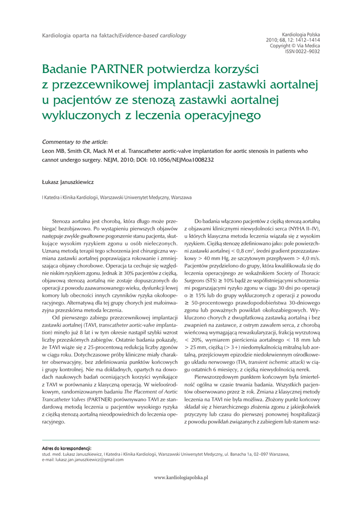 Kardiologia oparta na faktach/Evidence-based cardiology Kardiologia Polska 2010; 68, 12: 1412–1414 Copyright © Via Medica ISSN 0022–9032 Badanie PARTNER potwierdza korzyści z przezcewnikowej implantacji zastawki aortalnej u pacjentów ze stenozą zastawki aortalnej wykluczonych z leczenia operacyjnego Commentary to the article: Leon MB, Smith CR, Mack M et al. Transcatheter aortic−valve implantation for aortic stenosis in patients who cannot undergo surgery. NEJM, 2010; DOI: 10.1056/NEJMoa1008232 Łukasz Januszkiewicz I Katedra i Klinika Kardiologii, Warszawski Uniwersytet Medyczny, Warszawa Stenoza aortalna jest chorobą, która długo może przebiegać bezobjawowo. Po wystąpieniu pierwszych objawów następuje zwykle gwałtowne pogorszenie stanu pacjenta, skutkujące wysokim ryzykiem zgonu u osób nieleczonych. Uznaną metodą terapii tego schorzenia jest chirurgiczna wymiana zastawki aortalnej poprawiająca rokowanie i zmniejszająca objawy chorobowe. Operacja ta cechuje się względnie niskim ryzykiem zgonu. Jednak ≥ 30% pacjentów z ciężką, objawową stenozą aortalną nie zostaje dopuszczonych do operacji z powodu zaawansowanego wieku, dysfunkcji lewej komory lub obecności innych czynników ryzyka okołooperacyjnego. Alternatywą dla tej grupy chorych jest małoinwazyjna przezskórna metoda leczenia. Od pierwszego zabiegu przezcewnikowej implantacji zastawki aortalnej (TAVI, transcatheter aortic-valve implantation) minęło już 8 lat i w tym okresie nastąpił szybki wzrost liczby przezskórnych zabiegów. Ostatnie badania pokazały, że TAVI wiąże się z 25-procentową redukcją liczby zgonów w ciągu roku. Dotychczasowe próby kliniczne miały charakter obserwacyjny, bez zdefiniowania punktów końcowych i grupy kontrolnej. Nie ma dokładnych, opartych na dowodach naukowych badań oceniających korzyści wynikające z TAVI w porównaniu z klasyczną operacją. W wieloośrodkowym, randomizowanym badaniu The Placement of Aortic Trancatheter Valves (PARTNER) porównywano TAVI ze standardową metodą leczenia u pacjentów wysokiego ryzyka z ciężką stenozą aortalną nieodpowiednich do leczenia operacyjnego. Do badania włączono pacjentów z ciężką stenozą aortalną z objawami klinicznymi niewydolności serca (NYHA II–IV), u których klasyczna metoda leczenia wiązała się z wysokim ryzykiem. Ciężką stenozę zdefiniowano jako: pole powierzchni zastawki aortalnej < 0,8 cm2, średni gradient przezzastawkowy > 40 mm Hg, ze szczytowym przepływem > 4,0 m/s. Pacjentów przydzielono do grupy, która kwalifikowała się do leczenia operacyjnego ze wskaźnikiem Society of Thoracic Surgeons (STS) ≥ 10% bądź ze współistniejącymi schorzeniami pogarszającymi ryzyko zgonu w ciągu 30 dni po operacji o ≥ 15% lub do grupy wykluczonych z operacji z powodu ≥ 50-procentowego prawdopodobieństwa 30-dniowego zgonu lub poważnych powikłań okołozabiegowych. Wykluczono chorych z dwupłatkową zastawką aortalną i bez zwapnień na zastawce, z ostrym zawałem serca, z chorobą wieńcową wymagającą rewaskularyzacji, frakcją wyrzutową < 20%, wymiarem pierścienia aortalnego < 18 mm lub > 25 mm, ciężką (> 3+) niedomykalnością mitralną lub aortalną, przejściowym epizodzie niedokrwiennym ośrodkowego układu nerwowego (TIA, transient ischemic attack) w ciągu ostatnich 6 miesięcy, z ciężką niewydolnością nerek. Pierwszorzędowym punktem końcowym była śmiertelność ogólna w czasie trwania badania. Wszystkich pacjentów obserwowano przez ≥ rok. Zmiana z klasycznej metody leczenia na TAVI nie była możliwa. Złożony punkt końcowy składał się z hierarchicznego złożenia zgonu z jakiejkolwiek przyczyny lub czasu do pierwszej ponownej hospitalizacji z powodu powikłań związanych z zabiegiem lub stanem wsz- Adres do korespondencji: stud. med. Łukasz Januszkiewicz, I Katedra i Klinika Kardiologii, Warszawski Uniwersytet Medyczny, ul. Banacha 1a, 02–097 Warszawa, e-mail: [email protected] www.kardiologiapolska.pl Badanie PARTNER potwierdza korzyści z przezcewnikowej implantacji zastawki aortalnej czepionej zastawki aortalnej. Drugorzędowe punkty końcowe objęły: zgony sercowo-naczyniowe, zmiany w klasie NYHA, współczynnik ponownych hospitalizacji związanych ze stanem zastawki lub powikłań zabiegowych, dystans pokonany w czasie testu 6-minutowego marszu, stan zastawki (oceniany za pomocą echokardiografii) i wystąpienie zawału serca, udaru, ostrej niewydolności nerek, powikłań naczyniowych i krwawienia. Między majem 2007 a marcem 2009 roku w 21 ośrodkach (17 w Stanach Zjednoczonych) do badania włączono 358 chorych z ciężką stenozą aortalną nieodpowiednich do leczenia operacyjnego i losowo włączono do grupy TAVI lub standardowej metody terapii (po 179 pacjentów). Wszystkich chorych obserwowano przez co najmniej rok (mediana 1,6 roku, maksymalny okres: 2,8 roku). Badane grupy nie różniły się istotnie statystycznie pod względem podstawowych danych klinicznych (TAVI, leczenie klasyczne, odpowiednio: wiek 83,1; 83,2; płeć męska 45,8%; 46,9%; STS score 11,2%; 12,1%). Generalnie wszyscy pacjenci charakteryzowali się wysokim ryzykiem (STS score 11,6 ± 6,0%), ale wielu z nich miało niski STS score przy dodatkowych obciążeniach, wykluczających u nich możliwość operacji [porcelanowa aorta: 15,1%; deformacje klatki piersiowej lub szkodliwe skutki napromieniowania: 13,1%; tlenozależna niewydolność oddechowa: 23,5%; kruchość (frailty): 23,1%]. Spośród 179 chorych z grupy TAVI u 6 (3,4%) nie przeprowadzono zabiegu implantacji zastawki (2 zmarło przed planowym zabiegiem, u 2 nie udało się wprowadzić zastawki przezudowo, u 2 zmierzony okołozabiegowo wymiar pierścienia aortalnego był zbyt duży). Po randomizacji średni czas do zabiegu wyniósł 6 dni. Podczas zabiegu lub w ciągu 24 h po nim zmarło 2 (1,1%) pacjentów, 3 (1,7%) doznało poważnych udarów, 1 (0,6%) embolizacji zastawki, a 2 (1,1%) 