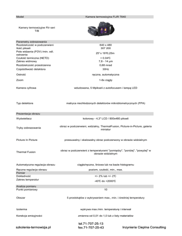 Model Kamera termowizyjna FLIR T640 Kamery termowizyjne Flir seri T/B Parametry zobrazowania Rozdzielczość w podczerwieni Ilość pikseli Pole widzenia (FOV) /min. odl. ostrzenia Czułość termiczna (NETD) Zakres widmowy Rozdzielczość przestrzenna Częstotliwość detektora Ostrość Zoom Kamera cyfrowa Typ detektora 640 x 480 307 200 25° x 19°/0,25m < 0.04°C 7,8 - 14 µm 0,68 mrad 30Hz ręczna, automatyczna 1-8x ciągły wdudowana, 5 Mpikseli z autofocusem i lampą LED matryca niechłodzonych detektorów mikroblometrycznych (FPA) Prezentacja obrazu Wyświetlacz Tryby zobrazowania Picture In Picture Thermal Fusion Automatyczna regulacja obrazu Ręczna regulacja obrazu Pomiar Dokładność Zakres temperatur kolorowy - 4,3" LCD / 800x480 pikseli obraz w podczerwieni, widzialny, ThermalFusion, Picture-in-Picture, galeria miniatur przesuwalny i skalowalny obraz podczerwony w obrazie widzialnym obraz w podczerwieni z temperaturami "pomiędzy", "poniżej", "powyżej" w obrazie widzialnym ciągła/ręczna, liniowa lub na bazie histogramu poziom, czułość, min., max. +/- 2% lub +/- 2°C -40°C do +2000°C Analiza pomiaru Punkt pomiarowy Obszar Izoterma 10 5 prostokątów z wykrywaniem max., min. i średniej temperatury wykrywa max./min. temperaturę i interwał Korekcja emisyjności zmienna od 0,01 do 1,0 lub z listy materiałów szkolenia-termowizja.pl tel.71-707-25-13 fex.71-707-25-43 Inzynieria Cieplna Consulting Korekcja pomiarów Automatyczne wykrywanie chłodnych /gorących miejsc Temperatura różnicowa Alarm funkcji pomiarowych Notatki dotyczące obrazu Dźwięk Znacznik obrazu Tekst Szkic temperatury odbitej, transmisji optyki i transmisji atmosfery automatyczne punkty pomiarowe w chłodnych lub gorących miejscach w obserwowanym obszarze delta temperatury między funkcjami pomiarowymi lub temperaturą odniesienia dźwiękowy/optyczny (powyżej/poniżej) z dwolną funkcją pomiarową do 60 sekund; zapis razem z obrazem przez Bluetooth 6 w obrazie w podczerwieni lub w obrazie widzialnym tekst z predefiniowanej listy lub z klawiatury ekranowej z ekranu dotykowego (zapisywany automatycznie z obrazem) MeterLink Wskaźnik laserowy Laser Wskazywanie x klasa 2, laser półprzewodnikowy AlGalnP położenie lasera jest automatycznie pokazywane na obrazie w podczerwieni Ustawienia Palety barw Ustawienia lokalne (setup) Klawisze programowalne Zapis obrazu Typ Format pliku Okresowy zapis obrazów Panorama Tryb Strumieniowa transmisja wideo Nieradiometryczny zapis wideo Tworzenie raportu Raport błyskawiczny Interfejsy USB-A USB mini-B Zespolony sygnał wizji Złącze zestawu słuchawkowego WLAN Zasilanie Typ akumulatora Czas pracy Ładowanie żelaza, tęczy, cz-b, b-cz, tęczy HC, niebieska jednostki, język, format daty i czasu, automatyczne wyłączenie, jaskrawość ekranu x karta pamięci SD standardowy JPEG - włącznie z danymi pomiarowymi co każde 10 sekund do 24 godzin obrazy w podczerwieni i widzialne, jednoczesny zapis obu typów obrazów; obraz widzialny jest automatycznie łączony z odpowiednim obrazem termowizyjnym MPEG-4 na karcie SD PDF w kamerze z obrazem w podczerwieni i widzialnym podłączenie zewnętrznego dysku USB (kopiowanie na pendrive) transfer danych do/z PC, strumieniowa transmisja MPEG-7 PAL lub NTSC x x wymienny, litowo-jonowy 2,5 godziny w kamerze, z ładowarki sieciowej, w ładowrce dwukomorowej lub z ład. samochodowej 12V Automatyka zasilania samoczynne wyłączenie (zgodne z ustawieniami użytkownika) Praca z sieci Napięcie zasilacza Dane środowiskowe Zakres temp. pracy Wilgotność Udary zasilacz sieciowy 100-240V AC, 50/60 Hz 12V szkolenia-termowizja.pl od -15°C do +50°C IEC 60068-2-30/24 h 95% wilgotność względna 25g (IEC 60068-2-29) tel.71-707-25-13 fex.71-707-25-43 Inzynieria Cieplna Consulting Wibracje Obudowa Emisja EMC Dane fizyczne Rozmiary (dł. x szer. x wys.) Waga Gniazdo mintażowe statywu Inne Gwarancja 2g (IEC 60068-2-6) IP 54 (IEC 60529) EN 61000-6-4 144 x 195 x 95 mm 0,88 kg wliczając akumulator 1/4" - 23 Gwarancja rozszerzona do 2 lat na kamerę i do 10 lat na detektor po rejestracji Informacje i kontat I.C.C. WOJCIECH DANIELEWICZ (Inżynieria Cieplna Consulting) tel. 71-707-25-13 fax:71-707-25-43 email: [email protected] www.szkolenia-termowizja.pl szkolenia-termowizja.pl tel.71-707-25-13 fex.71-707-25-43 Inzynieria Cieplna Consulting