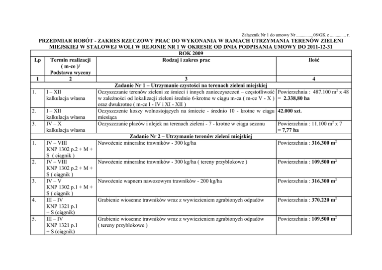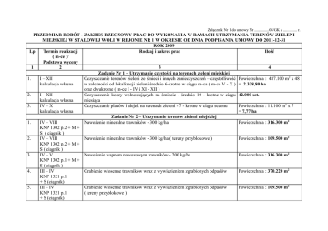 Załącznik Nr 1 do umowy Nr ...............08/GK z .............. r. PRZEDMIAR ROBÓT - ZAKRES RZECZOWY PRAC DO WYKONANIA W RAMACH UTRZYMANIA TERENÓW ZIELENI MIEJSKIEJ W STALOWEJ WOLI W REJONIE NR 1 W OKRESIE OD DNIA PODPISANIA UMOWY DO 2011-12-31 ROK 2009 Lp Termin realizacji Rodzaj i zakres prac Ilość ( m-ce )/ Podstawa wyceny 1 2 3 4 Zadanie Nr 1 – Utrzymanie czystości na terenach zieleni miejskiej 1. I – XII Oczyszczanie terenów zieleni ze śmieci i innych zanieczyszczeń – częstotliwość Powierzchnia : 487.100 m2 x 48 kalkulacja własna w zależności od lokalizacji zieleni średnio 6-krotne w ciągu m-ca ( m-ce V - X ) = 2.338,80 ha oraz dwukrotne ( m-ce I - IV i XI - XII ) 2. I – XII Oczyszczenie koszy wolnostojących na śmiecie - średnio 10 - krotne w ciągu 42.000 szt. kalkulacja własna miesiąca 3. IV – X Oczyszczanie placów i alejek na terenach zieleni - 7 - krotne w ciągu sezonu Powierzchnia : 11.100 m2 x 7 kalkulacja własna = 7,77 ha Zadanie Nr 2 – Utrzymanie terenów zieleni miejskiej 1. IV – VIII Nawożenie mineralne trawników - 300 kg/ha Powierzchnia : 316.300 m2 KNP 1302 p.2 + M + S ( ciągnik ) 2. IV – VIII Nawożenie mineralne trawników - 300 kg/ha ( tereny przyblokowe ) Powierzchnia : 109.500 m2 KNP 1302 p.2 + M + S ( ciągnik ) 3. IV – V Nawożenie wapnem nawozowym trawników - 200 kg/ha Powierzchnia : 316.300 m2 KNP 1302 p.1 + M + S ( ciągnik ) 4. III – IV Grabienie wiosenne trawników wraz z wywiezieniem zgrabionych odpadów Powierzchnia : 370.220 m2 KNP 1321 p.1 + S (ciągnik) 5. III – IV Grabienie wiosenne trawników wraz z wywiezieniem zgrabionych odpadów Powierzchnia : 109.500 m2 KNP 1321 p.1 ( tereny przyblokowe ) + S (ciągnik) 6. 7. 8. 9. 10. 11. 12. 13. 14. V–X kalkulacja własna V–X kalkulacja własna V–X kalkulacja własna V – IX kalkulacja własna V – IX kalkulacja własna V–X kalkulacja własna V – VI kalkulacja własna V – VIII kalkulacja własna IV – X KNR 2-21 0411 01 (0413 08 + M) wiosna 0704 07 (0707 04 + M 1) lato (0707 07 + M 2) lato (0707 07 + M 3) lato 0704 04 (M 1) 0704 07 (M 2) 0704 07 (M 3) (0707 06 + M) jesień 0704 06 Koszenie trawników wraz ze zgrabieniem skoszonej trawy i jej wywiezieniem 8 - krotne na terenach wg wykazu Koszenie trawników wraz ze zgrabieniem skoszonej trawy i jej wywiezieniem 5 - krotne na terenach wg wykazu Koszenie trawników wraz ze zgrabieniem skoszonej trawy i jej wywiezieniem 4 - krotne na terenach wg wykazu Koszenie trawników wraz ze zgrabieniem skoszonej trawy i jej wywiezieniem 3 - krotne na terenach wg wykazu Koszenie terenów zieleni dwukrotne wraz ze zgrabieniem skoszonej trawy i jej wywiezieniem na terenach wg wykazu Koszenie trawników wraz ze zgrabieniem skoszonej trawy i jej wywiezieniem 5 - krotne ( tereny przyblokowe ) Renowacja starych wydeptanych trawników obejmująca przekopanie gleby, wysiew trawy, uwałowanie Przycinanie brzegów trawników powyrastanych poza krawężnik wraz z wywiezieniem odpadów Utrzymanie całoroczne kwietników sezonowych obejmujące trzykrotne obsadzenia ( wiosenne, letnie, jesienne ) i całoroczną pielęgnację ( podlewanie wodą z beczkowozu, pielenie, nawożenie mineralne, opryskiwanie środkami chemicznymi ochrony roślin, likwidację i przekopanie ) - materiał do obsadzeń : a) wiosenne 20.000 szt. gat. bratek, niezapominajka, stokrotka itp. ( sadzonki w gatunku I ) - M b) letnie 21.000 szt. w tym : M 1 gat. canna, chryzantema – 1.500 szt; M 2 – gat. żeniszek, szałwia, lewkonia, mróz, niecierpek, pelargonia, begonia bulwiasta – 10.000 szt.; M 3 – gat. begonia sempeflores, lobelia, tagetes – 9.500 szt. (sadzonki w gat. I ) – M 180.925 m2 x 8 = 1.447.400 m2 c) jesienne 1.000 szt. gat. bratek, chryzantema ( sadzonki w gat. I ) - M c) Powierzchnia : 40 m2 116.410 m2 x 5 = 582.050 m2 28.420 m2 x 4 = 113.680 m2 51.900 m2 x 3 = 155.700 m2 115.020 m2 x 2 = 230.040 m2 109.500 m2 x 5 = 547.500 m2 800 m2 5.000 mb Powierzchnia : 672 m2 a) Powierzchnia : 672 m2 b) Powierzchnia : 672 m2 w tym : M1 – 150 m2 M2 – 272 m2 M3 – 250 m2 15. 16. 17. 18. 19. 20. IV – XI KNR 2-21 0705 05 0414 05 + M IV – XI KNR 2-21 0705 09 0414 09 III – XI kalkulacja własna IV – XI KNR 2-21 (0417 06 + M ) wiosna 0706 02 ( 0707 06 + M ) lato 0706 02 ( 0707 06 + M) jesień 0706 02 V–X KNP 1345 p.1(tw.) + S (ciągnik), 1354 + S (ciągnik) V–X KNP 1345 p.1(twarde) + S jw. Pielęgnacja rabat bylinowych obejmująca odkrycie na wiosnę, pielenie, Powierzchnia : 310 m2 podlewanie wodą z beczkowozu, nawożenie mineralne, przycinanie kwiatostanów, opryskiwanie środkami ochrony roślin, zabezpieczenie bylin na zimę oraz sadzenia uzupełniające M - 200 szt. Pielęgnacja różanek obejmująca rozkopczykowanie, pielenie, podlewanie wodą Powierzchnia : 305 m2 z beczkowozu, nawożenie mineralne, przycinanie, opryskiwanie środkami ochrony roślin, zakopczykowanie na zimę, uzupełnienie nasadzeń – 50 szt. M Pielęgnacja skupin krzewów ozdobnych i bylin obejmująca odchwaszczanie, podlewanie wodą z beczkowozu, nawożenie mineralne, przycinanie pędów i odrostów (formowanie), opryskiwanie środkami ochrony roślin, uzupełnianie kory w wypełnieniu skupin, zabezpieczenie bylin na zimę oraz sadzenia uzupełniające bylin M - 200 szt. Przygotowanie i obsadzenie waz i skrzynek kwiatowych trzykrotne połączone każdorazowo z pielęgnacją, w tym : a) Obsadzenia wiosenne - 2.400 szt., gat. bratek, niezapominajka, stokrotka (M) b) Obsadzenia letnie - 3.500 szt., gat. żeniszek, niecierpek, szałwia, mróz, canna, lewkonia, pelargonia, begonia (M) c) Obsadzenia jesienne - 2.000 szt., gat. bratek, chryzantema (M) Powierzchnia : 1.245 m2 Powierzchnia : 115 m2 a) 115 m2 b) 115 m2 c) 115 m2 Pielęgnacja całoroczna żywopłotów ( cięcie, odchwaszczanie ) - zachwaszczenie Długość : 2.550 mb średnie wraz z każdorazowym wywiezieniem pędów i innych odpadów Powierzchnia : 7.615 m2 roślinnych Przycięcie żywopłotów - 