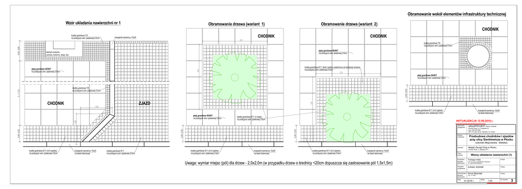 Obramowanie wokół elementów infrastruktury technicznej Wzór układania nawierzchni nr 1 Obramowanie drzewa (wariant 1) Obramowanie drzewa (wariant 2) CHODNIK kostka granitowa 7/9 na podsypce cem.-piaskowej 3-5cm CHODNIK krawężnik kamienny 15x25 CHODNIK kostka granitowa 7/9 na podsypce cem.-piaskowej 3-5cm płyty granitowe 50/50/7 na podsypce cem.-piaskowej 3-5cm element budynku (schody, kolumny, słupy, itp) kostka granitowa 9/11 (ilość rzędów uzależniona od lokalizacji drzewa) na podsypce cem.-piaskowej 3-5cm płyty granitowe 50/50/7 na podsypce cem.-piaskowej 3-5cm płyty granitowe 50/50/7 na podsypce cem.-piaskowej 3-5cm kostka granitowa 7/9 na podsypce cem.-piaskowej 3-5cm ZJAZD CHODNIK kostka granitowa 9/11 (4-5 rzędów) na podsypce cem.-piaskowej 3-5cm płyty granitowe 50/50/7 na podsypce cem.-piaskowej 3-5cm kostka granitowa 9/11 (3 rzędy) na podsypce cem.-piaskowej 3-5cm krawężnik kamienny 15x25 na ławie betonowej AKTUALIZACJA 12.09.2016 r. Jednostka projektowa Nazwa inwestycji eMJotPROJEKT Marcin Jóźwiak 09-402 Płock, ul. Traugutta 23 kom. 504 297 690 NIP 774-303-78-43 REGON 14112436 Przebudowa chodników i zjazdów przy ulicy Sienkiewicza w Płocku (odcinek Misjonarska - Bielska) Miejski Zarząd Dróg w Płocku Inwestor kostka granitowa 9/11 (4-5 rzędów) na podsypce cem.-piaskowej 3-5cm krawężnik kamienny 15x25 na ławie betonowej kostka granitowa 9/11 na podsypce cem.-piaskowej 3-5cm kostka granitowa 9/11 (4-5 rzędów) na podsypce cem.-piaskowej 3-5cm krawężnik kamienny 15x25 na ławie betonowej kostka granitowa 9/11 (4-5 rzędów) na podsypce cem.-piaskowej 3-5cm krawężnik kamienny 15x25 na ławie betonowej Uwaga: wymiar miejsc (pól) dla drzew - 2,0x2,0m (w przypadku drzew o średnicy <20cm dopuszcza się zastosowanie pól 1,5x1,5m) 09-400 Płock, ul. Bielska 9/11 Tytuł rysunku Wzory układania nawierzchni (1) Projektant Tomasz Holc BRANŻA DROGOWA upr. do proj. w specjalności drogowej nr LOD/0700/PWOD/07 Asystent projektanta Łukasz Jóźwiak Podpis Sprawdzający Anna Woźniak Podpis BRANŻA DROGOWA upr. nr 15/83 Data 01.2016 r. Skala Podpis 1:20 Nr rysunku 3