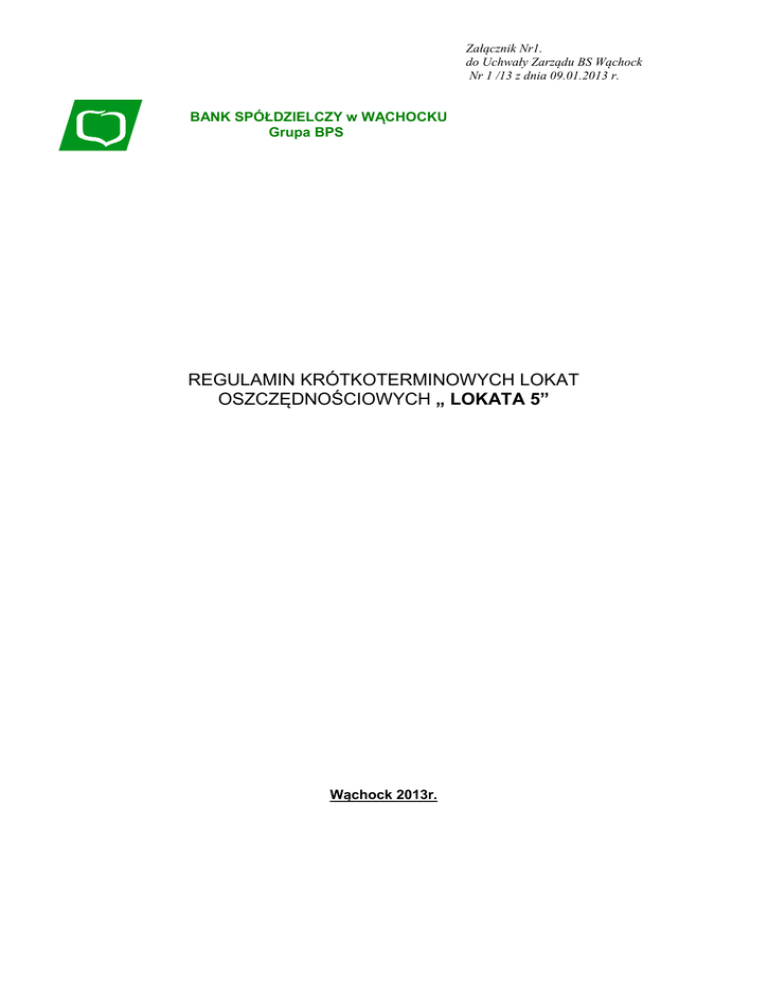 Załącznik Nr1. do Uchwały Zarządu BS Wąchock Nr 1 /13 z dnia 09.01.2013 r. , BANK SPÓŁDZIELCZY w WĄCHOCKU Grupa BPS REGULAMIN KRÓTKOTERMINOWYCH LOKAT OSZCZĘDNOŚCIOWYCH „ LOKATA 5” Wąchock 2013r. Rozdział 1. Postanowienia ogólne §1. Regulamin określa warunki, na jakich BS Wąchock. zwany dalej Bankiem prowadzi rachunki terminowych lokat oszczędnościowych „ LOKATA 5” zwanych dalej lokatami „ LOKATA 5” 1. W sprawach nieuregulowanych w niniejszym Regulaminie mają zastosowanie „Regulamin otwierania i prowadzenia rachunków bankowych dla osób fizycznych” oraz powszechnie obowiązujące przepisy prawa, w szczególności Kodeks cywilny i Prawo bankowe. §2. 1. Posiadaczami lokaty „Wiosenna” mogą być osoby fizyczne o pełnej zdolności do czynności prawnych będące rezydentami. 2. Bank nie dopuszcza możliwości otwarcia lokaty „ LOKATA 5” drogą korespondencyjną. Rozdział 2. Założenie lokaty „ LOKATA 5” §3. 1. Bank otwiera i prowadzi lokatę „ LOKATA 5” w ramach Umowy o prowadzenie rachunków bankowych w złotych. 2. Lokaty „ LOKATA 5” otwierane są i prowadzone w złotych. 3. Otwarcie rachunku lokaty „ LOKATA 5” następuje w jednostce organizacyjnej Banku w dniu wniesienia wpłaty, po podpisaniu przez osobę występującą o otwarcie lokaty „Wiosenna”, zwaną dalej Posiadaczem rachunku, 1. Posiadacz rachunku podpisuje oprócz Potwierdzenia otwarcia krótkoterminowej lokaty oszczędnościowej „ LOKATA 5” , Umowę terminowej lokaty oszczędnościowej. 2. Na lokacie mogą być deponowane wyłącznie nowe środki. Do nowych środków nie zalicza się środków pochodzących z likwidacji lokat. §4. 1. Bank otwiera lokaty „ LOKATA 5” na okresy umowne 6-miesięczne bez możliwości odnowienia na kolejny okres. Rozdział 3. Oprocentowanie §5. 1. Lokaty „ LOKATA 5” oprocentowane są według stałej stopy procentowej, określanej w stosunku rocznym. 2. Oprocentowanie lokaty wynosi 5% w stosunku rocznym. 3. Stawka oprocentowania dostępna jest w jednostkach organizacyjnych Banku oraz na stronie internetowej Banku www.bswachock.pl. 4. Minimalna kwota lokaty wynosi 2000 zł. 5. Łączna kwota i ilość lokat dla jednego klienta nieograniczona. 6. Lokaty zakładane są od dnia 15.01.2013r. do 30.03.2013r. §6. 1 Do obliczania należnych odsetek od środków pieniężnych zgromadzonych na rachunku lokaty „ LOKATA 5” przyjmuje się, że rok liczy 365 dni. Rozdział 4. Dysponowanie środkami §7. 1. Przyjmując środki na lokatę „ LOKATA 5” Bank zobowiązuje się wobec Klienta do przechowywania jego środków pieniężnych przez zadeklarowany okres i wypłacania mu odsetek na zasadach określonych w niniejszym Regulaminie i w Potwierdzeniu otwarcia lokaty. 2. W umownym okresie przechowywania środków na rachunku lokaty „ LOKATA 5” Bank nie przyjmuje wpłat uzupełniających i nie dokonuje częściowych wypłat. 3. Każda wypłata środków z lokaty „ LOKATA 5” w trakcie trwania okresu umownego stanowi naruszenie warunków prowadzenia lokaty i jej zerwanie. 4. Odsetki od lokaty„ LOKATA 5” są dopisane po upływie okresu umownego (6-m-cy). 5. Bank nie dopuszcza możliwości składania odrębnych dyspozycji co do odsetek i kapitału. 6. Kapitał wraz z odsetkami jest wypłacany po upływie okresu umownego lub w momencie likwidacji lokaty „ LOKATA 5” . 7. Kapitał wraz z odsetkami po upływie okresu umownego lub w przypadku wcześniejszej likwidacji lokaty „ LOKATA 5” zgodnie z dyspozycją Posiadacza rachunku może być przelany na wskazany rachunek bankowy lub wypłacony Posiadaczowi rachunku w gotówce. §8. Wierzytelności z lokaty „ LOKATA 5” nie podlegają cesji. Zarząd Banku Spółdzielczego w Wąchocku. 2