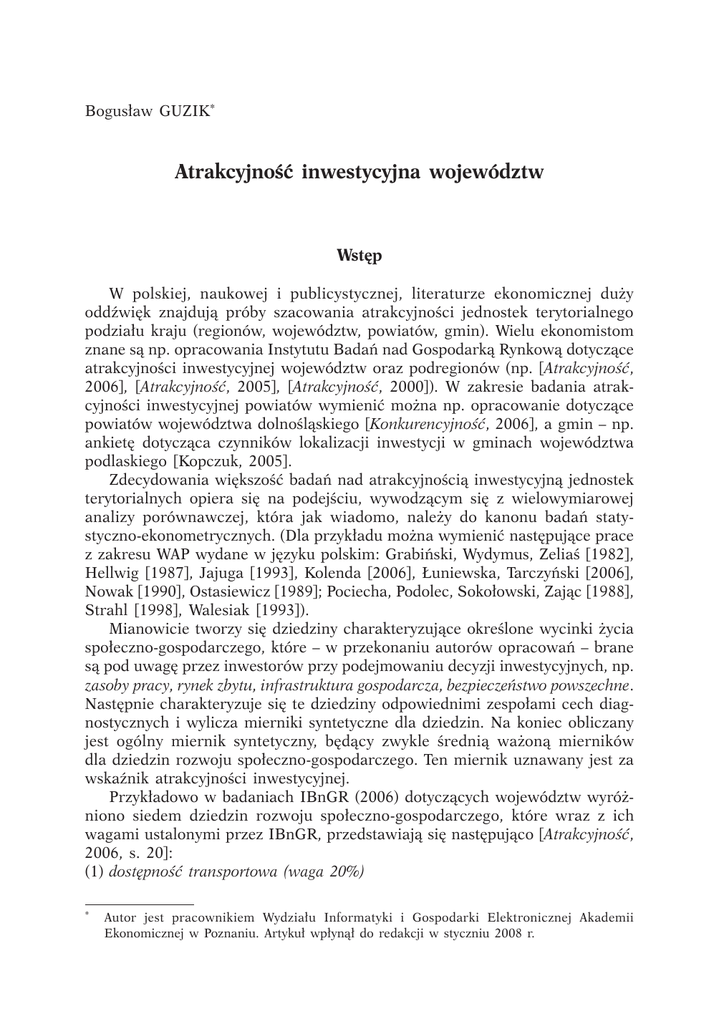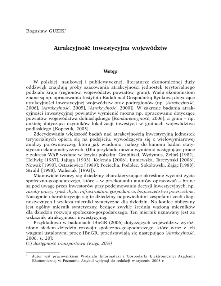 Bogusław Guzik* Atrakcyjność inwestycyjna województw Wstęp W polskiej, naukowej i publicystycznej, literaturze ekonomicznej duży oddźwięk znajdują próby szacowania atrakcyjności jednostek terytorialnego podziału kraju (regionów, województw, powiatów, gmin). Wielu ekonomistom znane są np. opracowania Instytutu Badań nad Gospodarką Rynkową dotyczące atrakcyjności inwestycyjnej województw oraz podregionów (np. [Atrakcyjność, 2006], [Atrakcyjność, 2005], [Atrakcyjność, 2000]). W zakresie badania atrakcyjności inwestycyjnej powiatów wymienić można np. opracowanie dotyczące powiatów województwa dolnośląskiego [Konkurencyjność, 2006], a gmin – np. ankietę dotycząca czynników lokalizacji inwestycji w gminach województwa podlaskiego [Kopczuk, 2005]. Zdecydowania większość badań nad atrakcyjnością inwestycyjną jednostek terytorialnych opiera się na podejściu, wywodzącym się z wielowymiarowej analizy porównawczej, która jak wiadomo, należy do kanonu badań statystyczno-ekonometrycznych. (Dla przykładu można wymienić następujące prace z zakresu WAP wydane w języku polskim: Grabiński, Wydymus, Zeliaś [1982], Hellwig [1987], Jajuga [1993], Kolenda [2006], Łuniewska, Tarczyński [2006], Nowak [1990], Ostasiewicz [1989]; Pociecha, Podolec, Sokołowski, Zając [1988], Strahl [1998], Walesiak [1993]). Mianowicie tworzy się dziedziny charakteryzujące określone wycinki życia społeczno-gospodarczego, które – w przekonaniu autorów opracowań – brane są pod uwagę przez inwestorów przy podejmowaniu decyzji inwestycyjnych, np. zasoby pracy, rynek zbytu, infrastruktura gospodarcza, bezpieczeństwo powszechne. Następnie charakteryzuje się te dziedziny odpowiednimi zespołami cech diagnostycznych i wylicza mierniki syntetyczne dla dziedzin. Na koniec obliczany jest ogólny miernik syntetyczny, będący zwykle średnią ważoną mierników dla dziedzin rozwoju społeczno-gospodarczego. Ten miernik uznawany jest za wskaźnik atrakcyjności inwestycyjnej. Przykładowo w badaniach IBnGR (2006) dotyczących województw wyróżniono siedem dziedzin rozwoju społeczno-gospodarczego, które wraz z ich wagami ustalonymi przez IBnGR, przedstawiają się następująco [Atrakcyjność, 2006, s. 20]: (1)dostępność transportowa (waga 20%) * Autor jest pracownikiem Wydziału Informatyki i Gospodarki Elektronicznej Akademii Ekonomicznej w Poznaniu. Artykuł wpłynął do redakcji w styczniu 2008 r. 40 GOSPODARKA NARODOWA Nr 3/2008 (2)wielkość i jakość zasobów pracy oraz koszty pracy (waga 25%), (3)chłonność rynku (waga 15%), (4)poziom rozwoju infrastruktury gospodarczej (waga 10%), (5)poziom rozwoju infrastruktury społecznej (waga 5%), (6) poziom bezpieczeństwa powszechnego (waga 5%), (7)aktywność województw wobec inwestorów (waga 20%). W badaniach Urzędu Statystycznego we Wrocławiu [Konkurencyjność, 2006] dotyczących atrakcyjności powiatów województwa dolnośląskiego wyróżniono cztery dziedziny: potencjał demograficzny, warunki życia, infrastruktura techniczna, aktywność gospodarcza. * * * Punktem wyjścia prezentowanego artykułu są następujące spostrzeżenia: • wyznaczane za pomocą metod wielowymiarowej analizy porównawczej mierniki dla województw przez wielu ekonomistów i dziennikarzy traktowane są jako obiektywne charakterystyki atrakcyjności inwestycyjnej poszczególnych jednostek terytorialnych, • takie podejście do szacowania atrakcyjności inwestycyjnej byłoby usprawiedliwione, gdyby nie było żadnych „naturalnych” symptomów tego, które jednostki terytorialne są bardziej, a które mniej atrakcyjne dla inwestorów, • tymczasem owe charakterystyki, i to w dodatku bardzo łatwo dostępne, bo zbierane przez statystykę powszechną, istnieją. Są to wielkości nakładów inwestycyjnych (na środki trwałe) inwestorów prywatnych. Stawiamy więc, co wydaje się oczywiste, tezę, że wszelkie wyliczenia tego, co na gruncie wielowymiarowej analizy porównawczej nazywane jest oceną atrakcyjności inwestycyjnej są jedynie wyobrażeniem modelowej („teoretycznej”) atrakcyjności inwestycyjnej. Empiryczną („prawdziwą”) atrakcyjność inwestycyjną jednostki terytorialnej charakteryzuje natomiast wielkość nakładów inwestycyjnych dokonanych na jej terenie. Podobny zresztą punkt widzenia, choć w nieco zawoalowanej formie, sugerujący, że „wynikowa ocena atrakcyjności inwestycyjnej dokonywana jest przez pryzmat wielkości poniesionych nakładów” prezentowany jest też w cytowanym opracowaniu IBnGR [Atrakcyjność, 2006, s. 13]. Podobnie jak w innych badaniach z zakresu atrakcyjności inwestycyjnej ograniczamy się do inwestorów prywatnych, gdyż to oni mają podejście rynkowe do inwestycji w środki trwałe. Inwestorzy publiczni na ogół ukierunkowani są na inne cele. Naturalnie, możliwa jest (i to wcale nie tak rzadko) sytuacja, że badacz twierdzi, iż „wie lepiej” co jest potrzebne inwestorowi, i że „prawdziwą” atrakcyjnością jest to, co obliczył stosując metody wielowymiarowej analizy porównawczej. Natomiast to, co poczynili inwestorzy inaczej niż to badacz określił, traktowane jest jako niedojrzałość inwestora. Bogusław Guzik, Atrakcyjność inwestycyjna województw 41 Cel i zakres pracy Przykładowe zagadnienia związane z badaniem atrakcyjności inwestycyjnej Na podstawie raportów o atrakcyjności inwestycyjnej (np. raportów IBnGR) dysponować można informacjami o poziomie rozwoju dziedzin życia społeczno‑gospodarczego oraz o mierniku syntetycznym zwanym wskaźnikiem atrakcyjności inwestycyjnej. Z kolei na podstawie statystyki masowej dysponujemy informacjami o autentycznych nakładach inwestycyjnych. Konfrontując oba rodzaje informacji można próbować rozwiązać, na przykład, następujące problemy: 1. czy opracowany na gruncie wielowymiarowej analizy porównawczej ogólny wskaźnik atrakcyjności inwestycyjnej (miernik syntet