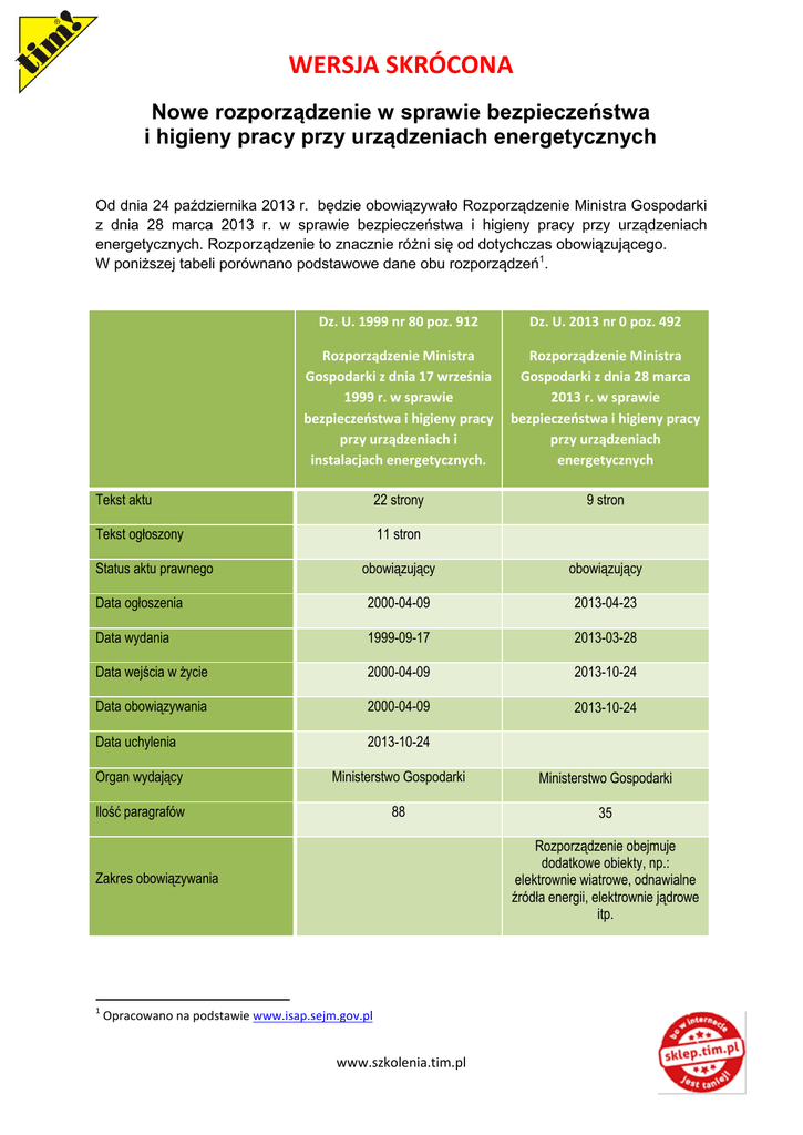 WERSJA SKRÓCONA Nowe rozporządzenie w sprawie bezpieczeństwa i higieny pracy przy urządzeniach energetycznych Od dnia 24 października 2013 r. będzie obowiązywało Rozporządzenie Ministra Gospodarki z dnia 28 marca 2013 r. w sprawie bezpieczeństwa i higieny pracy przy urządzeniach energetycznych. Rozporządzenie to znacznie różni się od dotychczas obowiązującego. W poniższej tabeli porównano podstawowe dane obu rozporządzeń1. Dz. U. 1999 nr 80 poz. 912 Dz. U. 2013 nr 0 poz. 492 Rozporządzenie Ministra Gospodarki z dnia 17 września 1999 r. w sprawie bezpieczeństwa i higieny pracy przy urządzeniach i instalacjach energetycznych. Rozporządzenie Ministra Gospodarki z dnia 28 marca 2013 r. w sprawie bezpieczeństwa i higieny pracy przy urządzeniach energetycznych Tekst aktu 22 strony 9 stron Tekst ogłoszony 11 stron Status aktu prawnego obowiązujący obowiązujący Data ogłoszenia 2000-04-09 2013-04-23 Data wydania 1999-09-17 2013-03-28 Data wejścia w życie 2000-04-09 2013-10-24 Data obowiązywania 2000-04-09 2013-10-24 Data uchylenia 2013-10-24 Organ wydający Ministerstwo Gospodarki Ministerstwo Gospodarki Ilość paragrafów 88 35 Rozporządzenie obejmuje dodatkowe obiekty, np.: elektrownie wiatrowe, odnawialne źródła energii, elektrownie jądrowe itp. Zakres obowiązywania 1 Opracowano na podstawie www.isap.sejm.gov.pl www.szkolenia.tim.pl WERSJA SKRÓCONA Z bardzo pobieżnego porównania wynika, że nowe rozporządzenie normalizuje znacznie szerszy zakres zagadnień, zawierając ponad dwukrotnie mniej paragrafów i stron tekstu (w porównywalnym formacie). Jak to jest możliwe? Po zapoznaniu się z treścią rozporządzenia stwierdzimy, że dzieje się tak, ponieważ nowe rozporządzenie nakłada obowiązek zorganizowania bezpiecznej pracy na prowadzącego eksploatację i opracowania dotychczas niewystępujących instrukcji. Rozporządzenie określa tylko wymagania, jakie powinny zostać spełnione przy bezpiecznej eksploatacji, natomiast zorganizowanie eksploatacji powierza prowadzącemu eksploatację, podając wymagania i definicje, które znajdują się w Prawie Energetycznym i wydanych na jego podstawie rozporządzeniach, Prawie Budowlanym, Prawie Atomowym, Kodeksie Pracy, Rozporządzeniu o ogólnych warunkach bhp, itp. Definicje i określenia występujące w powoływanych aktach prawnych znacznie różnią się od występujących w dotychczas obowiązującym rozporządzeniu, które wprowadza definicję „prowadzący eksploatację”. Dotychczas obowiązujące rozporządzenie kompleksowo normalizuje zasady organizacji bezpiecznej pracy przy urządzeniach i instalacjach energetycznych. Na szkoleniu: porównamy dotychczas obowiązujące rozporządzenie o bhp przy urządzeniach i instalacjach energetycznych z rozporządzeniem, które będzie obowiązywało od 24 października 2013 r., wskażemy znaczne różnice w rozporządzeniach, przybliżymy nowe określenia i definicje występujące w rozporządzeniu oraz aktach prawnych, na które się powołuje, przedstawimy trudne zadania, jakie na prowadzącego eksploatację nakłada nowe rozporządzenie w zakresie: - organizacji eksploatacji, - opracowania nowych instrukcji eksploatacji, - terminowych zabiegów eksploatacyjnych, - zorganizowania bezpiecznej pracy przy urządzeniach energetycznych. Do dnia 24 października 2013 r. prowadzący eksploatację musi się przygotować do wdrożenia Rozporządzenia Ministra Gospodarki z dnia 28 marca 2013 r. w sprawie bezpieczeństwa i higieny pracy przy urządzeniach energetycznych, wprowadzającego znaczne zmiany w stosunku do dotychczas obowiązującego rozporządzenia. www.szkolenia.tim.pl