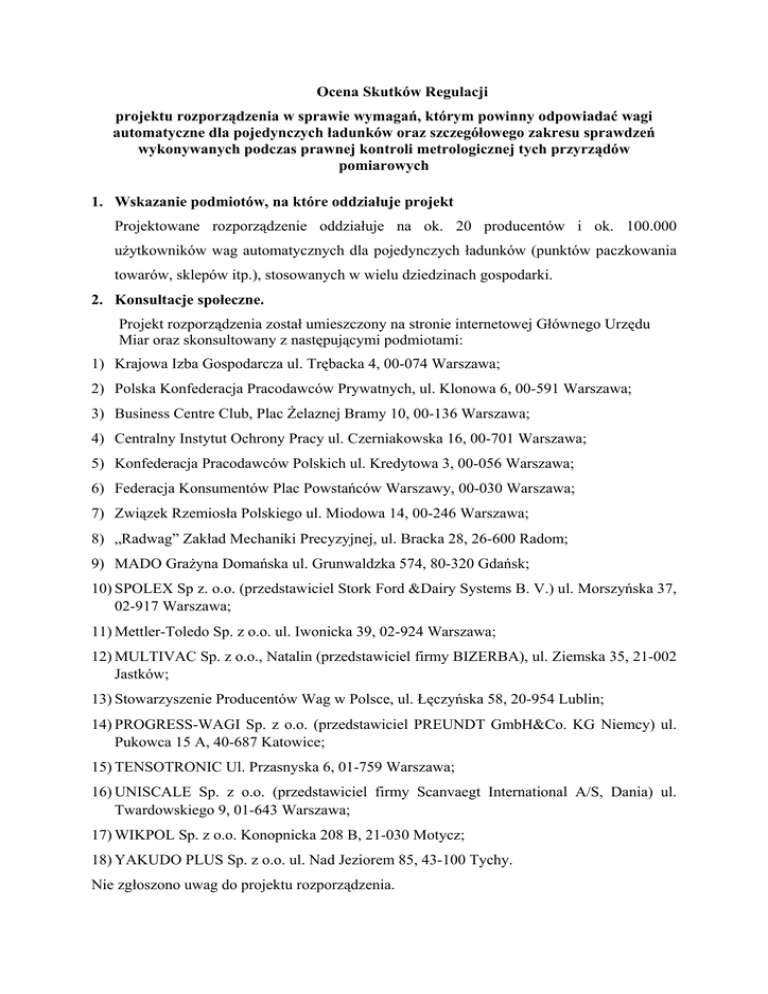 Ocena Skutków Regulacji projektu rozporządzenia w sprawie wymagań, którym powinny odpowiadać wagi automatyczne dla pojedynczych ładunków oraz szczegółowego zakresu sprawdzeń wykonywanych podczas prawnej kontroli metrologicznej tych przyrządów pomiarowych 1. Wskazanie podmiotów, na które oddziałuje projekt Projektowane rozporządzenie oddziałuje na ok. 20 producentów i ok. 100.000 użytkowników wag automatycznych dla pojedynczych ładunków (punktów paczkowania towarów, sklepów itp.), stosowanych w wielu dziedzinach gospodarki. 2. Konsultacje społeczne. Projekt rozporządzenia został umieszczony na stronie internetowej Głównego Urzędu Miar oraz skonsultowany z następującymi podmiotami: 1) Krajowa Izba Gospodarcza ul. Trębacka 4, 00-074 Warszawa; 2) Polska Konfederacja Pracodawców Prywatnych, ul. Klonowa 6, 00-591 Warszawa; 3) Business Centre Club, Plac Żelaznej Bramy 10, 00-136 Warszawa; 4) Centralny Instytut Ochrony Pracy ul. Czerniakowska 16, 00-701 Warszawa; 5) Konfederacja Pracodawców Polskich ul. Kredytowa 3, 00-056 Warszawa; 6) Federacja Konsumentów Plac Powstańców Warszawy, 00-030 Warszawa; 7) Związek Rzemiosła Polskiego ul. Miodowa 14, 00-246 Warszawa; 8) „Radwag” Zakład Mechaniki Precyzyjnej, ul. Bracka 28, 26-600 Radom; 9) MADO Grażyna Domańska ul. Grunwaldzka 574, 80-320 Gdańsk; 10) SPOLEX Sp z. o.o. (przedstawiciel Stork Ford &Dairy Systems B. V.) ul. Morszyńska 37, 02-917 Warszawa; 11) Mettler-Toledo Sp. z o.o. ul. Iwonicka 39, 02-924 Warszawa; 12) MULTIVAC Sp. z o.o., Natalin (przedstawiciel firmy BIZERBA), ul. Ziemska 35, 21-002 Jastków; 13) Stowarzyszenie Producentów Wag w Polsce, ul. Łęczyńska 58, 20-954 Lublin; 14) PROGRESS-WAGI Sp. z o.o. (przedstawiciel PREUNDT GmbH&Co. KG Niemcy) ul. Pukowca 15 A, 40-687 Katowice; 15) TENSOTRONIC Ul. Przasnyska 6, 01-759 Warszawa; 16) UNISCALE Sp. z o.o. (przedstawiciel firmy Scanvaegt International A/S, Dania) ul. Twardowskiego 9, 01-643 Warszawa; 17) WIKPOL Sp. z o.o. Konopnicka 208 B, 21-030 Motycz; 18) YAKUDO PLUS Sp. z o.o. ul. Nad Jeziorem 85, 43-100 Tychy. Nie zgłoszono uwag do projektu rozporządzenia. 3. Wpływ rozporządzenia na dochody i wydatki sektora finansów publicznych. Wejście w życie rozporządzenia nie będzie miało wpływu na wydatki i dochody sektora finansów publicznych, w szczególności na dochody i wydatki budżetu państwa i budżetów jednostek samorządu terytorialnego. 4. Wpływ rozporządzenia na rynek pracy. Wejście w życie rozporządzenia nie spowoduje bezpośrednich skutków związanych z rynkiem pracy. 5. Wpływ rozporządzenia na konkurencyjność gospodarki i przedsiębiorczość, w tym na funkcjonowanie przedsiębiorstw. Wejście rozporządzenia nie będzie miało wpływu na konkurencyjność gospodarki i przedsiębiorczość. 6. Wpływ rozporządzenia na sytuację i rozwój regionalny. Nie przewiduje się wpływu projektowanego rozporządzenia na sytuację i rozwój regionalny.