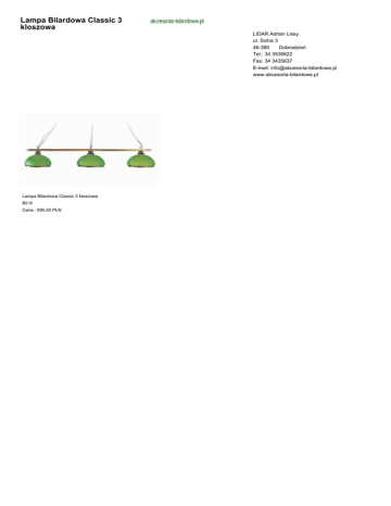 Lampa Bilardowa Classic 3 kloszowa LIDAR Adrian Lissy ul. Solna 3 46-380 Dobrodzień Tel.: 34 3536622 Fax: 34 3435637 E-mail: [email protected] www.akcesoria-bilardowe.pl Lampa Bilardowa Classic 3 kloszowa Bil III Cena : 895.50 PLN