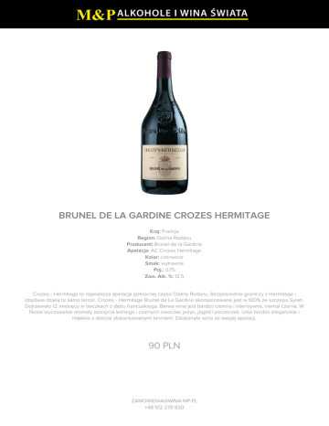 BRUNEL DE LA GARDINE CROZES HERMITAGE Kraj: Francja Region: Dolina Rodanu Producent: Brunel de la Gardine Apelacja: AC Crozes Hermitage Kolor: czerwone Smak: wytrawne Poj.: 0,75 Zaw. Alk. %: 12,5 Crozes - Hermitage to największa apelacja północnej części Doliny Rodanu. Bezpośrednio graniczy z Hermitage i obydwie dzielą to samo terroir. Crozes - Hermitage Brunel de La Gardine skomponowane jest w 100% ze szczepu Syrah. Dojrzewało 12 miesięcy w beczkach z dębu francuskiego. Barwa wina jest bardzo ciemna i intensywna, niemal czarna. W Nosie wyczuwalne aromaty poszycia leśnego i czarnych owoców: jeżyn, jagód i porzeczek. Usta bardzo eleganckie i miękkie z dobrze zbalansowanymi taninami. Doskonałe wino ze swojej apelacji. 90 PLN [email protected] +48 512 270 830
