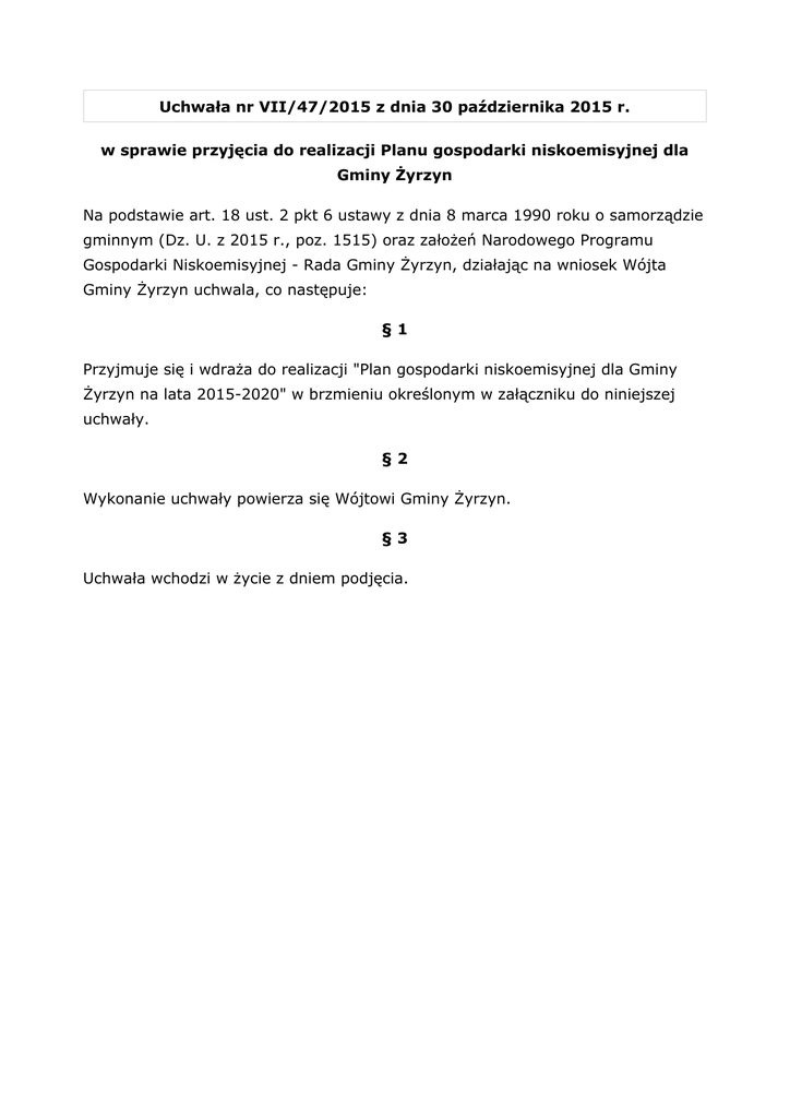 Uchwała nr VII/47/2015 z dnia 30 października 2015 r. w sprawie przyjęcia do realizacji Planu gospodarki niskoemisyjnej dla Gminy Żyrzyn Na podstawie art. 18 ust. 2 pkt 6 ustawy z dnia 8 marca 1990 roku o samorządzie gminnym (Dz. U. z 2015 r., poz. 1515) oraz założeń Narodowego Programu Gospodarki Niskoemisyjnej - Rada Gminy Żyrzyn, działając na wniosek Wójta Gminy Żyrzyn uchwala, co następuje: §1 Przyjmuje się i wdraża do realizacji "Plan gospodarki niskoemisyjnej dla Gminy Żyrzyn na lata 2015-2020" w brzmieniu określonym w załączniku do niniejszej uchwały. §2 Wykonanie uchwały powierza się Wójtowi Gminy Żyrzyn. §3 Uchwała wchodzi w życie z dniem podjęcia. PLAN GOSPODARKI NISKOEMISYJNEJ DLA GMINY ŻYRZYN NA LATA 2015 – 2020 Wykonawca: Wschodnia Grupa Doradcza Lublin, 2015 Spis treści str. 1. Streszczenie ................................................................................................................................................... 5 2.1. Wprowadzenie ........................................................................................................................................ 7 2.2. Cel opracowania ..................................................................................................................................... 7 2.3. Zakres opracowania ................................................................................................................................ 8 2.4. Uwarunkowania międzynarodowe, krajowe, regionalne i lokalne ......................................................... 8 3. Charakterystyka gminy Żyrzyn .................................................................................................................... 14 3.1. Podział administracyjny i położenie ..................................................................................................... 14 3.2. Warunki demograficzne........................................................................................................................ 15 3.3. Infrastruktura społeczna i techniczna ................................................................................................... 15 3.4. Rolnictwo i działalność gospodarcza.................................................................................................... 17 3.5. Warunki środowiskowe ........................................................................................................................ 18 3.6. Identyfikacja problemów w zakresie niskiej emisji w gminie Żyrzyn ................................................. 19 3.7. Dotychczasowe działania w zakresie likwidacji emisji ........................................................................ 21 4. Wyniki bazowej inwentaryzacji emisji dwutlenku węgla i innych gazów .................................................... 23 4.1 Założenia metodyczne do przygotowania planu gospodarki niskoemisyjnej (PGN) ............................ 23 4.2. Źródła emisji na terenie Gminy Żyrzyn ................................................................................................ 24 4.3. Emisja powierzchniowa w Gminie Żyrzyn ......................................................................................... 25 4.4. Emisja liniowa ( z transportu) w Gminie Żyrzyn ................................................................................. 30 4.5. Emisja z wykorzystania energii elektrycznej........................................................................................ 34 4.6. Struktura zużycia energii finalnej i emisji CO2 .................................................................................... 35 5. Działania i środki zaplanowane na cały okres objęty planem ..................................................................... 36 5.1. Zakres działań na szczeblu gminy ........................................................................................................ 38 1 5.2. Termomodernizacja budynków stanowiących własność gminy ........................................................... 38 5.3. Wykorzystanie energii słonecznej do produkcji energii elektrycznej .................................................. 38 5.4. Wykorzystanie energii słonecznej do produkcji energii cieplnej ......................................................... 41 5.5. Kotły na biomasę (pelet)....................................................................................................................... 43 5.6. Transport i ciągniki rolnicze ................................................................................................................. 43 5.7. Wymiana oświetlenia ulicznego ........................................................................................................... 44 5.8. Działania krótkoterminowe ................................................................................................................. 44 5.9. Efekty działań na rzecz ograniczania emisji ......................................................................................... 45 6. Aspekty organizacyjne i finansowe.............................................................................................................. 48 6.1. Zasoby techniczne i organizacyjne ....................................................................................................... 48 6.2. Zasoby ludzkie i doświadczenie ........................................................................................................... 49 6.3. Budżet i źródła finansowania................................................................................................................ 49 6.4. Stosowanie systemu tzw. zielonych zamówień publicznych................................................................ 50 6.5. Harmonogram zadaniowo-czasowy...................................................................................................... 50 7. Monitori
