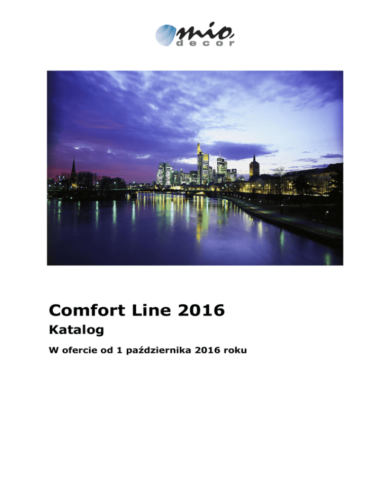 Comfort Line 2016 Katalog W ofercie od 1 października 2016 roku KARNISZE ELEKTRYCZNE Comfort System Karnisze elektryczne Comfort System to gwarancja cichej pracy na poziomie 30 dB, praktycznie nieograniczonej funkcjonalności dzięki wielu opcjom sterowania oraz atrakcyjnej ceny. Nasze zalety: - karnisze o długości do 6m (możliwość indywidualnej wyceny karniszy o dł. do 18 m), maksymalne obciążenie do 90 kg, cicha praca (30 dB), miękki start & miękki stop, łatwy montaż do sufitu lub ściany, nie wymaga ustawienia położeń krańcowych, - nie wymaga późniejszej konserwacji. KARNISZE ELEKTRYCZNE Comfort System Sterowanie: - przewodowe 230V, radiowe, DCT (bezpotencjałowe), RS 485, funkcja Touch motion (ruch przez pociągnięcie zasłony), - z systemów inteligentnego budynku, - w przypadku braku prądu istnieje możliwość ręcznego przesuwu zasłony. Silnik 5 żyłowy - sterowanie AC 100-240V: Silnik 5 żyłowy Żyły: - przewodowe --- neutralny - DCT --- faza - RS 485 --- faza kierunkowa 1 - Radiowe --- faza kierunkowa 2 - Touch motion --- uziemienie Wymiarowanie: Na długości toru należy przewidzieć ok. 1,5cm dystansu od silnika do przeciwległej ściany z każdej strony. Szerokość wnęki na pojedynczy karnisz mocowany do sufitu wynosi 9cm, na podwójny 18cm. KARNISZE ELEKTRYCZNE Comfort System Wymiarowanie – szyna pojedyncza: Wymiarowanie – szyna podwójna: Ilość miejsca zajmowana przez zasłonę po jednej stronie: - przesuw jednostronny: dł. karnisza [m] x 14 + 27cm - przesuw centralny: dł. karnisza[m] x 7 + 27cm KARNISZE ELEKTRYCZNE Comfort System Dane techniczne: Napięcie zasilania 100-240V AC 50-60Hz Model CS 90 Stopień ochrony IP 20 Moc 80 W Maksymalny uciąg 90 kg Typ przewodu zasilającego H05 VVF Średnica przewodu 5x 1mm Maksymalna długość przewodu do zasilania bezpotencjałowego Ruch przez pociągnięcie (Touch motion) Obsługa ręczna Soft start & Soft stop Poziom hałasu Prędkość Certyfikaty 30 m TAK TAK TAK & TAK 30 dB 14 cm/s CE KARNISZE ELEKTRYCZNE Comfort System Programowanie karniszy Comfort System: 1) Przypisanie pilota do napędu: Przytrzymaj PRZYCISK PROGRAMOWANIA w dolnej części napędu przez 1 sekundę – dioda LED wolno miga na czerwono. Przyciśnij przycisk GÓRA na pilocie – dioda LED miga na niebiesko. ZAPROGRAMOWANO 2) Zmiana kierunku obrotów silnika: Przytrzymaj przycisk STOP na pilocie przez 5 sekund – dioda napędu wolno miga na czerwono Puść i ponownie przyciśnij STOP – dioda LED miga na niebiesko. ZMIENIONO KIERUNEK OBROTÓW SILNIKA 3) Programowanie dodatkowego punktu zatrzymania – pozycja komfortowa My: Przytrzymaj jednocześnie przyciski GÓRA i DÓŁ na pilocie przez 1 sekundę – dioda LED miga na niebiesko. USTAWIONO POZYCJĘ KOMFORTOWĄ 4) Usuwanie dodatkowego punktu zatrzymania – pozycji komfortowej My: Przytrzymaj jednocześnie przyciski GÓRA i DÓŁ na pilocie przez 5 sekund – dioda LED miga na niebiesko. USUNIĘTO POZYCJĘ KOMFORTOWĄ 5) Przypisanie dodatkowego pilota/kanału Przytrzymaj przycisk STOP na pilocie przez 5 sekund – dioda napędu wolno miga na czerwono Przyciśnij przycisk GÓRA na nowym pilocie lub na dotychczasowym po wybraniu nowego kanału – dioda LED miga na niebiesko. ZAPROGRAMOWANO NOWY PILOT/ KANAŁ KARNISZE ELEKTRYCZNE Comfort System 6) Usuwanie zaprogramowanego kanału Przytrzymaj przycisk STOP na pilocie przez 5 sekund – dioda napędu wolno miga na czerwono. Przyciśnij przycisk DÓŁ – dioda LED miga na niebiesko. USUNIĘTO KANAŁ 7) Przywrócenie ustawień fabrycznych Przytrzymaj przez 5 sekund PRZYCISK PROGRAMOWANIA w dolnej części napędu – dioda LED miga na czerwono. Puść i ponownie przytrzymaj przez 1 sekundę PRZYCISK PROGRAMOWANIA w dolnej części napędu – dioda LED miga na niebiesko. PRZYWRÓCONO USTAWIENIA FABRYCZNE 8) Aktywacja Touch Motion P przytrzymaj przez 7 sekund PRZYCISK PROGRAMOWANIA w dolnej części napędu – dioda LED mignie na czerwono, następnie na niebiesko. ZAPROGRAMOWANO FUNKCJĘ TOUCH MOTION