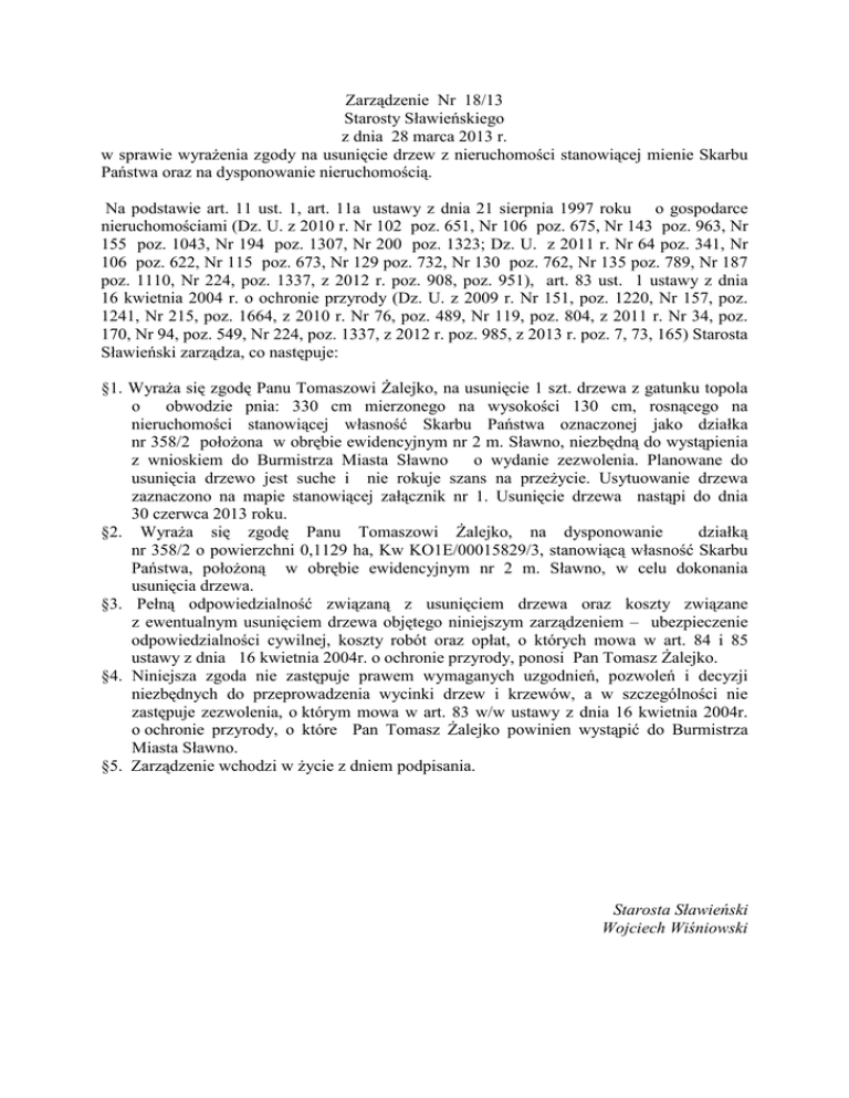 Zarządzenie Nr 18/13 Starosty Sławieńskiego z dnia 28 marca 2013 r. w sprawie wyrażenia zgody na usunięcie drzew z nieruchomości stanowiącej mienie Skarbu Państwa oraz na dysponowanie nieruchomością. Na podstawie art. 11 ust. 1, art. 11a ustawy z dnia 21 sierpnia 1997 roku o gospodarce nieruchomościami (Dz. U. z 2010 r. Nr 102 poz. 651, Nr 106 poz. 675, Nr 143 poz. 963, Nr 155 poz. 1043, Nr 194 poz. 1307, Nr 200 poz. 1323; Dz. U. z 2011 r. Nr 64 poz. 341, Nr 106 poz. 622, Nr 115 poz. 673, Nr 129 poz. 732, Nr 130 poz. 762, Nr 135 poz. 789, Nr 187 poz. 1110, Nr 224, poz. 1337, z 2012 r. poz. 908, poz. 951), art. 83 ust. 1 ustawy z dnia 16 kwietnia 2004 r. o ochronie przyrody (Dz. U. z 2009 r. Nr 151, poz. 1220, Nr 157, poz. 1241, Nr 215, poz. 1664, z 2010 r. Nr 76, poz. 489, Nr 119, poz. 804, z 2011 r. Nr 34, poz. 170, Nr 94, poz. 549, Nr 224, poz. 1337, z 2012 r. poz. 985, z 2013 r. poz. 7, 73, 165) Starosta Sławieński zarządza, co następuje: §1. Wyraża się zgodę Panu Tomaszowi Żalejko, na usunięcie 1 szt. drzewa z gatunku topola o obwodzie pnia: 330 cm mierzonego na wysokości 130 cm, rosnącego na nieruchomości stanowiącej własność Skarbu Państwa oznaczonej jako działka nr 358/2 położona w obrębie ewidencyjnym nr 2 m. Sławno, niezbędną do wystąpienia z wnioskiem do Burmistrza Miasta Sławno o wydanie zezwolenia. Planowane do usunięcia drzewo jest suche i nie rokuje szans na przeżycie. Usytuowanie drzewa zaznaczono na mapie stanowiącej załącznik nr 1. Usunięcie drzewa nastąpi do dnia 30 czerwca 2013 roku. §2. Wyraża się zgodę Panu Tomaszowi Żalejko, na dysponowanie działką nr 358/2 o powierzchni 0,1129 ha, Kw KO1E/00015829/3, stanowiącą własność Skarbu Państwa, położoną w obrębie ewidencyjnym nr 2 m. Sławno, w celu dokonania usunięcia drzewa. §3. Pełną odpowiedzialność związaną z usunięciem drzewa oraz koszty związane z ewentualnym usunięciem drzewa objętego niniejszym zarządzeniem – ubezpieczenie odpowiedzialności cywilnej, koszty robót oraz opłat, o których mowa w art. 84 i 85 ustawy z dnia 16 kwietnia 2004r. o ochronie przyrody, ponosi Pan Tomasz Żalejko. §4. Niniejsza zgoda nie zastępuje prawem wymaganych uzgodnień, pozwoleń i decyzji niezbędnych do przeprowadzenia wycinki drzew i krzewów, a w szczególności nie zastępuje zezwolenia, o którym mowa w art. 83 w/w ustawy z dnia 16 kwietnia 2004r. o ochronie przyrody, o które Pan Tomasz Żalejko powinien wystąpić do Burmistrza Miasta Sławno. §5. Zarządzenie wchodzi w życie z dniem podpisania. Starosta Sławieński Wojciech Wiśniowski UZASADNIENIE do Zarządzenia Nr 1813 Starosty Sławieńskiego z dnia 28 marca 2013 r. w sprawie wyrażenia zgody na usunięcie drzew z nieruchomości stanowiącej mienie Skarbu Państwa oraz na dysponowanie nieruchomością. . Pan Tomasz Żalejko zamieszkały ul. Armii Krajowej 5/2, 76-100 Sławno, wystąpił z wnioskiem o wydanie zgody właścicielskiej na usunięcie suchego drzewa z gatunku topola rosnącego na nieruchomości stanowiącej własność Skarbu Państwa oznaczonej jako działka nr 358/2 o powierzchni 0,1129 ha, Kw KO1E/00015829/3, położoną w obrębie ewidencyjnym nr 2 m. Sławno. Zgodnie z art. 83 ust.1 w/w ustawy z dnia 16 kwietnia 2004r. o ochronie przyrody usunięcie drzew lub krzewów z terenu nieruchomości może nastąpić po uzyskaniu zezwolenia wydanego przez wójta burmistrza albo prezydenta na wniosek posiadacza nieruchomości. Jeżeli posiadacz nie jest właścicielem nieruchomości do wniosku ma obowiązek dołączyć zgodę właściciela. W myśl art. 84 w/w ustawy posiadacz ponosi opłaty za usunięcie drzew lub krzewów. Opłaty nalicza i pobiera organ właściwy do wydania zezwolenia na usuniecie drzew i krzewów w wydanym zezwoleniu według stawek określonych zgodnie z art. 85. Zgoda właścicielska ma charakter warunkowy i obowiązuje tylko w przypadku gdy Burmistrza Miasta Sławno uzna wniosek za uzasadniony i wyda stosowne zezwolenia na wycinkę ustalając ewentualne opłaty.