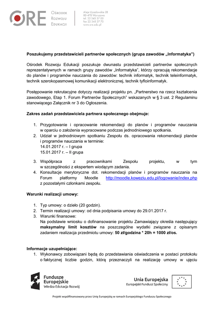Poszukujemy przedstawicieli partnerów społecznych (grupa zawodów „Informatyka”) Ośrodek Rozwoju Edukacji poszukuje dwunastu przedstawicieli partnerów społecznych reprezentatywnych w ramach grupy zawodów „Informatyka”, którzy opracują rekomendacje do planów i programów nauczania do zawodów: technik informatyk, technik teleinformatyk, technik szerokopasmowej komunikacji elektronicznej, technik tyfloinformatyk. Postępowanie rekrutacyjne dotyczy realizacji projektu pn. „Partnerstwo na rzecz kształcenia zawodowego, Etap 1. Forum Partnerów Społecznych” wskazanych w § 3 ust. 2 Regulaminu stanowiącego Załącznik nr 3 do Ogłoszenia. Zakres zadań przedstawiciela partnera społecznego obejmuje: 1. Przygotowanie i opracowanie rekomendacji do planów i programów nauczania w oparciu o założenia wypracowane podczas jednodniowego spotkania. 2. Udział w jednodniowym spotkaniu Zespołu ds. opracowania rekomendacji planów i programów nauczania w terminie: 14.01.2017 r. – I grupa 15.01.2017 r. – II grupa 3. Współpraca z pracownikami Zespołu projektu, w tym w szczególności z ekspertem wiodącym zadania. 4. Konsultacje merytoryczne dot. rekomendacji planów i programów nauczania na Forum platformy Moodle http://moodle.koweziu.edu.pl/logowanie/index.php z pozostałymi członkami zespołu. Warunki realizacji umowy: 1. Typ umowy: o dzieło (20 godzin). 2. Termin realizacji umowy: od dnia podpisania umowy do 29.01.2017 r. 3. Warunki finansowe: Na podstawie wniosku o dofinansowanie projektu Zamawiający określa następujący maksymalny limit kosztów na poszczególne wydatki związane z opisanym zadaniem realizacja przedmiotu umowy: 50 zł/godzina * 20h = 1000 zł/os. Informacje uzupełniające: 1. Wykonawcy zobowiązani będą do przedstawiania oświadczenia w postaci protokołu o faktycznej liczbie godzin, którą przeznaczyli na realizację umowy w ujęciu Projekt współfinansowany przez Unię Europejską w ramach Europejskiego Funduszu Społecznego miesięcznym oraz poświadczą, że łączna miesięczna liczba godzin zadań realizowanych w ramach wszystkich projektów finansowanych z funduszy strukturalnych i Funduszu Spójności oraz zadań finansowanych z innych źródeł, obejmujących okres realizacji umowy zawartej z ORE nie przekracza łącznie 276 godzin miesięcznie. Jednocześnie wykonawca będzie zobowiązany do złożenia oświadczenia, że obciążenie zawodowe nie wyklucza możliwości prawidłowej i efektywnej realizacji wszystkich zadań powierzonych mu w ramach projektu. 2. W ramach spotkań określonych w pkt 3 Zakresu zadań przedstawiciela partnera społecznego, Zamawiający zapewnia i finansuje nocleg przed spotkaniem oraz wyżywienie w trakcie spotkania. Uczestnikom spotkania zwracane są koszty podróży uczestnikom spotkania (do 200 zł - zgodnie z cennikiem biletów II klasy). 3. Spotkanie BZPS odbywać się będą w weekendy. Zamawiający zastrzega sobie możliwość zmiany terminów spotkań (zgodnie z harmonogramem realizacji zadań). Zamawiający zastrzega sobie możliwość niewyłonienia Wykonawców bez podania przyczyny. Wymagania stawiane Wykonawcy Wymagania obowiązkowe (oceniane: spełnia/ nie spełnia): 1. Min. 3-letnie doświadczenie zawodowe w wybranym/ych zawodzie/zawodach w ramach grupy zawodów „Informatyka”. 2. Wykształcenie adekwatne do wybranego/ych zawodu/zawodów zadeklarowanego/ych w ramach grupy zawodów „Informatyka”. 3. Rekomendacja co najmniej jednego partnera społecznego, reprezentatywnego dla wybranego/ych zawodu/zawodów w ramach grupy zawodowej „Informatyka”. 4. Średnie miesięczne zaangażowanie w realizację zadań we wszystkich projektach finansowanych z funduszy strukturalnych i Funduszu Spójności oraz z zadań finansowanych z innych źródeł (w tym umowa o pracę, umowy zlecenie, umowy o dzieło, działalność gospodarcza) nieprzekraczające 240 godzin. Kryteria oceny wyboru najkorzystniejszej oferty: 1. Oferent może zdobyć maksymalnie 50 punktów. Projekt współfinansowany przez Unię Europejską w ramach Europejskiego Funduszu Społecznego 2. W ramach oceny kompetencje i doświadczenia oferent może uzyskać maksymalnie 40 punktów – kryteria wraz z punktacją zostały podane w formularzu zgłoszeniowym (Załącznik nr 1). Punktacja w zakresie kompetencji i doświadczenia stanowi sumę punktów uzyskanych przez kandydata w części 3 formularza zgłoszeniowego. 3. Zaproponowana cena, za którą można uzyskać maks. 10 pkt: - 10 pkt otrzyma oferta z najniższą ceną, wobec której pozostałe oferty będą porównywane; - cena winna być wyrażona w złotych polskich, zaokrąglona do dwóch miejsc po przecinku zgodnie z zasadami rachunkowymi; - wykonawca może podać tylko jedną cenę – bez proponowania rozwiązań wariantowych. 4. Przyjęty algorytm obliczania ceny: Cena – wzór obliczenia punktów: 𝑃= 𝐶𝑛 ∗ 10 𝑝𝑘𝑡 𝐶𝑏 P – liczba punktów przyznanych badanej ofercie w zakresie ceny Cn – najniższa cena spośród badanych ofert Cb – cena oferty badanej P= Cn Za najkorzystniejszą Zamawiający uzna tę ofertę, która po zsumowaniu obu kryteriów uzyska największą liczbę punktów. W pierwszej kolejności dokonana zostanie ocena formalna. Oferty niespełniające wymogów obowiązkowych nie będą poddawane dalszej ocenie. Minimum punktowe konieczne do uzyskania w kryterium doświadczenie i kompetencje oferenta wynosi 7 punktów. Oferty, które nie spełnią minimum nie będą podlegały dalszej ocenie w kryterium „Zaproponowana cena”. Ponadto w kryteriach wskazane zostały obszary, w których oferent powinien uzyskać minimalną liczbę punktów, nieuzyskanie minimum w co najmniej jednym z ww. obszarów powoduje, że oferta taka nie będzie podlegała dalszej ocenie. Projekt współfinansowany przez Unię Europejską w ramach Europejskiego Funduszu Społecznego Warunki zmiany umowy Zamawiający zastrzega możliwość zmiany treści umow