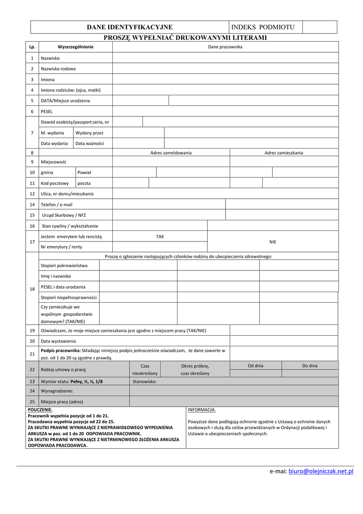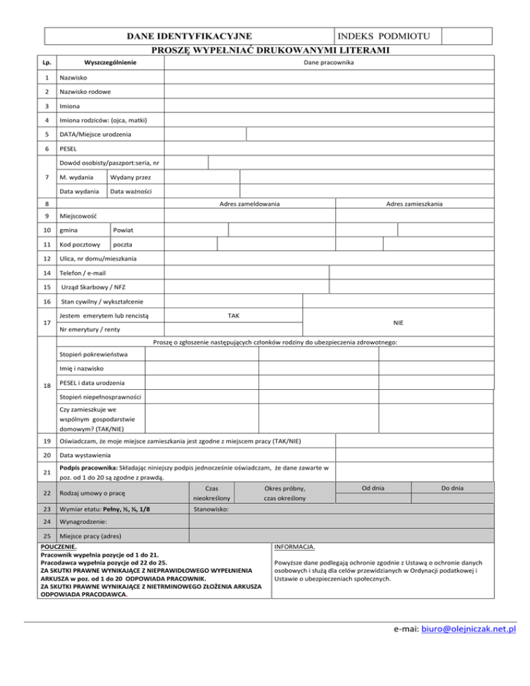 INDEKS PODMIOTU DANE IDENTYFIKACYJNE PROSZĘ WYPEŁNIAĆ DRUKOWANYMI LITERAMI Lp. Wyszczególnienie 1 Nazwisko 2 Nazwisko rodowe 3 Imiona 4 Imiona rodziców: (ojca, matki) 5 DATA/Miejsce urodzenia 6 PESEL Dane pracownika Dowód osobisty/paszport:seria, nr 7 M. wydania Wydany przez Data wydania Data ważności 8 Adres zameldowania 9 Miejscowość 10 gmina Powiat 11 Kod pocztowy poczta 12 Ulica, nr domu/mieszkania 14 Telefon / e-mail 15 Urząd Skarbowy / NFZ 16 Stan cywilny / wykształcenie Jestem emerytem lub rencistą Adres zamieszkania TAK 17 NIE Nr emerytury / renty Proszę o zgłoszenie następujących członków rodziny do ubezpieczenia zdrowotnego: Stopień pokrewieństwa Imię i nazwisko 18 PESEL i data urodzenia Stopień niepełnosprawności Czy zamieszkuje we wspólnym gospodarstwie domowym? (TAK/NIE) 19 Oświadczam, że moje miejsce zamieszkania jest zgodne z miejscem pracy (TAK/NIE) 20 Data wystawienia 21 Podpis pracownika: Składając niniejszy podpis jednocześnie oświadczam, że dane zawarte w poz. od 1 do 20 są zgodne z prawdą. 22 Rodzaj umowy o pracę Czas nieokreślony 23 Wymiar etatu: Pełny, ½, ¼, 1/8 Stanowisko: 24 Wynagrodzenie: 25 Miejsce pracy (adres) POUCZENIE. Pracownik wypełnia pozycje od 1 do 21. Pracodawca wypełnia pozycje od 22 do 25. ZA SKUTKI PRAWNE WYNIKAJĄCE Z NIEPRAWIDŁOWEGO WYPEŁNIENIA ARKUSZA w poz. od 1 do 20 ODPOWIADA PRACOWNIK. ZA SKUTKI PRAWNE WYNIKAJĄCE Z NIETRMINOWEGO ZŁOŻENIA ARKUSZA ODPOWIADA PRACODAWCA. Okres próbny, czas określony Od dnia Do dnia INFORMACJA. Powyższe dane podlegają ochronie zgodnie z Ustawą o ochronie danych osobowych i służą dla celów przewidzianych w Ordynacji podatkowej i Ustawie o ubezpieczeniach społecznych. e-mai: [email protected]
