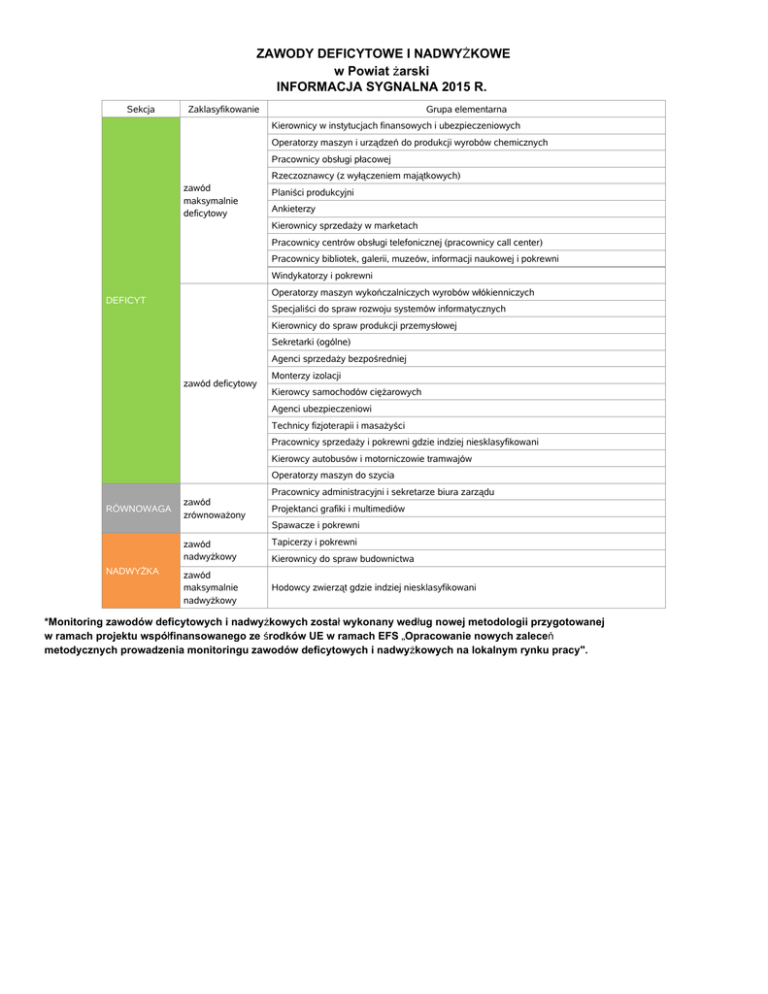 ZAWODY DEFICYTOWE I NADWYŻKOWE w Powiat żarski INFORMACJA SYGNALNA 2015 R. Sekcja Zaklasyfikowanie Grupa elementarna Kierownicy w instytucjach finansowych i ubezpieczeniowych Operatorzy maszyn i urządzeń do produkcji wyrobów chemicznych Pracownicy obsługi płacowej zawód maksymalnie deficytowy Rzeczoznawcy (z wyłączeniem majątkowych) Planiści produkcyjni Ankieterzy Kierownicy sprzedaży w marketach Pracownicy centrów obsługi telefonicznej (pracownicy call center) Pracownicy bibliotek, galerii, muzeów, informacji naukowej i pokrewni Windykatorzy i pokrewni Operatorzy maszyn wykończalniczych wyrobów włókienniczych DEFICYT Specjaliści do spraw rozwoju systemów informatycznych Kierownicy do spraw produkcji przemysłowej Sekretarki (ogólne) Agenci sprzedaży bezpośredniej zawód deficytowy Monterzy izolacji Kierowcy samochodów ciężarowych Agenci ubezpieczeniowi Technicy fizjoterapii i masażyści Pracownicy sprzedaży i pokrewni gdzie indziej niesklasyfikowani Kierowcy autobusów i motorniczowie tramwajów Operatorzy maszyn do szycia RÓWNOWAGA zawód zrównoważony zawód nadwyżkowy NADWYŻKA zawód maksymalnie nadwyżkowy Pracownicy administracyjni i sekretarze biura zarządu Projektanci grafiki i multimediów Spawacze i pokrewni Tapicerzy i pokrewni Kierownicy do spraw budownictwa Hodowcy zwierząt gdzie indziej niesklasyfikowani *Monitoring zawodów deficytowych i nadwyżkowych został wykonany według nowej metodologii przygotowanej w ramach projektu współfinansowanego ze środków UE w ramach EFS „Opracowanie nowych zaleceń metodycznych prowadzenia monitoringu zawodów deficytowych i nadwyżkowych na lokalnym rynku pracy".