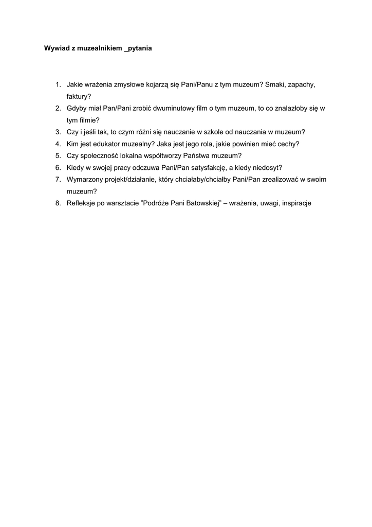 Wywiad z muzealnikiem _pytania 1. Jakie wrażenia zmysłowe kojarzą się Pani/Panu z tym muzeum? Smaki, zapachy, faktury? 2. Gdyby miał Pan/Pani zrobić dwuminutowy film o tym muzeum, to co znalazłoby się w tym filmie? 3. Czy i jeśli tak, to czym różni się nauczanie w szkole od nauczania w muzeum? 4. Kim jest edukator muzealny? Jaka jest jego rola, jakie powinien mieć cechy? 5. Czy społeczność lokalna współtworzy Państwa muzeum? 6. Kiedy w swojej pracy odczuwa Pani/Pan satysfakcję, a kiedy niedosyt? 7. Wymarzony projekt/działanie, który chciałaby/chciałby Pani/Pan zrealizować w swoim muzeum? 8. Refleksje po warsztacie ”Podróże Pani Batowskiej” – wrażenia, uwagi, inspiracje