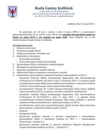 Rada Gminy Jedlińsk ul. Warecka 19, 26-660 Jedlińsk powiat radomski, województwo mazowieckie tel. 48 32 13 089, email: [email protected] Jedlińsk, dnia 11 maja 2015 r. Na podstawie art. 20 ust. 1 ustawy z dnia 8 marca 1990 r. o samorządzie gminnym (tekst jedn. Dz. U. z 2013 r. poz. 594 ze zm.) zwołuję VII sesję Rady Gminy na dzień 22 maja 2015 r. (tj. piątek) na godz. 9:00. Sesja odbędzie się w sali konferencyjnej Urzędu Gminy w Jedlińsku. Porządek obrad sesji: 1. Otwarcie obrad sesji 2. Przyjęcie porządku obrad 3. Przyjęcie protokołu z ostatniej sesji 4. Komunikaty i informacje: Przewodniczącej Rady Przewodniczących stałych komisji Rady 5. Sprawozdanie Wójta z działalności międzysesyjnej 6. Wystąpienia zaproszonych gości 7. Zapytania, interpelacje i wnioski radnych 8. Odpowiedzi Wójta na zapytania, interpelacje i wnioski 9. Rozpatrzenie sprawozdania z wykonania budżetu Gminy Jedlińsk za 2014 r.: odczytanie Uchwały Składu Orzekającego Regionalnej Izby Obrachunkowej w Warszawie Nr Ra.0031.142.2015 z dnia 17 kwietnia 2015 r. w sprawie opinii o przedłożonym przez Wójta Gminy Jedlińsk sprawozdania z wykonania budżetu za 2014r. wraz z informacją o stanie mienia komunalnego przedstawienie Uchwały Nr 1/2015 Komisji Rewizyjnej Rady Gminy Jedlińsk z dnia 24 kwietnia 2015 r. w sprawie wniosku o udzielenie absolutorium odczytanie uchwały Składu Orzekającego Regionalnej Izby Obrachunkowej w Warszawie Nr Ra.175.2015 z dnia 11 maja 2015 r. w sprawie opinii o przedłożonym wniosku Komisji Rewizyjnej Rady Gminy Jedlińsk w sprawie udzielenia Wójtowi absolutorium z wykonania budżetu za 2014 r. przedstawienie opinii przez przewodniczących stałych komisji Rady dotyczącej sprawozdania z wykonania budżetu gminy z 2014 r. dyskusja wystąpienie Wójta głosowanie projektu uchwały w sprawie rozpatrzenia i zatwierdzenia sprawozdania Wójta z wykonania budżetu za 2014 r. i sprawozdania finansowego – projekt nr 1 głosowanie projektu uchwały w sprawie udzielenia Wójtowi absolutorium z tytułu wykonania budżetu za 2014 r. – projekt nr 2 Rada Gminy Jedlińsk ul. Warecka 19, 26-660 Jedlińsk powiat radomski, województwo mazowieckie tel. 48 32 13 089, email: [email protected] 10. Podjęcie uchwał w sprawie: a) wprowadzenia zmiany w Wieloletniej Prognozie Finansowej Gminy Jedlińsk na lata 2015–2019 – projekt nr 3 b) wprowadzenie zmian w budżecie Gminy na 2015 rok – projekt nr 4 c) zatwierdzenia rocznego sprawozdania finansowego za 2014 r. zakładu opieki zdrowotnej – projekt nr 5 d) zatwierdzenia rocznego sprawozdania finansowego za 2014 r. instytucji kultury – projekt nr 6 e) nadania imienia PSP w Bierwcach – projekt nr 7 f) zatwierdzenia Regulaminu Pracy Rady Społecznej Samodzielnego Publicznego Zakładu Opieki Zdrowotnej w Jedlińsku – projekt nr 8 g) uzupełnienia składu osobowego Komisji Rewizyjnej – projekt nr 9 h) wprowadzenia zmian w regulaminie wspierania edukacji uzdolnionych dzieci i młodzieży z placówek oświatowych prowadzonych przez Gminę Jedlińsk zatwierdzonego Uchwałą Rady Gminy Jedlińsk Nr XXV/31/2013 z dnia 30 września 2013 r. – projekt nr 10 i) zmian w Programie opieki nad zwierzętami bezdomnymi oraz zapobiegania bezdomności zwierząt – projekt nr 11 j) przyjęcia Gminnego Programu Promocji Zdrowia Psychicznego Gminy Jedlińsk na rok 2015 – projekt nr 12 k) przystąpienia do sporządzenia zmian studium uwarunkowań i kierunków zagospodarowania przestrzennego gminy Jedlińsk – projekt nr 13 l) przystąpienia do sporządzenia miejscowego planu zagospodarowania przestrzennego dla obszarów rolniczej i leśnej przestrzeni produkcyjnej w granicach sołectw: Romanów, Urbanów, Zawady Nowe, Gutów, Ludwików, Mokrosęk, Narty, Płasków, Bierwce, Górna Wola, Nowa Wola i Jedlanka – projekt nr 14 (mapy-załączniki graficzne do projektu uchwały nr 14 do wglądu w Biurze Rady) 10. Przyjęcie sprawozdania z realizacji zadań i budżetu na pomoc społeczną w 2014 roku 11. Przyjęcie sprawozdania z realizacji Programu współpracy Gminy Jedlińsk z organizacjami pozarządowymi oraz innymi podmiotami prowadzącymi działalność pożytku publicznego na lata 2011–2015 za rok 2014 12. Sprawy różne 13. Zamknięcie VII sesji Rady Gminy Jedlińsk Przewodnicząca Rady (-) Aneta Żurowska