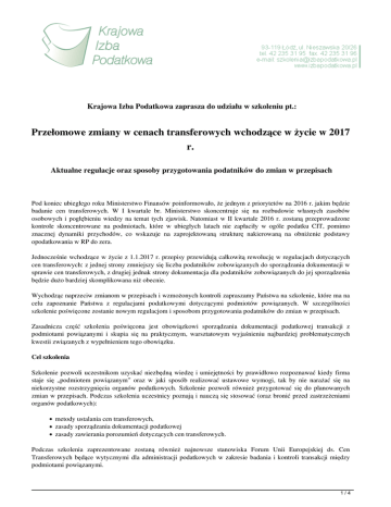 Krajowa Izba Podatkowa zaprasza do udziału w szkoleniu pt.: Przełomowe zmiany w cenach transferowych wchodzące w życie w 2017 r. Aktualne regulacje oraz sposoby przygotowania podatników do zmian w przepisach Pod koniec ubiegłego roku Ministerstwo Finansów poinformowało, że jednym z priorytetów na 2016 r. jakim będzie badanie cen transferowych. W I kwartale br. Ministerstwo skoncentruje się na rozbudowie własnych zasobów osobowych i pogłębieniu wiedzy na temat tych zjawisk. Natomiast w II kwartale 2016 r. zostaną przeprowadzone kontrole skoncentrowane na podmiotach, które w ubiegłych latach nie zapłaciły w ogóle podatku CIT, pomimo znacznej dynamiki przychodów, co wskazuje na zaprojektowaną strukturę nakierowaną na obniżenie podstawy opodatkowania w RP do zera. Jednocześnie wchodzące w życie z 1.1.2017 r. przepisy przewidują całkowitą rewolucję w regulacjach dotyczących cen transferowych: z jednej strony zmniejszy się liczba podatników zobowiązanych do sporządzania dokumentacji w sprawie cen transferowych, z drugiej jednak strony dokumentacja dla podatników zobowiązanych do jej sporządzenia będzie dużo bardziej skomplikowana niż obecnie. Wychodząc naprzeciw zmianom w przepisach i wzmożonych kontroli zapraszamy Państwa na szkolenie, które ma na celu zapoznanie Państwa z regulacjami podatkowymi dotyczącymi podmiotów powiązanych. W szczególności szkolenie poświęcone zostanie nowym regulacjom i sposobom przygotowania podatników do zmian w przepisach. Zasadnicza część szkolenia poświęcona jest obowiązkowi sporządzania dokumentacji podatkowej transakcji z podmiotami powiązanymi i skupia się na praktycznym, warsztatowym wyjaśnieniu najbardziej problematycznych kwestii związanych z wypełnieniem tego obowiązku. Cel szkolenia Szkolenie pozwoli uczestnikom uzyskać niezbędną wiedzę i umiejętności by prawidłowo rozpoznawać kiedy firma staje się „podmiotem powiązanym” oraz w jaki sposób realizować ustawowe wymogi, tak by nie narażać się na niekorzystne rozstrzygnięcia organów podatkowych. Szkolenie pozwoli również przygotować się do planowanych zmian w przepisach. Podczas szkolenia uczestnicy poznają i nauczą się stosować (oraz bronić przed zastrzeżeniami organów podatkowych): metody ustalania cen transferowych, zasady sporządzania dokumentacji podatkowej zasady zawierania porozumień dotyczących cen transferowych. Podczas szkolenia zaprezentowane zostaną również najnowsze stanowiska Forum Unii Europejskiej ds. Cen Transferowych będące wytycznymi dla administracji podatkowych w zakresie badania i kontroli transakcji między podmiotami powiązanymi. 1/4 Szczegółowo omówione zostaną również najnowsze przepisy w zakresie obowiązków związanych z problematyką cen transerowych. Adresaci szkolenia Szkolenie adresujemy do właścicieli i pracowników firm, które są (lub mogą być) podmiotami powiązanymi, właścicieli i pracowników biur rachunkowych, doradców podatkowych, pracowników organów podatkowych. Miejsce szkolenia: Hotel CLUB 2 CV, ul. Piastowska 1 - Koszalin Godzina szkolenia: 09:00 Data szkolenia: 08.04.2016 Program szkolenia obejmuje następujące zagadnienia: 1. Podmioty powiązane Podmioty powiązane na gruncie polskich przepisów podatkowych (rozszerzenie definicji od 1 stycznia 2015 r.) Pojęcie podmiotów powiązanych w prawie międzynarodowym - regulacje OECD i umów o unikaniu podwójnego opodatkowania w zakresie podmiotów powiązanych Wymiana z podmiotami mającymi siedzibę w „rajach podatkowych”. Pojęcie „zagranicznego zakładu” w umowach o unikaniu podwójnego opodatkowania, zasady ustalania zysków „zakładu” 2. Opodatkowanie zysków zagranicznej spółki kontrolowanej (CFC) – regulacje obowiązujące od 1.1.2015. 3. Metody szacowania cen transferowych Metoda porównywalnej ceny niekontrolowanej Metoda ceny odsprzedaży Metoda rozsądnej marży (koszt plus) Metody zysku transakcyjnego Szczególne zasady dotyczące ustalania wartości rynkowej dóbr niematerialnych i usług Uprawnienia organów podatkowych w zakresie szacowania cen 4. Zawieranie porozumień w sprawach ustalania cen transakcyjnych Rodzaje porozumień Dokumenty załączane do wniosku Postępowanie w sprawie porozumienia Decyzja w sprawie porozumienia 5. Obowiązujące od 18 lipca 2013 r. regulacje rozporządzeń w sprawie cen transferowych Obowiązek dokonywania analizy porównywalności transakcji przez organy podatkowe Ustalanie cen i dokumentowanie „usług o niskiej wartości dodanej” 2/4 Ocena warunków restrukturyzacji przedsiębiorstw 6. Dokumentacja podatkowa w zakresie cen transferowych Podmioty zobowiązane do sporządzenia dokumentacji – zmiany obowiązujące od 1 stycznia 2015 r. Funkcje jakie spełniać będą podmioty uczestniczące w transakcji Koszty związane z transakcją Metody i sposób kalkulacji ceny i zysków Strategia gospodarcza Inne czynniki majace wpływ na transakcję Oczekiwane korzysci w zakreie usług niematerialnych załączniki do dokumentacji 7. Zmiany w zakresie dokumentacji w sprawie cen transferowych wchodzące w życie od 2017 r. Nowy katalog podmiotów zobowiązanych do tworzenia dokumentacji Zakres obowiązków dokumentacyjnych w zależności od wielkości podmiotu: Dokumentacja podstawowa Analiza porównawcza Dokumentacja „master-file” Sprawozdania dołaczane do zeznań podatkowych „Country by country report” – obowiązujący od 2016 r. 8. Sankcje wynikające z niedopełnienia obowiązków w zakresie dokumentacji podatkowej Nieuznanie części kosztów 50% podatek dochodowy Sankcje związane z korektą podatku VAT Odpowiedzialność karna skarbowa Cena szkolenia obejmuje: zajęcia dydaktyczne, materiały szkoleniowe przygotowane przez eksperta, dyplom ukończenia szkolenia, lunch, serwis kawowy. Rezerwacja wg kolejności zgłoszeń. Ilość miejsc ograniczona. W celu zgłoszenia udziału w szkoleniu należy wypełnić formularz
