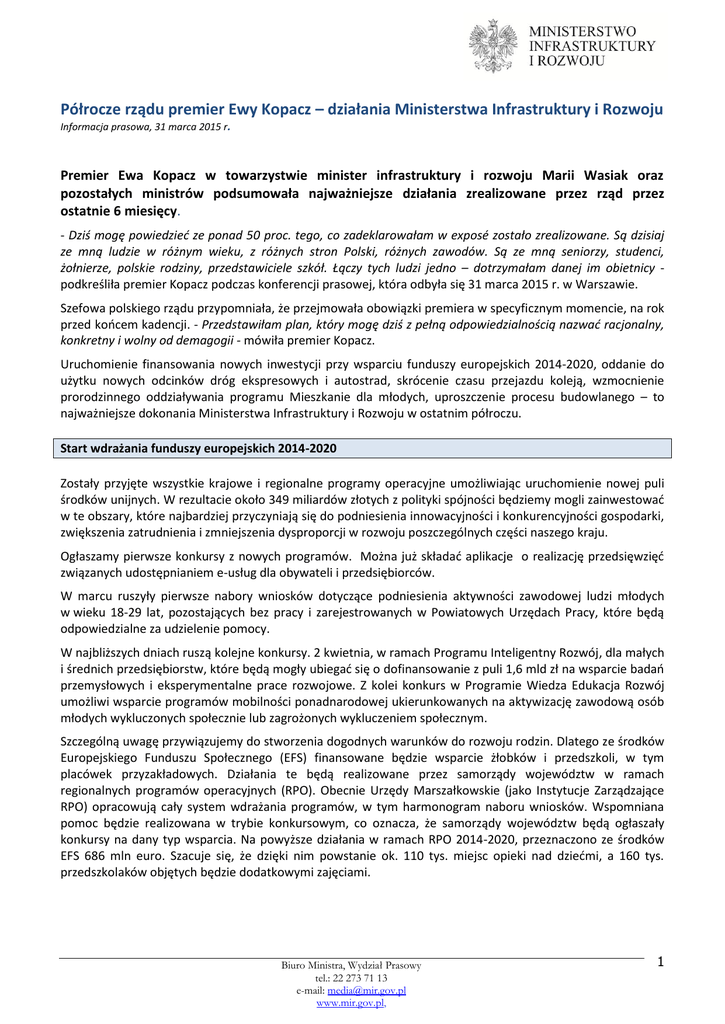 Półrocze rządu premier Ewy Kopacz – działania Ministerstwa Infrastruktury i Rozwoju Informacja prasowa, 31 marca 2015 r. Premier Ewa Kopacz w towarzystwie minister infrastruktury i rozwoju Marii Wasiak oraz pozostałych ministrów podsumowała najważniejsze działania zrealizowane przez rząd przez ostatnie 6 miesięcy. - Dziś mogę powiedzieć ze ponad 50 proc. tego, co zadeklarowałam w exposé zostało zrealizowane. Są dzisiaj ze mną ludzie w różnym wieku, z różnych stron Polski, różnych zawodów. Są ze mną seniorzy, studenci, żołnierze, polskie rodziny, przedstawiciele szkół. Łączy tych ludzi jedno – dotrzymałam danej im obietnicy podkreśliła premier Kopacz podczas konferencji prasowej, która odbyła się 31 marca 2015 r. w Warszawie. Szefowa polskiego rządu przypomniała, że przejmowała obowiązki premiera w specyficznym momencie, na rok przed końcem kadencji. - Przedstawiłam plan, który mogę dziś z pełną odpowiedzialnością nazwać racjonalny, konkretny i wolny od demagogii - mówiła premier Kopacz. Uruchomienie finansowania nowych inwestycji przy wsparciu funduszy europejskich 2014-2020, oddanie do użytku nowych odcinków dróg ekspresowych i autostrad, skrócenie czasu przejazdu koleją, wzmocnienie prorodzinnego oddziaływania programu Mieszkanie dla młodych, uproszczenie procesu budowlanego – to najważniejsze dokonania Ministerstwa Infrastruktury i Rozwoju w ostatnim półroczu. Start wdrażania funduszy europejskich 2014-2020 Zostały przyjęte wszystkie krajowe i regionalne programy operacyjne umożliwiając uruchomienie nowej puli środków unijnych. W rezultacie około 349 miliardów złotych z polityki spójności będziemy mogli zainwestować w te obszary, które najbardziej przyczyniają się do podniesienia innowacyjności i konkurencyjności gospodarki, zwiększenia zatrudnienia i zmniejszenia dysproporcji w rozwoju poszczególnych części naszego kraju. Ogłaszamy pierwsze konkursy z nowych programów. Można już składać aplikacje o realizację przedsięwzięć związanych udostępnianiem e-usług dla obywateli i przedsiębiorców. W marcu ruszyły pierwsze nabory wniosków dotyczące podniesienia aktywności zawodowej ludzi młodych w wieku 18-29 lat, pozostających bez pracy i zarejestrowanych w Powiatowych Urzędach Pracy, które będą odpowiedzialne za udzielenie pomocy. W najbliższych dniach ruszą kolejne konkursy. 2 kwietnia, w ramach Programu Inteligentny Rozwój, dla małych i średnich przedsiębiorstw, które będą mogły ubiegać się o dofinansowanie z puli 1,6 mld zł na wsparcie badań przemysłowych i eksperymentalne prace rozwojowe. Z kolei konkurs w Programie Wiedza Edukacja Rozwój umożliwi wsparcie programów mobilności ponadnarodowej ukierunkowanych na aktywizację zawodową osób młodych wykluczonych społecznie lub zagrożonych wykluczeniem społecznym. Szczególną uwagę przywiązujemy do stworzenia dogodnych warunków do rozwoju rodzin. Dlatego ze środków Europejskiego Funduszu Społecznego (EFS) finansowane będzie wsparcie żłobków i przedszkoli, w tym placówek przyzakładowych. Działania te będą realizowane przez samorządy województw w ramach regionalnych programów operacyjnych (RPO). Obecnie Urzędy Marszałkowskie (jako Instytucje Zarządzające RPO) opracowują cały system wdrażania programów, w tym harmonogram naboru wniosków. Wspomniana pomoc będzie realizowana w trybie konkursowym, co oznacza, że samorządy województw będą ogłaszały konkursy na dany typ wsparcia. Na powyższe działania w ramach RPO 2014-2020, przeznaczono ze środków EFS 686 mln euro. Szacuje się, że dzięki nim powstanie ok. 110 tys. miejsc opieki nad dziećmi, a 160 tys. przedszkolaków objętych będzie dodatkowymi zajęciami. Biuro Ministra, Wydział Prasowy tel.: 22 273 71 13 e-mail: [email protected] www.mir.gov.pl, 1 Coraz lepsze polskie drogi Od 1 października 2014 r. oddaliśmy do ruchu niemal 200 km dróg krajowych, w tym: ok. 35 km autostrad, ok. 129 km dróg ekspresowych oraz ok. 36 km pozostałych dróg krajowych. To więcej o 39 km (2 inwestycje oddane przed terminem: S8 Sieradz - Łask i S11 zachodnia obwodnica Poznania) niż zakładały zapowiedzi z expose. Sieć autostrad i dróg ekspresowych w Polsce przekroczyła 3000 km. Kierowcy mają do dyspozycji ponad 1550 km autostrad i 1470 km dróg ekspresowych. W ciągu ostatnich 7 lat nastąpił prawdziwy skok cywilizacyjny, długość dróg szybkiego ruchu wydłużyła się trzykrotnie. Zgodnie z zapowiedzią z expose, kierowcy mogą już korzystać z drogi ekspresowej S-8 na całym odcinku pomiędzy Wrocławiem a Łodzią. Ministerstwo Infrastruktury i Rozwoju przygotowało największy do tej pory program inwestycji drogowych w Polsce. Nowy Program Budowy Dróg Krajowych na lata 2014-2023 zakłada realizację inwestycji o wartości 93 mld zł. Podstawowym celem jest dokończenie sieci dróg w Polsce i takie skomunikowanie głównych miast, aby czas przejazdu między nimi skrócił się o co najmniej 15 proc. Wybudowanych zostanie ok. 1800 km nowych odcinków dróg ekspresowych i autostrad oraz 35 obwodnic, niezwykle ważnych z punktu widzenia ekonomicznego i społecznego. Obecnie trwają prace nad przeprowadzeniem strategicznej oceny oddziaływania na środowisko do projektu. Według najnowszego raportu Komisji Europejskiej polskie drogi stały się w ostatnich latach bezpieczniejsze, dzięki czemu Polska awansowała o trzy pozycje w rankingu bezpieczeństwa na drogach państw europejskich. Komfortowa i szybka podróż pociągami Nowy tabor, modernizacja infrastruktury, remont dworców kolejowych – to zmiany, które sukcesywnie poprawiają standard obsługi pasażerów. Dokonana już modernizacja linii kolejowych pozwoliła na uzyskanie rekordowo krótkich przejazdów pociągów z Warszawy do Wrocławia, Trójmiasta, Krakowa, Katowic. Po polskich torach jeżdżą już nowoczesne pociągi Pendolino, a czasy przejazdów 