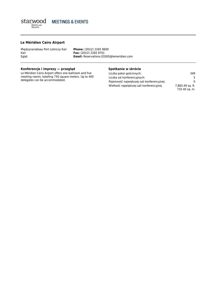 Le Méridien Cairo Airport Międzynarodowy Port Lotniczy Kair Kair Egipt Phone: (20)(2) 2265 9600 Fax: (20)(2) 2265 9701 Email: [email protected] Konferencje i imprezy — przegląd Spotkania w skrócie Le Méridien Cairo Airport offers one ballroom and five meeting rooms, totalling 730 square meters. Up to 400 delegates can be accommodated. Liczba pokoi gościnnych: Liczba sal konferencyjnych: Pojemność największej sali konferencyjnej: Wielkość największej sali konferencyjnej 349 5 0 7,883.49 sq. ft. 732.40 sq. m. Le Méridien Cairo Airport Międzynarodowy Port Lotniczy Kair Kair Egipt Phone: (20)(2) 2265 9600 Fax: (20)(2) 2265 9701 Email: [email protected] Specyfikacja szczegółowa Nieruchomości Typ obiektu Airport Liczba sal konferencyjnych 5 Rok budowy 2013 Całkowita wielkość sal konferencyjnych 0.00 sq. m. 0.00 sq. ft. Liczba budynków 1 Wielkość największej sali konferencyjnej 732.40 sq. m. 7,883.49 sq. ft. Liczba pięter 5 Pojemność najmniejszej sali konferencyjnej 0.00 sq. m. 0.00 sq. ft. Pokoje gościnne Data zameldowania 3:00 PM Internet w pokoju Wireless High Speed Internet Access in All Guest Rooms Data wymeldowania 12:00 PM Liczba pokoi gościnnych 349 Udogodnienia Centrum odnowy biologicznej / Centrum Fitness Fitness Center Nazwa basenu Heated Outdoor Pool Basen Yes Lokalne & atrakcje Strefa czasowa E Pobliskie lotniska Cairo International Airport Kod lotniska CAI Odległość od lotniska 0.10 Kilometers 0.06 Miles Obszar lokalny Le Méridien offers the opportunity to discover unique cultural experiences both within the hotel as well as across the local community. Le Méridien is dedicated to providing these experiences as well as recommending the most enriching art, musical, fashion and design events that the destination has to offer. Environmental Practices Energy & Water Conservation: • High-efficiency lighting in guestrooms • High-efficiency lighting in public areas • Water conserving fixtures • Smart irrigation practices • Regular preventive maintenance • Make A Green Choice program rewards guests for choosing to conserve natural resources in their guest room Waste Minimization & Environmentally Responsible Purchasing: • Recycling • Dumpster monitoring • Organic waste composting • Elimination of styrofoam packaging • Environmentally preferred suppliers • Environmentally preferred products • Amenity management • Sustainable food and beverage options Enhanced Indoor Environmental Quality: • Green Housekeeping • Integrated pest management practices • Low-emitting materials, such as paints, flooring and furniture Raising Awareness: • Property-level Green Council • Sustainable Meetings Practices Opłaty & podatki Waluta lokalna Egypt Pounds United States Dollars Kod waluty EGP USD Metody płatności • CARTE BLANCHE • DINERS/SUNDIN/AMOCO • DISCOVER NETWORK • JAPAN CREDIT BUREAU • AMEX / OPTIMA • MASTER CARD • VISA Le Méridien Cairo Airport Międzynarodowy Port Lotniczy Kair Kair Egipt Phone: (20)(2) 2265 9600 Fax: (20)(2) 2265 9701 Email: [email protected] Capacity Charts Room Name Key Dim. (l x w) Area Height Banq. Thtr. Lotus Ballroom - 27.00 m. x 42.00 m.88.58 ft. x 137.80 ft. 521.00 sq. m. 5,608.00 sq. ft. 4.20 m. 13.78 ft. 320 600 MR340 - 8.25 m. x 5.98 m.27.07 ft. x 19.62 ft. 49.30 sq. m. 530.66 sq. ft. 3.60 m. 11.81 ft. 45 45 MR380 - 8.25 m. x 7.70 m.27.07 ft. x 25.26 ft. 63.50 sq. m. 683.51 sq. ft. 3.60 m. 11.81 ft. 48 60 MR747 - 8.25 m. x 5.98 m.27.07 ft. x 19.62 ft. 49.30 sq. m. 530.66 sq. ft. 3.70 m. 12.14 ft. 45 45 MR777 - 8.25 m. x 5.98 m.27.07 ft. x 19.62 ft. 49.30 sq. m. 530.66 sq. ft. 3.60 m. 11.81 ft. - - Room Name Conf. Rec. Class U-Shp. H. Sq. Dinner Dance MR777 125 450 588 135 120 288 MR777 26 35 30 30 27 - MR777 26 50 48 39 39 20 MR777 26 35 30 30 27 - MR777 18 - - - - -