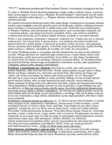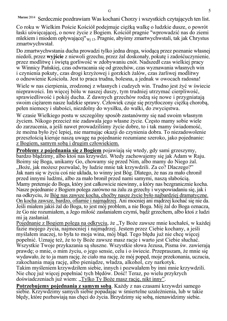 G1 5 Serdecznie pozdrawiam Was kochani Chorzy i wszystkich czytających ten list. Co roku w Wielkim Poście Kościół podejmuje ciężką walkę o ludzkie dusze, o powrót łaski uświęcającej, o nowe życie z Bogiem. Kościół pragnie "wprowadzić nas do ziemi mlekiem i miodem opływającej" Wj 13. Pragnie, abyśmy zmartwychwstali, tak jak Chrystus zmartwychwstał. Do zmartwychwstania ducha prowadzi tylko jedna droga, wiodącą przez poznanie własnej niedoli, przez wyjście z niewoli grzechu, przez żal doskonały, pokutę i zadośćuczynienie, przez modlitwę i świętą gorliwość w zdobywaniu cnót. Nadszedł czas wielkiej pracy w Winnicy Pańskiej, czas odwracania się od grzechów, czas wyznawania własnych win i czynienia pokuty, czas drogi krzyżowej i gorzkich żalów, czas żarliwej modlitwy o odnowienie Kościoła. Jest to praca trudna, bolesna, a jednak w owocach radosna! Wiele w nas cierpienia, zrodzonej z własnych i cudzych win. Trudno jest żyć w świecie nieprawości. Im więcej bólu w naszej duszy, tym trudniej utrzymać cierpliwość, sprawiedliwość i pokój ducha. Z dawnych grzechów rodzą się nowe i przygniatają swoim ciężarem nasze ludzkie sprawy. Człowiek czuje się przytłoczony ciężką chorobą, pełen niemocy i słabości, niezdolny do wysiłku, do walki, do zwycięstwa. W czasie Wielkiego postu w szczególny sposób zastanówmy się nad swoim własnym życiem. Nikogo przecież nie zadawala jego własne życie. Często mamy sobie wiele do zarzucenia, a jeśli nawet prowadziliśmy życie dobre, to i tak mamy świadomość, że można było żyć lepiej, nie marnując okazji do czynienia dobra. To niezadowolenie przeszłością kieruje naszą uwagę na pojednanie rozumiane szeroko, jako pojednanie: z Bogiem, samym sobą i drugim człowiekiem. Problemy z pojednania się z Bogiem pojawiają się wtedy, gdy sami grzeszymy, bardzo błądzimy, albo ktoś nas krzywdzi. Wtedy zachowujemy się jak Adam w Raju. Boimy się Boga, unikamy Go, chowamy się przed Nim, albo mamy do Niego żal. „Boże, jak możesz pozwalać, by ludzie mnie tak krzywdzili. Za co? Dlaczego?” Jak nam się w życiu coś nie układa, to winny jest Bóg. Dlatego, że nas za mało chronił przed innymi ludźmi, albo za mało bronił przed nami samymi, naszą słabością. Mamy pretensje do Boga, który jest całkowicie niewinny, a który nas bezgranicznie kocha. Nasze pojednanie z Bogiem polega zarówno na żalu za grzechy i wyspowiadaniu się, jak i na odkryciu, że Bóg nas zawsze kocha, choćby nasze życie było najbardziej dramatyczne. On kocha zawsze, bardzo, ofiarnie i najmądrzej. Ani mocniej ani mądrzej kochać się nie da. Jeśli miałem jakiś żal do Boga, to jest mój problem, a nie Boga. Mój żal do Boga oznacza, że Go nie rozumiałem, a Jego miłość zasłaniałem czymś, bądź grzechem, albo ktoś z ludzi mi ją zasłaniał. Pojednanie z Bogiem polega na odkryciu, że „Ty Boże zawsze mnie kochałeś, w każdej fazie mojego życia, najmocniej i najmądrzej. Jestem przez Ciebie kochany, a jeśli myślałem inaczej, to była to moja wina, mój błąd. Tego błędu już nie chcę więcej popełnić. Uznaję też, że to ty Boże zawsze masz racje i warto jest Ciebie słuchać. Wszystkie Twoje przykazania są słuszne. Wszystkie słowa Jezusa, Pisma św. zawierają prawdę; o mnie, o mim życiu, o jego sensie, celu i o świecie. Przepraszam, że mnie się wydawało, że to ja mam rację, że ciało ma rację, że mój popęd, moje przekonania, uczucia, zakochania mają rację, albo pieniądze, władza, alkohol, czy narkotyk. Takim myśleniem krzywdziłem siebie, innych i pozwalałem by inni mnie krzywdzili. Nie chcę już więcej popełniać tych błędów. Dość! Teraz, po wielu przykrych doświadczeniach już wiem: „Tylko Ty Boże masz rację, nikt inny”. Potrzebujemy pojednania z samym sobą. Każdy z nas czasami krzywdzi samego siebie. Krzywdzimy samych siebie popadając w śmiertelne uzależnienia, lub w takie błędy, które pozbawiają nas chęci do życia. Brzydzimy się sobą, nienawidzimy siebie. Marzec 2014 6 G1 Mamy żal do siebie, że w jakimś stopniu każdy z nas krzywdzi samego siebie, zamiast siebie kochać. Mamy również w sercu żal, że krzywdzimy innych, a to niechybnie do nas wraca. Ich krzywda, łzy, ból wracają pod postacią np. wyrzutów sumienia… Wreszcie mam żal o to, że inni mnie krzywdzili, a ja na to pozwalałem. Jak ktoś mnie skrzywdził, gdy byłem dzieckiem, to mam żal tylko do krzywdziciela. Nie mogłem się bronić. Jeśli jednak ktoś krzywdził mnie w dorosłym życiu, to mam uzasadniony żal do krzywdziciela, bo nikt nie ma prawa mnie krzywdzić. Jednak mogę także mieć żal do samego siebie za to, że pozwalałem siebie krzywdzić. Mogę popaść w okrucieństwo wobec siebie, ponieważ „nabroiłem” w swoim życiu, popełniłem wielkie zło, pozwalałem krzywdzić siebie i krzywdziłem innych, dlatego nienawidzę siebie, nie widzę dobrej przyszłości, więc codziennie siebie zadręczam. Dobrze mi tak, zasłużyłem na to. Czyli mszczę się za własną przeszłość. Jest to wielki błąd. Pan Jezus nie mówi „zadręczajcie się”, tylko „nawracajcie się”. Niektórzy popadają w odwrotną skrajność, pobłażanie sobie. Np. Ktoś mówi: „popełniłem wiele zła i ciągle je popełniam. Alkohol, zdrady, drobne oszustwa, ale ja sobie wszystko przebaczam. Bóg mi przebaczy i ja sobie przebaczam. To znowu wielki błąd. Nic ci nie da, że sobie wybaczysz, jeśli dalej robisz to samo. Zginiesz marnie. Nie ma znaczenia, czy sobie przebaczasz czy nie, jeśli dalej robisz to samo. Przebaczenie sobie polega na tym, że przebaczam sobie grzechy minione i wszystko, co złego zrobiłem, ale już do tego nie wracam. Wyciągam wnioski i odwracam się nawet od złych nawyków. Zastanawiam się bardzo konkretnie: z kim zerwę kontakt, jakiej telewizji lub co w internecie nie będą oglądał, z kim nie będę