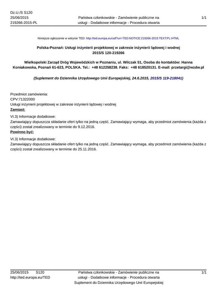 Dz.U./S S120 25/06/2015 219266-2015-PL Państwa członkowskie - Zamówienie publiczne na usługi - Dodatkowe informacje - Procedura otwarta 1/1 Niniejsze ogłoszenie w witrynie TED: http://ted.europa.eu/udl?uri=TED:NOTICE:219266-2015:TEXT:PL:HTML Polska-Poznań: Usługi inżynierii projektowej w zakresie inżynierii lądowej i wodnej 2015/S 120-219266 Wielkopolski Zarząd Dróg Wojewódzkich w Poznaniu, ul. Wilczak 51, Osoba do kontaktów: Hanna Koniakowska, Poznań 61-623, POLSKA. Tel.: +48 612258238. Faks: +48 618520131. E-mail: [email protected] (Suplement do Dziennika Urzędowego Unii Europejskiej, 24.6.2015, 2015/S 119-218041) Przedmiot zamówienia: CPV:71322000 Usługi inżynierii projektowej w zakresie inżynierii lądowej i wodnej Zamiast: VI.3) Informacje dodatkowe: Zamawiający dopuszcza składanie ofert tylko na jedną część. Zamawiający wymaga, aby przedmiot zamówienia (każda z części) został zrealizowany w terminie do 9.12.2016. Powinno być: VI.3) Informacje dodatkowe: Zamawiający dopuszcza składanie ofert tylko na jedną część. Zamawiający wymaga, aby przedmiot zamówienia (każda z części) został zrealizowany w terminie do 25.11.2016. 25/06/2015 S120 http://ted.europa.eu/TED Państwa członkowskie - Zamówienie publiczne na usługi - Dodatkowe informacje - Procedura otwarta Suplement do Dziennika Urzędowego Unii Europejskiej 1/1