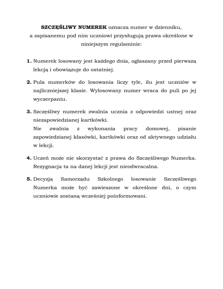 SZCZĘŚLIWY NUMEREK oznacza numer w dzienniku, a zapisanemu pod nim uczniowi przysługują prawa określone w niniejszym regulaminie: 1. Numerek losowany jest każdego dnia, ogłaszany przed pierwszą lekcją i obowiązuje do ostatniej. 2. Pula numerków do losowania liczy tyle, ilu jest uczniów w najliczniejszej klasie. Wylosowany numer wraca do puli po jej wyczerpaniu. 3. Szczęśliwy numerek zwalnia ucznia z odpowiedzi ustnej oraz niezapowiedzianej kartkówki. Nie zwalnia z wykonania pracy domowej, pisanie zapowiedzianej klasówki, kartkówki oraz od aktywnego udziału w lekcji. 4. Uczeń może nie skorzystać z prawa do Szczęśliwego Numerka. Rezygnacja ta na danej lekcji jest nieodwracalna. 5. Decyzją Samorządu Szkolnego losowanie Szczęśliwego Numerka może być zawieszone w określone dni, o czym uczniowie zostaną wcześniej poinformowani.