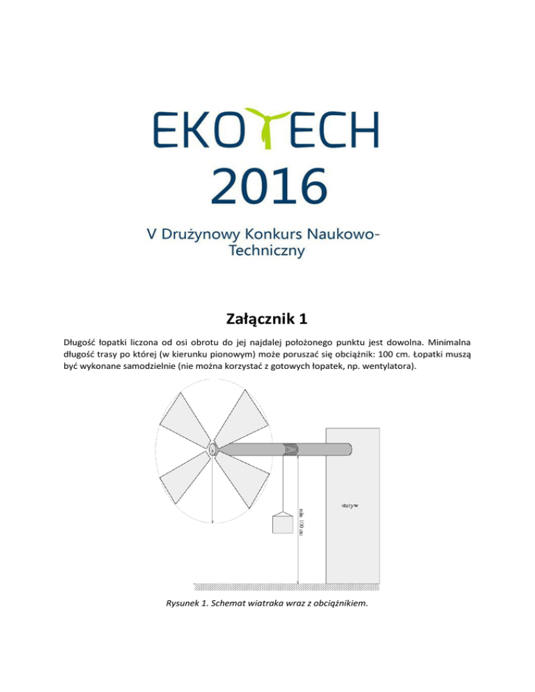Załącznik 1 Długość łopatki liczona od osi obrotu do jej najdalej położonego punktu jest dowolna. Minimalna długość trasy po której (w kierunku pionowym) może poruszać się obciążnik: 100 cm. Łopatki muszą być wykonane samodzielnie (nie można korzystać z gotowych łopatek, np. wentylatora). Rysunek 1. Schemat wiatraka wraz z obciążnikiem. Pomiar mocy zostanie wykonany na podstawie pomiaru czasu wznoszenia się obciążnika na długości 1m. Moc wiatraka zostanie zmierzona dla prędkości wiatru: 4 ms−1. Moc 𝑃 jest wielkością opisującą zdolność do wykonania pracy 𝑊, w jednostce czasu 𝑡 𝑃= 𝑊 . 𝑡 Praca konieczna do podniesienia obciążnika o masie 𝑚 na wysokość ℎ jest równa 𝑊 = 𝑚𝑔ℎ, gdzie 𝑔 = 981 𝑚𝑠 −2 jest przyspieszeniem ziemskim. Moc może więc zostać wyrażona równainem ℎ 𝑃 = 𝑚𝑔 . 𝑡 Aby zmierzyć moc użyteczną wiatraka wystarczy zmierzyć czas 𝑡, w którym wiatrak podniesie zawieszony ciężarek o znanej masie 𝑚, na zadaną wysokość ℎ. Celem drużyn jest zatem takie dobranie obciążenia dla wykonanego wiatraka, aby moc użyteczna była największa. Podczas finału, komisyjnie zostanie zmierzona masa obciążnika wybranego przez drużynę. Każda drużyna, w nieprzekraczalnym czasie 15 minut, musi wykonać serię pomiarów czasu wznoszenia się ciężarka. Pomiar czasu wykonywany będzie od momentu startu wiatraka i jednoczesnego oderwania się ciężarka od ziemi (linka jest napięta). Eliminuje to wpływ bezwładności samych łopatek i piasty, natomiast uwzględnia czas rozpędzania się wiatraka. Aby zminimalizować błąd pomiarowy, pomiar powinien zostać wykonany kilkakrotnie. Ostateczną wartością pomiaru mocy użytecznej będzie jej wartość średnia pomniejszona o uzyskany maksymalny błąd pomiarowy, wyznaczony dla poziomu ufności 0.9973. Aplikacja wyznaczająca wartość średnią i błąd losowy pomiaru mocy użyteczniej zostanie udostępniona na stronie Konkursu. Uwagi: 1. Zadaniem drużyny jest takie dobranie obciążenia, aby zapewnić brak wpływu bezwładności samego wiatraka na pomiar. 2. Zadaniem drużyny jest umożliwienie pomiaru zarówno czasu wznoszenia się obciążnika, jak i jego masy.