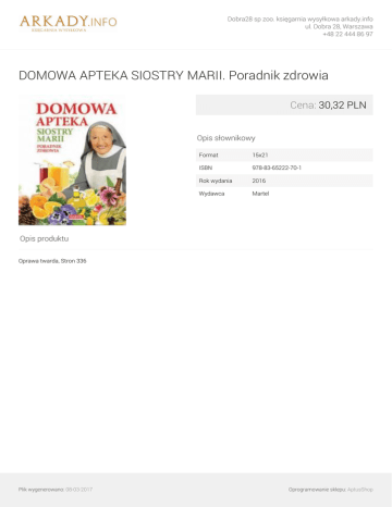 Dobra28 sp zoo. księgarnia wysyłkowa arkady.info ul. Dobra 28, Warszawa +48 22 444 86 97 DOMOWA APTEKA SIOSTRY MARII. Poradnik zdrowia Cena: 30,32 PLN Opis słownikowy Format 15x21 ISBN 978-83-65222-70-1 Rok wydania 2016 Wydawca Martel Opis produktu Oprawa twarda, Stron 336 Plik wygenerowano: 08-03-2017 Powered by TCPDF (www.tcpdf.org) Oprogramowanie sklepu: AptusShop