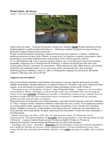Winni ludzie, nie deszcz Artykuł z „Panoramy Leszczyńskiej” z 21.09.2010. Jednym słowem kanał – wzdycha Przemysław Sztukowski, dyrektor Spółki Wodnej Melioracji Nizin Nadodrzańskich w podkościańskim Bonikowie. – Melioracja znajduje się gdzieś na szarym końcu w hierarchii ważności finansowania jej potrzeb. Przede wszystkim brakuje znaczącego wsparcia konserwacji przez państwo, a rolnicy i członkowie spółek pozostawieni są sami sobie. Dobrze, że mogą liczyć na częściowe wsparcie samorządów, które przejmują na swoje barki dofinansowanie konserwacji rowów melioracyjnych i drenów. To, że setki hektarów łąk i pól w naszym regionie znalazły się w tym roku pod wodą nie jest dziełem przypadku. Najgorzej jest w okolicach Rowu Polskiego, w którym od niemal pół roku stan wody wynosi półtora metra, a powinien 30 centymetrów. Winę ponoszą nie tylko obfite deszcze, ale również zarośnięte oraz zamulone kanały i rowy, pozrywane dreny, przestarzałe jazy. Stan systemów melioracyjnych jest opłakany, mimo że tylko w Wielkopolsce zajmuje się nimi prawie 400 spółek wodnych. Dlaczego więc jest aż tak źle? Najgorsza jest bezradność Pieczę nad rzekami, kanałami i zbiornikami retencyjnymi w naszym regionie sprawuje leszczyński oddział wielkopolski Zarządu Melioracji i Urządzeń Wodnych w Poznaniu. Jego szef, Franciszek Halec szacuje, że na utrzymanie wszystkich w dobrym stanie potrzebuje rocznie około 30 mln zł. – Tymczasem na ten rok dostaliśmy 1,6 mln zł – mówi Franciszek Halec. – Najgorsza w tym wszystkim jest bezradność. Rolnicy narzekają, że zalewa im łąki i pola. Ja to doskonale wiem, ale nie mogę nic zrobić, bo nie mam pieniędzy. Wydałem już wszystko, co dostaliśmy na konserwację. Czekamy teraz na dodatkowe środki obiecane przez ministerstwo spraw wewnętrznych i administracji na usuwanie skutków powodzi, których mamy co niemiara. Rząd przeznacza na meliorację coraz mniej pieniędzy, tymczasem każdy kanał powinien być odmulany co 3 lata, a rosnąca na dnie i skarpach roślinność wykaszana dwa razy w roku. W nie najlepszej sytuacji są również spółki wodne zajmujące się tzw. melioracją szczegółową, czyli rowami oraz systemem drenów. Składki zrzeszonych w nich rolników starczają na niewiele, większość zaś samorządów nie widzi potrzeby dotowania spółek. Wyjątek stanowią powiat kościański i wschowski oraz wchodzące w ich skład gminy. – Daleko nam jeszcze do stanu z 1945 roku. W całym powiecie mamy 527 kilometrów rowów melioracyjnych. 45% doprowadziliśmy do porządku, spośród pozostałych w tym roku udrożnimy niecałe 2 kilometry – wyjaśnia Andrzej Kokot, prezes Powiatowej Spółki Wodnej we Wschowie. Zdaniem Przemysława Sztukowskiego problemem jest nie tylko brak pieniędzy. – Szwankuje cały system – stwierdza. – Regulacje prawne określające zasady prowadzenia działalności przez spółki nie zmieniły się znacząco od lat siedemdziesiątych. Do tego dochodzą przyczyny, które można określić jako naturalne lub anomalne. Kanały i rowy szybko zarastają, bo spadki wody są bardzo małe. Rolnicy nie bez winy Członkami spółek wodnych są rolnicy, ale wielu z nich zupełnie zapomina o wynikających stąd obowiązkach. W spółce z Bonikowa ściągalność składek wynosi 70%, jeszcze gorzej jest w powiecie wschowskim. – Płaci tylko 46% rolników, mimo że składki są na prawdę niewielkie – przyznaje Andrzej Kokot. Kłopoty ze ściąganiem należności to jeszcze nie wszystko. Niektórzy właściciele pól i łąk zupełnie nie rozumieją potrzeby konserwacji kanałów. Nie wpuszczają pracowników spółek na swoje grunty, żądają odszkodowań za składowanie mułu wzdłuż kanałów i rowów, albo za poruszanie się po polach ciężkim sprzętem. – Choć część rolników nie wywiązuje się z obowiązków utrzymania urządzeń wodnych lub członkowstwa w spółkach staramy się działać na ich korzyść wykonując corocznie optymalny zakres robót – dodaje Przemysław Sztukowski. Niektórzy poziom wody w kanałach próbują regulować na własną rękę. Ci, których pola znajdują się niżej żądają, żeby spółki podnosiły jazy, właściciele gruntów położonych wyżej domagają się spiętrzania wody. Bardziej zdeterminowani potrafią na przykład zabetonować system przekładni służący do podnoszenia zasuw. Niemiłą niespodziankę sprawiają też od czasu do czasu ciężkie, nowoczesne maszyn rolnicze, które zrywają systemy drenarskie. Naprawa bywa trudna, zgłasza gdy – tak jak w powiecie wschowskim – mapy zniknęły wraz z Niemcami w 1945 roku. Musieliśmy policzyć żabki Nie po drodze jest też specom od melioracji i ochrony środowiska. Jedni chcą wycinać drzewa i kosić trzciny, drudzy zabraniają ze względu na żyjące w nich ptaki owady i płazy. Sztandarowym przykładem jest projekt konserwacji Południowego Kanału Obry. – Kanał nie był oczyszczany od lat 40-stych. Kiedy zaczęliśmy planować jego konserwację, słuzby związane z ochroną środowiska najpierw kazały nam policzyć wszystkie drzewa i nanieść na mapę. Potem musieliśmy zewidencjonować żyjące nad nim ptaki. Kosztowało nas to kilkadziesiąt tysięcy złotych. W końcu dowiedzieliśmy się, że prace przy kanale nie są możliwe, bo w ciągu tych kilkudziesięciu lat powstało tu środowisko, którego nie wolno naruszyć – mówi Franciszek Halec. Dyrektor leszczyńskiego oddziału WZMiUW podaje też inne przykłady: w Rydzynie musi zewidencjonować żaby, miał też problemy z doprowadzeniem do końca przygotowań do budowy zbiornika w Jutrosine. – Usłyszałem, że może on negatywnie oddziaływać na stawy milickie, które są oddalone od niego o 25 kilometrów. Potrzebna była ekspertyza naukowców, udowadniająca, że tamtym stawom nic nie grozi – dodaje Franciszek Halec. Kanały i rowy znajdujące się na obs
