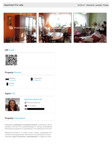 Apartment For sale 52.50 m² - Wierzbnik, opolskie, Polska QR Code Property Rooms Bedroom Living room (3,3x4,22) (3,55x4,22) Kitchen (3x4,2) Agent Info Katarzyna Krawczyk www.proconsilio.pl 77 4142038 Property Description Mieszkanie 2 pokojowe na wysokim parterze w Wierzbniku, gmina Grodków. 8 km do w?z?a autostradowego A4 - Brzeg i od Grodkowa. Mieszkanie jest gotowe do zamieszkania i ma powierzchni? 52,5 m2. Mieszkanie sk?ada si? z: 2 pokoi, kuchni, ?azienki, przedpokoju oraz schowka wykorzystywanego obecnie jako mini-garderoba. W cenie mieszkania gara? murowany 1-stanowiskowy, w odleg?o?ci kilku metrów od mieszkania. Do mieszkania przynale?? dwa ogródki, ka?dy o powierzchni oko?o 2 ar. Jeden bezpo?rednio przy mieszkaniu, drugi w odleg?o?ci oko?o 200 m od mieszkania. W pokojach i przedpokoju na pod?ogach po?o?one panele pod?ogowe, w ?azience i kuchni kafelki. Okna plastikowe. Features Heating system Central Garden W mieszkaniu s? media: woda, kanalizacja, pr?d, kuchenka na butl? gazow?, ciep?a woda z bojlera elektrycznego. Nowa instalacja elektryczna (wykonana w 2014 r.). Ok. 2010 r. nowa instalacja wodno-kanalizacyjna. Ogrzewanie piecem C.O. w?glowym, który znajduje si? w piwnicy. Piec zakupiony w 2011 r. Piwnica ma powierzchni? 7,2 m2, ma okno przez które mo?na wrzuca? opa?. Dodatkowym ?ród?em ciep?a jest piec kaflowy, który znajduje si? w kuchni. Basement View Kitchen Semi Equipped Storage room Parking 1 Furnished Semi Furnished Niskie koszty utrzymania mieszkania (czynsz ok. 170 z? + media wg zu?ycia). Appliances Do mieszkania przynale?y piwnica, gara? oraz ogródki o ??cznej powierzchni ok. 4 ar. Kitchen Oven Na wyposa?eniu mieszkania zostaje wyposa?enie sypialni bez ?ó?ka i TV, oraz kuchni bez lodówki i sto?u. Pozosta?a cz??? wyposa?enia do uzgodnienia. Telephone Mieszkanie znajduje si? w cichej i spokojnej okolicy, blisko terenów zielonych, blisko boiska, placu zabaw, ko?cio?a. W odleg?o?ci kilku kroków znajduje si? lokalny sklep. Address Map Cena jest do negocjacji. Polecamy i zapraszamy na bezp?atn? prezentacj?! Je?li potrzebujesz kredytu na zakup nieruchomo?ci umów si? z naszym doradc? kredytowym, który bezp?atnie zweryfikuje Twoj? zdolno?? kredytow?. Tel. 77 414 20 38. Uwaga: Informacje dotycz?ce opisu nieruchomo?ci podane s? przez w?a?ciciela, maj? charakter wy??cznie informacyjny i mog? podlega? aktualizacji. Oferta dotycz?ca nieruchomo?ci stanowi zaproszenie do rokowa? zgodnie z art. 71 Kodeksu Cywilnego i nie stanowi oferty okre?lonej w art. 66 i nast?pnych KC. Basic Details Property type : Apartment Offer Type : For sale Offer ID : 1083 Price : 89,000 PLN View : Garden Bedrooms : 1 Rooms : 2 Bathrooms : 1 Usable area : 52.50 m² Total area : 59.70 m² Country : Polska Province : opolskie Town : Wierzbnik Neighborhood Hospital 20 Minutes Police station 8 Minutes Train station 8 Minutes Bus stop 8 Minutes Airport 40 Minutes Coffee shop 8 Minutes Beach 15 Minutes Cinema 8 Minutes Sightseeing 15 Minutes