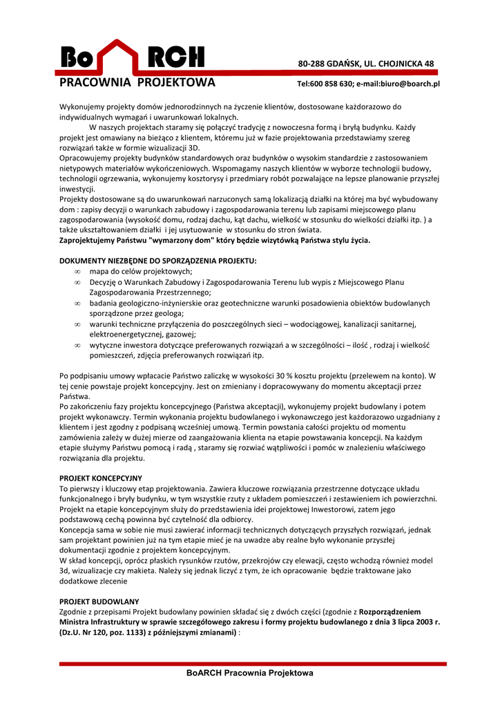 Bo RCH PRACOWNIA PROJEKTOWA 80-288 GDAŃSK, UL. CHOJNICKA 48 Tel:600 858 630; e-mail:[email protected] Wykonujemy projekty domów jednorodzinnych na życzenie klientów, dostosowane każdorazowo do indywidualnych wymagań i uwarunkowań lokalnych. W naszych projektach staramy się połączyć tradycję z nowoczesna formą i bryłą budynku. Każdy projekt jest omawiany na bieżąco z klientem, któremu już w fazie projektowania przedstawiamy szereg rozwiązań także w formie wizualizacji 3D. Opracowujemy projekty budynków standardowych oraz budynków o wysokim standardzie z zastosowaniem nietypowych materiałów wykończeniowych. Wspomagamy naszych klientów w wyborze technologii budowy, technologii ogrzewania, wykonujemy kosztorysy i przedmiary robót pozwalające na lepsze planowanie przyszłej inwestycji. Projekty dostosowane są do uwarunkowań narzuconych samą lokalizacją działki na której ma być wybudowany dom : zapisy decyzji o warunkach zabudowy i zagospodarowania terenu lub zapisami miejscowego planu zagospodarowania (wysokość domu, rodzaj dachu, kąt dachu, wielkość w stosunku do wielkości działki itp. ) a także ukształtowaniem działki i jej usytuowanie w stosunku do stron świata. Zaprojektujemy Państwu "wymarzony dom" który będzie wizytówką Państwa stylu życia. DOKUMENTY NIEZBĘDNE DO SPORZĄDZENIA PROJEKTU: • mapa do celów projektowych; • Decyzję o Warunkach Zabudowy i Zagospodarowania Terenu lub wypis z Miejscowego Planu Zagospodarowania Przestrzennego; • badania geologiczno-inżynierskie oraz geotechniczne warunki posadowienia obiektów budowlanych sporządzone przez geologa; • warunki techniczne przyłączenia do poszczególnych sieci – wodociągowej, kanalizacji sanitarnej, elektroenergetycznej, gazowej; • wytyczne inwestora dotyczące preferowanych rozwiązań a w szczególności – ilość , rodzaj i wielkość pomieszczeń, zdjęcia preferowanych rozwiązań itp. Po podpisaniu umowy wpłacacie Państwo zaliczkę w wysokości 30 % kosztu projektu (przelewem na konto). W tej cenie powstaje projekt koncepcyjny. Jest on zmieniany i dopracowywany do momentu akceptacji przez Państwa. Po zakończeniu fazy projektu koncepcyjnego (Państwa akceptacji), wykonujemy projekt budowlany i potem projekt wykonawczy. Termin wykonania projektu budowlanego i wykonawczego jest każdorazowo uzgadniany z klientem i jest zgodny z podpisaną wcześniej umową. Termin powstania całości projektu od momentu zamówienia zależy w dużej mierze od zaangażowania klienta na etapie powstawania koncepcji. Na każdym etapie służymy Państwu pomocą i radą , staramy się rozwiać wątpliwości i pomóc w znalezieniu właściwego rozwiązania dla projektu. PROJEKT KONCEPCYJNY To pierwszy i kluczowy etap projektowania. Zawiera kluczowe rozwiązania przestrzenne dotyczące układu funkcjonalnego i bryły budynku, w tym wszystkie rzuty z układem pomieszczeń i zestawieniem ich powierzchni. Projekt na etapie koncepcyjnym służy do przedstawienia idei projektowej Inwestorowi, zatem jego podstawową cechą powinna być czytelność dla odbiorcy. Koncepcja sama w sobie nie musi zawierać informacji technicznych dotyczących przyszłych rozwiązań, jednak sam projektant powinien już na tym etapie mieć je na uwadze aby realne było wykonanie przyszłej dokumentacji zgodnie z projektem koncepcyjnym. W skład koncepcji, oprócz płaskich rysunków rzutów, przekrojów czy elewacji, często wchodzą również model 3d, wizualizacje czy makieta. Należy się jednak liczyć z tym, że ich opracowanie będzie traktowane jako dodatkowe zlecenie PROJEKT BUDOWLANY Zgodnie z przepisami Projekt budowlany powinien składać się z dwóch części (zgodnie z Rozporządzeniem Ministra Infrastruktury w sprawie szczegółowego zakresu i formy projektu budowlanego z dnia 3 lipca 2003 r. (Dz.U. Nr 120, poz. 1133) z późniejszymi zmianami) : BoARCH Pracownia Projektowa OFERTA WYKONANIA INDYWIDUALNEGO PROJEKTU DOMU JEDNORODZINNEGO 1. Projektu zagospodarowania terenu (PZT) Ta część dokumentacji składa się z części opisowej i rysunkowej. Część opisowa zawiera szczegółowy opis zagospodarowania w kwestii określenia przedmiotu inwestycji, istniejącego i projektowanego zagospodarowania terenu, zestawienie powierzchni poszczególnych części zagospodarowania działki i wiele innych szczegółowych informacji wyszczególnionych w w/w rozporządzeniu. Część rysunkowa to naniesiona na mapę lokalizacja budynku, czyli jego obrys, z wymiarami, pozwalającymi wytyczyć jego położenie w terenie. Na planie musi znaleźć się także wjazd na działkę, przebieg przyłączy wody, energii, kanalizacji oraz takie obiekty, jak śmietnik, czy zbiornik na gaz. Na planie powinny zostać również oznaczone drzewa i krzewy istniejące, zarówno te, które zamierzamy usunąć, ponieważ kolidują z projektowanym obiektem, jak i te, które pozostaną. PZT powinien być naniesiony na aktualną mapę do celów projektowych. 2. Projektu budowlanego wielobranżowego (PBW) Ta część dokumentacji składa się z części opisowej i rysunków. W opisie, obok funkcji budynku, powinny znaleźć się informacje o zastosowanych materiałach i rozwiązaniach konstrukcyjnych, a także określenie kategorii geotechnicznej gruntu, wymaganej dla danego rodzaju inwestycji, właściwości cieplne przegród (czyli ścian, dachu, stropów oraz okien i drzwi) oraz wymagania ochrony pożarowej dla tego obiektu. Część rysunkowa składa się z następujących rysunków w poszczególnych branżach: • projekt architektoniczny (wszystkie elewacje , rzuty wszystkich kondygnacji, rzut dachu, charakterystyczne przekroje pokazujące biegi schodowe, antresole, wysokość kondygnacji) – zazwyczaj w skali 1:100 • projekt konstrukcyjny (rzut fundamentów, rzuty stropów z zaznaczeniem występujących tam elementów konstrukcyjnych , rzut więźby dachowej , obliczenia statyczne) – zazwyczaj w skali 1:100 • 