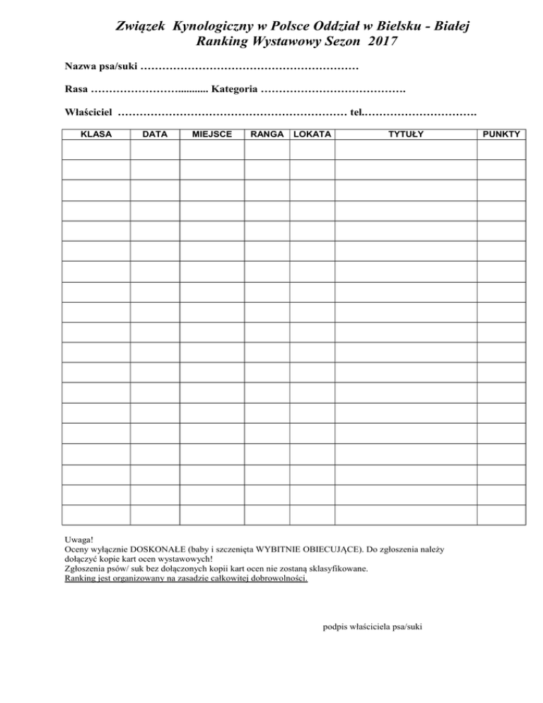 Związek Kynologiczny w Polsce Oddział w Bielsku - Białej Ranking Wystawowy Sezon 2017 Nazwa psa/suki …………………………………………………… Rasa ……………………........... Kategoria …………………………………. Właściciel ……………………………………………………… tel.…………………………. KLASA DATA MIEJSCE RANGA LOKATA TYTUŁY Uwaga! Oceny wyłącznie DOSKONAŁE (baby i szczenięta WYBITNIE OBIECUJĄCE). Do zgłoszenia należy dołączyć kopie kart ocen wystawowych! Zgłoszenia psów/ suk bez dołączonych kopii kart ocen nie zostaną sklasyfikowane. Ranking jest organizowany na zasadzie całkowitej dobrowolności. podpis właściciela psa/suki PUNKTY