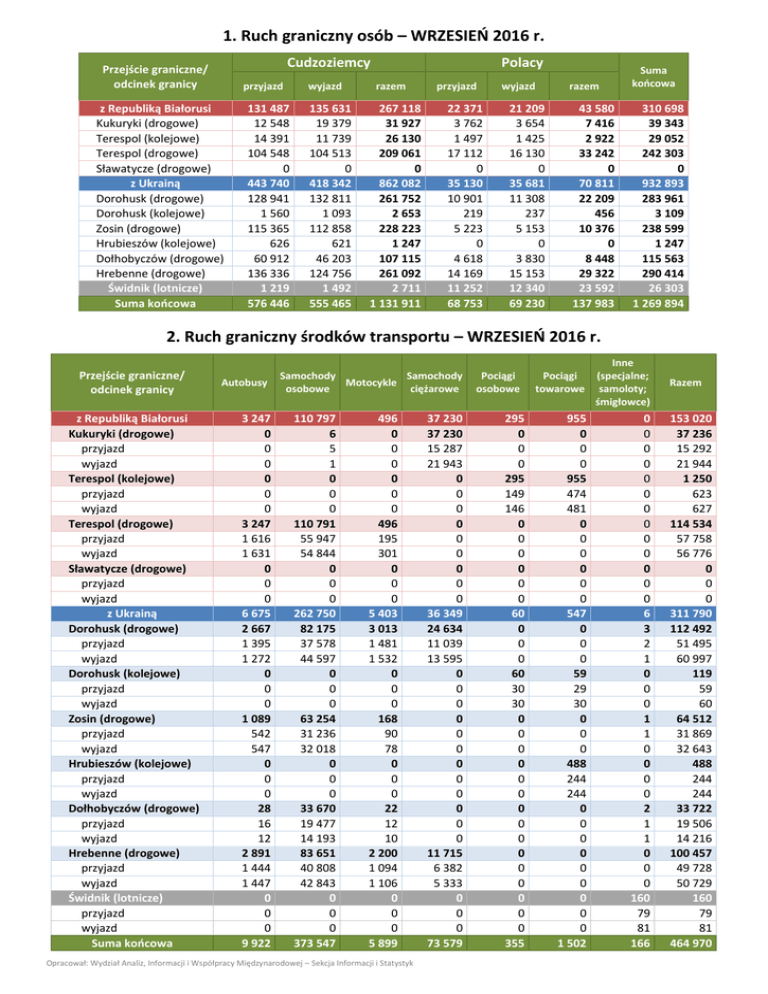 1. Ruch graniczny osób – WRZESIEŃ 2016 r. Cudzoziemcy Przejście graniczne/ odcinek granicy przyjazd z Republiką Białorusi Kukuryki (drogowe) Terespol (kolejowe) Terespol (drogowe) Sławatycze (drogowe) z Ukrainą Dorohusk (drogowe) Dorohusk (kolejowe) Zosin (drogowe) Hrubieszów (kolejowe) Dołhobyczów (drogowe) Hrebenne (drogowe) Świdnik (lotnicze) Suma końcowa 131 487 12 548 14 391 104 548 0 443 740 128 941 1 560 115 365 626 60 912 136 336 1 219 576 446 wyjazd 135 631 19 379 11 739 104 513 0 418 342 132 811 1 093 112 858 621 46 203 124 756 1 492 555 465 Polacy razem 267 118 31 927 26 130 209 061 0 862 082 261 752 2 653 228 223 1 247 107 115 261 092 2 711 1 131 911 przyjazd 22 371 3 762 1 497 17 112 0 35 130 10 901 219 5 223 0 4 618 14 169 11 252 68 753 wyjazd 21 209 3 654 1 425 16 130 0 35 681 11 308 237 5 153 0 3 830 15 153 12 340 69 230 razem Suma końcowa 43 580 7 416 2 922 33 242 0 70 811 22 209 456 10 376 0 8 448 29 322 23 592 137 983 310 698 39 343 29 052 242 303 0 932 893 283 961 3 109 238 599 1 247 115 563 290 414 26 303 1 269 894 2. Ruch graniczny środków transportu – WRZESIEŃ 2016 r. Przejście graniczne/ odcinek granicy z Republiką Białorusi Kukuryki (drogowe) przyjazd wyjazd Terespol (kolejowe) przyjazd wyjazd Terespol (drogowe) przyjazd wyjazd Sławatycze (drogowe) przyjazd wyjazd z Ukrainą Dorohusk (drogowe) przyjazd wyjazd Dorohusk (kolejowe) przyjazd wyjazd Zosin (drogowe) przyjazd wyjazd Hrubieszów (kolejowe) przyjazd wyjazd Dołhobyczów (drogowe) przyjazd wyjazd Hrebenne (drogowe) przyjazd wyjazd Świdnik (lotnicze) przyjazd wyjazd Suma końcowa Autobusy 3 247 0 0 0 0 0 0 3 247 1 616 1 631 0 0 0 6 675 2 667 1 395 1 272 0 0 0 1 089 542 547 0 0 0 28 16 12 2 891 1 444 1 447 0 0 0 9 922 Samochody Samochody Motocykle osobowe ciężarowe 110 797 6 5 1 0 0 0 110 791 55 947 54 844 0 0 0 262 750 82 175 37 578 44 597 0 0 0 63 254 31 236 32 018 0 0 0 33 670 19 477 14 193 83 651 40 808 42 843 0 0 0 373 547 496 0 0 0 0 0 0 496 195 301 0 0 0 5 403 3 013 1 481 1 532 0 0 0 168 90 78 0 0 0 22 12 10 2 200 1 094 1 106 0 0 0 5 899 Opracował: Wydział Analiz, Informacji i Współpracy Międzynarodowej – Sekcja Informacji i Statystyk 37 230 37 230 15 287 21 943 0 0 0 0 0 0 0 0 0 36 349 24 634 11 039 13 595 0 0 0 0 0 0 0 0 0 0 0 0 11 715 6 382 5 333 0 0 0 73 579 Pociągi osobowe 295 0 0 0 295 149 146 0 0 0 0 0 0 60 0 0 0 60 30 30 0 0 0 0 0 0 0 0 0 0 0 0 0 0 0 355 Pociągi towarowe Inne (specjalne; samoloty; śmigłowce) 955 0 0 0 955 474 481 0 0 0 0 0 0 547 0 0 0 59 29 30 0 0 0 488 244 244 0 0 0 0 0 0 0 0 0 1 502 0 0 0 0 0 0 0 0 0 0 0 0 0 6 3 2 1 0 0 0 1 1 0 0 0 0 2 1 1 0 0 0 160 79 81 166 Razem 153 020 37 236 15 292 21 944 1 250 623 627 114 534 57 758 56 776 0 0 0 311 790 112 492 51 495 60 997 119 59 60 64 512 31 869 32 643 488 244 244 33 722 19 506 14 216 100 457 49 728 50 729 160 79 81 464 970