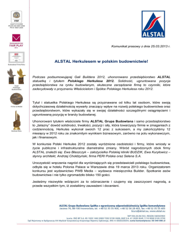 Komunikat prasowy z dnia 25.03.2013 r. ALSTAL Herkulesem w polskim budownictwie! Podczas podsumowującej Gali Buildera 2012, uhonorowano przedsiębiorstwo ALSTAL statuetką i tytułem Polskiego Herkulesa 2012. Solidność, ugruntowana pozycja przedsiębiorstwa na rynku budowlanym, skuteczne zarządzanie firmą to czynniki, które zadecydowały o przyznaniu Właścicielom i Spółce Polskiego Herkulesa roku 2012. Tytuł i statuetka Polskiego Herkulesa są przyznawane od kilku lat osobom, które swoją dotychczasową działalnością wywarły znaczący wpływ na rozwój polskiego budownictwa oraz przedsiębiorstwom, które wykazały się w swojej działalności szczególnymi osiągnięciami i ugruntowaną pozycją w branży budowlanej. Uhonorowani tytułem właściciele firmy ALSTAL Grupa Budowlana i samo przedsiębiorstwo to „żelazny” dowód solidności, trwałości, pozycji i siły, która towarzyszy firmie w zmaganiach z codziennością. Herkules wykonał swoich 12 prac z sukcesem, a my zakończyliśmy 12 miesięcy w 2012 roku ze znakomitym wynikiem biznesowym, zarówno na polu wykonawczym, jak i finansowym. W konkursie Polski Herkules 2012 zostały wyróżnione osobistości i firmy, które wniosły w życie publiczne i infrastrukturalne diametralne zmiany. Wśród nagrodzonych obok firmy ALSTAL znaleźli się: Ewa Błaszczyk – założycielka Polskiej kliniki BUDZIK, Ewa Kuryłowicz – słynny architekt, Andrzej Chołdzyński, firma PERI Polska oraz Selena S.A. Uroczystość wręczenia nagród dla wyróżniających się przedstawicieli polskiego budownictwa, odbyła się w hotelu Polonia Palace w Warszawie dnia 19 marca 2013 roku. Organizatorem konkursu jest wydawnictwo PWB Media – wydawca miesięcznika Builder. Spotkanie asów budownictwa i nie tylko zgromadziło blisko 150 gości. Jesteśmy niezwykle wdzięczni za to odznaczenie i czujemy się zaszczyceni nagrodą, a przede wszystkim tym, iż zostaliśmy zauważeni i docenieni. Materiały dla mediów: Marlena Wróblewska Rzecznik Prasowy Specjalista ds. Public Relations Tel.: + 48 608 508 698 E-mail: [email protected] Przedsiębiorstwo ALSTAL Grupa Budowlana Sp. z o.o. Sp. k. należy do grupy firm, których przedmiotem działalności jest projektowanie i Generalne Wykonawstwo inwestycji budowlanych, inżynieryjnych, konstrukcji stalowych oraz linii technologicznych. Realizowane przez ALSTAL inwestycje oparte są o wiedzę wysoko wyspecjalizowanej kadry pracowniczej oraz wszelkiego rodzaju uprawnienia i dokumenty potwierdzające naszą solidność, kwalifikacje i efektywność działania. Wśród najbardziej prestiżowych nagród zdobytych przez ALSTAL wyróżnić: Przedsiębiorstwo Fair Play 2012, Budowniczy Polskiego Sportu 2011 i 2012, Kryształ Przetargów Publicznych 2012, Platynowe Wiertło 2011, Złoty i Srebrny Orzeł Polskiego Budownictwa, Grand Prix Budowa Na Medal Pomorza i Kujaw i wiele innych.