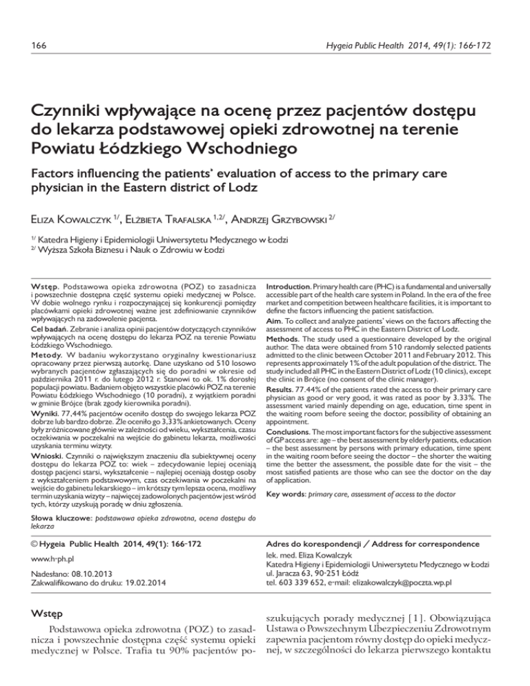 Hygeia Public Health 2014, 49(1): 166-172 166 Czynniki wpływające na ocenę przez pacjentów dostępu do lekarza podstawowej opieki zdrowotnej na terenie Powiatu Łódzkiego Wschodniego Factors influencing the patients’ evaluation of access to the primary care physician in the Eastern district of Lodz Eliza Kowalczyk 1/, Elżbieta Trafalska 1,2/, Andrzej Grzybowski 2/ 1/ 2/ Katedra Higieny i Epidemiologii Uniwersytetu Medycznego w Łodzi Wyższa Szkoła Biznesu i Nauk o Zdrowiu w Łodzi Wstęp. Podstawowa opieka zdrowotna (POZ) to zasadnicza i powszechnie dostępna część systemu opieki medycznej w Polsce. W dobie wolnego rynku i rozpoczynającej się konkurencji pomiędzy placówkami opieki zdrowotnej ważne jest zdefiniowanie czynników wpływających na zadowolenie pacjenta. Cel badań. Zebranie i analiza opinii pacjentów dotyczących czynników wpływających na ocenę dostępu do lekarza POZ na terenie Powiatu Łódzkiego Wschodniego. Metody. W badaniu wykorzystano oryginalny kwestionariusz opracowany przez pierwszą autorkę. Dane uzyskano od 510 losowo wybranych pacjentów zgłaszających się do poradni w okresie od października 2011 r. do lutego 2012 r. Stanowi to ok. 1% dorosłej populacji powiatu. Badaniem objęto wszystkie placówki POZ na terenie Powiatu Łódzkiego Wschodniego (10 poradni), z wyjątkiem poradni w gminie Brójce (brak zgody kierownika poradni). Wyniki. 77,44% pacjentów oceniło dostęp do swojego lekarza POZ dobrze lub bardzo dobrze. Źle oceniło go 3,33% ankietowanych. Oceny były zróżnicowane głównie w zależności od wieku, wykształcenia, czasu oczekiwania w poczekalni na wejście do gabinetu lekarza, możliwości uzyskania terminu wizyty. Wnioski. Czynniki o największym znaczeniu dla subiektywnej oceny dostępu do lekarza POZ to: wiek – zdecydowanie lepiej oceniają dostęp pacjenci starsi, wykształcenie – najlepiej oceniają dostęp osoby z wykształceniem podstawowym, czas oczekiwania w poczekalni na wejście do gabinetu lekarskiego – im krótszy tym lepsza ocena, możliwy termin uzyskania wizyty – najwięcej zadowolonych pacjentów jest wśród tych, którzy uzyskują poradę w dniu zgłoszenia. Introduction. Primary health care (PHC) is a fundamental and universally accessible part of the health care system in Poland. In the era of the free market and competition between healthcare facilities, it is important to define the factors influencing the patient satisfaction. Aim. To collect and analyze patients’ views on the factors affecting the assessment of access to PHC in the Eastern District of Lodz. Methods. The study used a questionnaire developed by the original author. The data were obtained from 510 randomly selected patients admitted to the clinic between October 2011 and February 2012. This represents approximately 1% of the adult population of the district. The study included all PHC in the Eastern District of Lodz (10 clinics), except the clinic in Brójce (no consent of the clinic manager). Results. 77.44% of the patients rated the access to their primary care physician as good or very good, it was rated as poor by 3.33%. The assessment varied mainly depending on age, education, time spent in the waiting room before seeing the doctor, possibility of obtaining an appointment. Conclusions. The most important factors for the subjective assessment of GP access are: age – the best assessment by elderly patients, education – the best assessment by persons with primary education, time spent in the waiting room before seeing the doctor – the shorter the waiting time the better the assessment, the possible date for the visit – the most satisfied patients are those who can see the doctor on the day of application. Key words: primary care, assessment of access to the doctor Słowa kluczowe: podstawowa opieka zdrowotna, ocena dostępu do lekarza © Hygeia Public Health 2014, 49(1): 166-172 Adres do korespondencji / Address for correspondence www.h-ph.pl lek. med. Eliza Kowalczyk Katedra Higieny i Epidemiologii Uniwersytetu Medycznego w Łodzi ul. Jaracza 63, 90-251 Łódź tel. 603 339 652, e-mail: [email protected] Nadesłano: 08.10.2013 Zakwalifikowano do druku: 19.02.2014 Wstęp Podstawowa opieka zdrowotna (POZ) to zasadnicza i powszechnie dostępna część systemu opieki medycznej w Polsce. Trafia tu 90% pacjentów po- szukujących porady medycznej [1]. Obowiązująca Ustawa o Powszechnym Ubezpieczeniu Zdrowotnym zapewnia pacjentom równy dostęp do opieki medycznej, w szczególności do lekarza pierwszego kontaktu Kowalczyk E i wsp. Czynniki wpływające na ocenę przez pacjentów dostępu do lekarza ... [2]. W dobie wolnego rynku i rozpoczynającej się konkurencji pomiędzy placówkami opieki zdrowotnej ważne jest zdefiniowanie czynników wpływających na zadowolenie pacjenta. 167 w poradniach uzyskiwano informację na temat średniej liczby pacjentów zadeklarowanych do jednego lekarza i możliwości zapisów na wizyty w szczegółowo wyznaczonym czasie. Wywiady z pacjentami, za zgodą kierowników przychodni, zostały przeprowadzone przez autorkę. Pacjentów informowano o anonimowości badań oraz o tym, że uzyskane informacje nie będą znane personelowi przychodni. Cel badań Zebranie i analiza opinii pacjentów dotyczących czynników wpływających na ocenę dostępu do lekarza POZ na terenie Powiatu Łódzkiego Wschodniego. Charakterystyka próby pacjentów Materiał i metody W badaniu wzięło udział 510 pacjentów wieku od 18 do 88 lat. 65,49% stanowiły kobiety, 34,51% mężczyźni. Najliczniejszą grupę wiekową stanowiły osoby między 49 a 68 rokiem życia. Przeważały osoby z wykształceniem średnim (40,78%) i mieszkańcy miast (tab. I). Badanie przeprowadzono w miesiącach październik 2011-luty 2012 r. Próbę stanowiło 510 losowo wybranych pacjentów w wieku od 18 do 88 lat, z 10 poradni POZ w Powiecie Łódzkim Wschodnim. Liczba ankietowanych w poszczególnych poradniach wynosiła od 