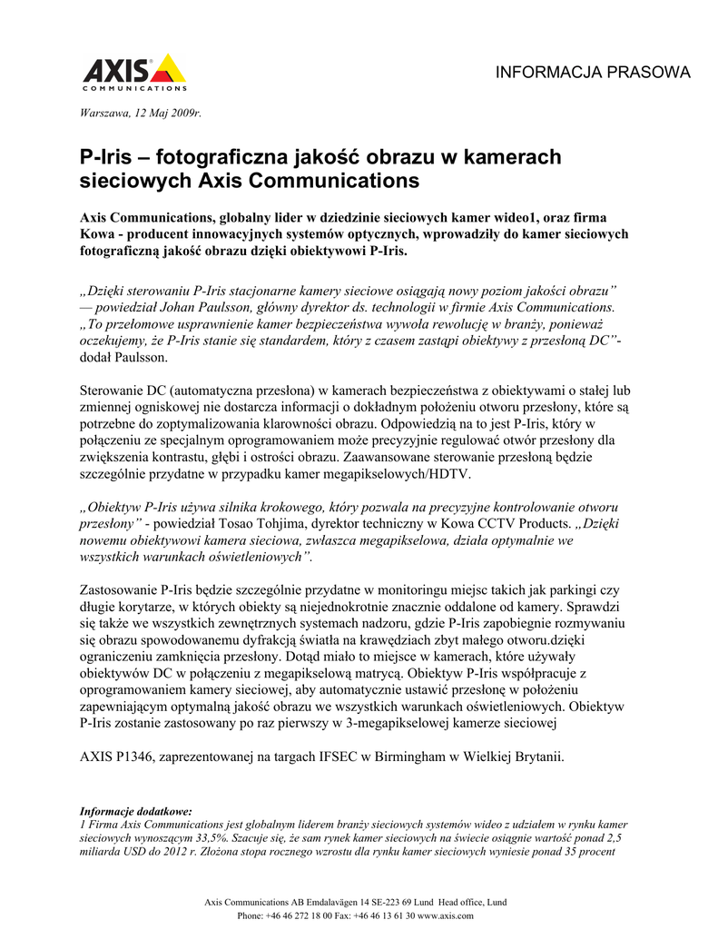 INFORMACJA PRASOWA Warszawa, 12 Maj 2009r. P-Iris – fotograficzna jakość obrazu w kamerach sieciowych Axis Communications Axis Communications, globalny lider w dziedzinie sieciowych kamer wideo1, oraz firma Kowa - producent innowacyjnych systemów optycznych, wprowadziły do kamer sieciowych fotograficzną jakość obrazu dzięki obiektywowi P-Iris. „Dzięki sterowaniu P-Iris stacjonarne kamery sieciowe osiągają nowy poziom jakości obrazu” — powiedział Johan Paulsson, główny dyrektor ds. technologii w firmie Axis Communications. „To przełomowe usprawnienie kamer bezpieczeństwa wywoła rewolucję w branży, ponieważ oczekujemy, że P-Iris stanie się standardem, który z czasem zastąpi obiektywy z przesłoną DC”dodał Paulsson. Sterowanie DC (automatyczna przesłona) w kamerach bezpieczeństwa z obiektywami o stałej lub zmiennej ogniskowej nie dostarcza informacji o dokładnym położeniu otworu przesłony, które są potrzebne do zoptymalizowania klarowności obrazu. Odpowiedzią na to jest P-Iris, który w połączeniu ze specjalnym oprogramowaniem może precyzyjnie regulować otwór przesłony dla zwiększenia kontrastu, głębi i ostrości obrazu. Zaawansowane sterowanie przesłoną będzie szczególnie przydatne w przypadku kamer megapikselowych/HDTV. „Obiektyw P-Iris używa silnika krokowego, który pozwala na precyzyjne kontrolowanie otworu przesłony” - powiedział Tosao Tohjima, dyrektor techniczny w Kowa CCTV Products. „Dzięki nowemu obiektywowi kamera sieciowa, zwłaszca megapikselowa, działa optymalnie we wszystkich warunkach oświetleniowych”. Zastosowanie P-Iris będzie szczególnie przydatne w monitoringu miejsc takich jak parkingi czy długie korytarze, w których obiekty są niejednokrotnie znacznie oddalone od kamery. Sprawdzi się także we wszystkich zewnętrznych systemach nadzoru, gdzie P-Iris zapobiegnie rozmywaniu się obrazu spowodowanemu dyfrakcją światła na krawędziach zbyt małego otworu.dzięki ograniczeniu zamknięcia przesłony. Dotąd miało to miejsce w kamerach, które używały obiektywów DC w połączeniu z megapikselową matrycą. Obiektyw P-Iris współpracuje z oprogramowaniem kamery sieciowej, aby automatycznie ustawić przesłonę w położeniu zapewniającym optymalną jakość obrazu we wszystkich warunkach oświetleniowych. Obiektyw P-Iris zostanie zastosowany po raz pierwszy w 3-megapikselowej kamerze sieciowej AXIS P1346, zaprezentowanej na targach IFSEC w Birmingham w Wielkiej Brytanii. Informacje dodatkowe: 1 Firma Axis Communications jest globalnym liderem branży sieciowych systemów wideo z udziałem w rynku kamer sieciowych wynoszącym 33,5%. Szacuje się, że sam rynek kamer sieciowych na świecie osiągnie wartość ponad 2,5 miliarda USD do 2012 r. Złożona stopa rocznego wzrostu dla rynku kamer sieciowych wyniesie ponad 35 procent Axis Communications AB Emdalavägen 14 SE-223 69 Lund Head office, Lund Phone: +46 46 272 18 00 Fax: +46 46 13 61 30 www.axis.com rocznie w okresie kolejnych pięciu lat, zgodnie z prognozami opublikowanymi przez ośrodek IMSResearch ( www.imsresearch.com) w swoim najnowszym raporcie zatytułowanym ‘Światowy Rynek Urządzeń CCTV i Wideo służących do Monitoringu - wydanie 2008’, opublikowanym w listopadzie 2008 r. O firmie Axis: Axis jest szwedzką firmą IT oferującą sieciowe rozwiązania wideo do profesjonalnych instalacji. Firma jest światowym liderem w dziedzinie sieciowego nadzoru wideo i promuje przechodzenie z systemów nadzoru analogowego na cyfrowy. Produkty i rozwiązania firmy Axis skupiają się na nadzorze i monitorowaniu zdalnym. Są one oparte na innowacyjnych, otwartych platformach technologicznych. Axis jest firmą szwedzką, posiadającą biura w 20 krajach i współpracującą z partnerami w ponad 70 krajach. Firma została założona w 1984 r. i jest notowana jest na giełdzie NASDAQ OMX w Sztokholmie, a jej symbol to AXIS. Więcej informacji o firmie Axis można znaleźć na stronie www.axis.com. Kowa Company, Ltd. — informacje Firma Kowa, założona w 1894 roku w Japonii, z biegiem lat zaczęła działać na skalę międzynarodową, aktywnie angażując się w produkcję i handel farmaceutykami, tekstyliami, optoelektroniką i produktami konsumenckimi. Kowa produkuje wysokiej jakości obiektywy CCTV od niemal 60 lat. Więcej informacji o Kowa można znaleźć pod adresem has grown www.kowa.co.jp Więcej informacji o firmie Axis udziela: Edwin Roobol Country Manager Tel.: +49 811 555 080 E-mail: [email protected] Kontakt dla prasy w Polsce: Kamila Wierzbicka Mmd Corporate, Public Affairs & Public Relations Consultants Poland Tel.: +48 22 536 04 69 Tel. kom.: +48 0 607 104 648 E-mail: [email protected] Axis Communications AB Emdalavägen 14 SE-223 69 Lund Head office, Lund Phone: +46 46 272 18 00 Fax: +46 46 13 61 30 www.axis.com