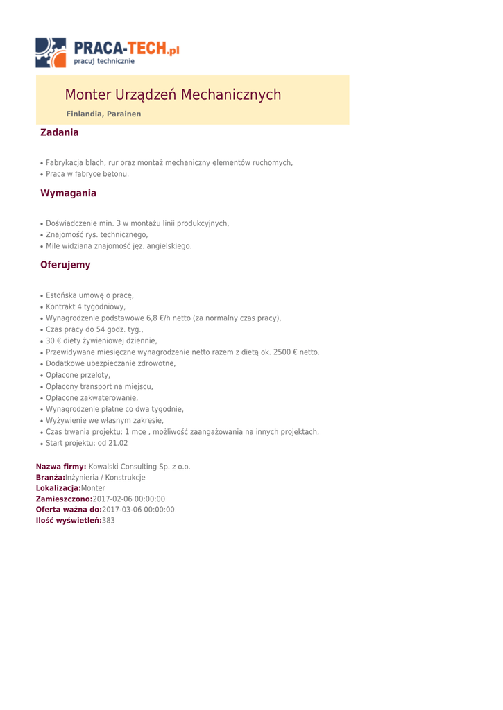 Monter Urządzeń Mechanicznych Finlandia, Parainen Zadania ● ● Fabrykacja blach, rur oraz montaż mechaniczny elementów ruchomych, Praca w fabryce betonu. Wymagania ● ● ● Doświadczenie min. 3 w montażu linii produkcyjnych, Znajomość rys. technicznego, Mile widziana znajomość jęz. angielskiego. Oferujemy ● ● ● ● ● ● ● ● ● ● ● ● ● ● Estońska umowę o pracę, Kontrakt 4 tygodniowy, Wynagrodzenie podstawowe 6,8 €/h netto (za normalny czas pracy), Czas pracy do 54 godz. tyg., 30 € diety żywieniowej dziennie, Przewidywane miesięczne wynagrodzenie netto razem z dietą ok. 2500 € netto. Dodatkowe ubezpieczanie zdrowotne, Opłacone przeloty, Opłacony transport na miejscu, Opłacone zakwaterowanie, Wynagrodzenie płatne co dwa tygodnie, Wyżywienie we własnym zakresie, Czas trwania projektu: 1 mce , możliwość zaangażowania na innych projektach, Start projektu: od 21.02 Nazwa firmy: Kowalski Consulting Sp. z o.o. Branża:Inżynieria / Konstrukcje Lokalizacja:Monter Zamieszczono:2017-02-06 00:00:00 Oferta ważna do:2017-03-06 00:00:00 Ilość wyświetleń:383