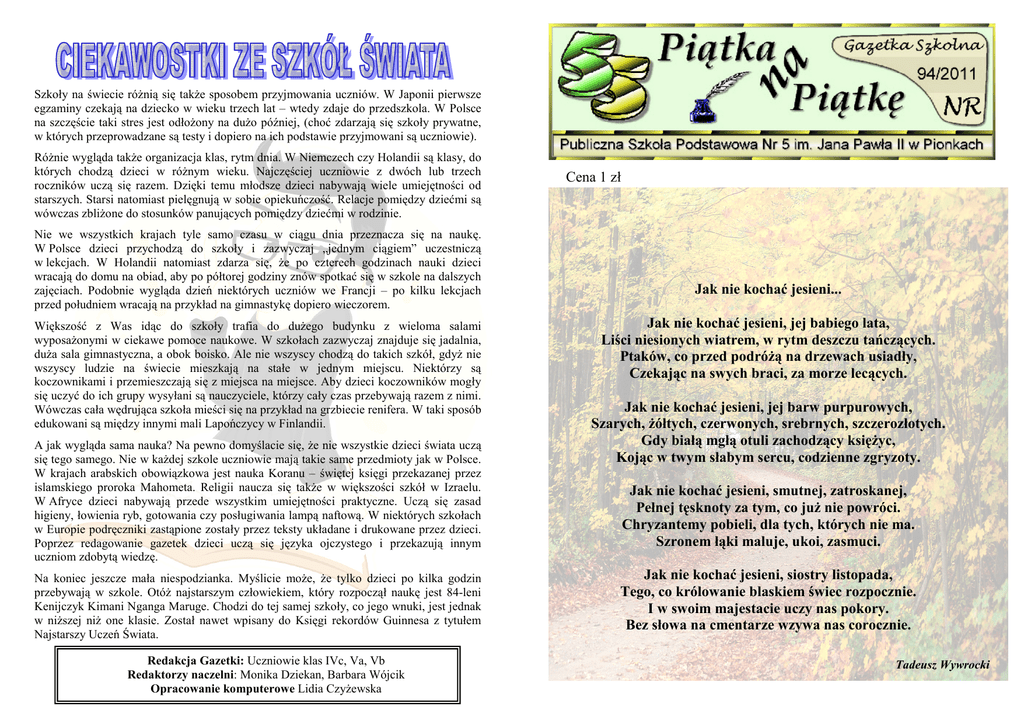 Szkoły na świecie różnią się także sposobem przyjmowania uczniów. W Japonii pierwsze egzaminy czekają na dziecko w wieku trzech lat – wtedy zdaje do przedszkola. W Polsce na szczęście taki stres jest odłożony na dużo później, (choć zdarzają się szkoły prywatne, w których przeprowadzane są testy i dopiero na ich podstawie przyjmowani są uczniowie). Różnie wygląda także organizacja klas, rytm dnia. W Niemczech czy Holandii są klasy, do których chodzą dzieci w różnym wieku. Najczęściej uczniowie z dwóch lub trzech roczników uczą się razem. Dzięki temu młodsze dzieci nabywają wiele umiejętności od starszych. Starsi natomiast pielęgnują w sobie opiekuńczość. Relacje pomiędzy dziećmi są wówczas zbliżone do stosunków panujących pomiędzy dziećmi w rodzinie. Nie we wszystkich krajach tyle samo czasu w ciągu dnia przeznacza się na naukę. W Polsce dzieci przychodzą do szkoły i zazwyczaj „jednym ciągiem” uczestniczą w lekcjach. W Holandii natomiast zdarza się, że po czterech godzinach nauki dzieci wracają do domu na obiad, aby po półtorej godziny znów spotkać się w szkole na dalszych zajęciach. Podobnie wygląda dzień niektórych uczniów we Francji – po kilku lekcjach przed południem wracają na przykład na gimnastykę dopiero wieczorem. Większość z Was idąc do szkoły trafia do dużego budynku z wieloma salami wyposażonymi w ciekawe pomoce naukowe. W szkołach zazwyczaj znajduje się jadalnia, duża sala gimnastyczna, a obok boisko. Ale nie wszyscy chodzą do takich szkół, gdyż nie wszyscy ludzie na świecie mieszkają na stałe w jednym miejscu. Niektórzy są koczownikami i przemieszczają się z miejsca na miejsce. Aby dzieci koczowników mogły się uczyć do ich grupy wysyłani są nauczyciele, którzy cały czas przebywają razem z nimi. Wówczas cała wędrująca szkoła mieści się na przykład na grzbiecie renifera. W taki sposób edukowani są między innymi mali Lapończycy w Finlandii. A jak wygląda sama nauka? Na pewno domyślacie się, że nie wszystkie dzieci świata uczą się tego samego. Nie w każdej szkole uczniowie mają takie same przedmioty jak w Polsce. W krajach arabskich obowiązkowa jest nauka Koranu – świętej księgi przekazanej przez islamskiego proroka Mahometa. Religii naucza się także w większości szkół w Izraelu. W Afryce dzieci nabywają przede wszystkim umiejętności praktyczne. Uczą się zasad higieny, łowienia ryb, gotowania czy posługiwania lampą naftową. W niektórych szkołach w Europie podręczniki zastąpione zostały przez teksty układane i drukowane przez dzieci. Poprzez redagowanie gazetek dzieci uczą się języka ojczystego i przekazują innym uczniom zdobytą wiedzę. Na koniec jeszcze mała niespodzianka. Myślicie może, że tylko dzieci po kilka godzin przebywają w szkole. Otóż najstarszym człowiekiem, który rozpoczął naukę jest 84-leni Kenijczyk Kimani Nganga Maruge. Chodzi do tej samej szkoły, co jego wnuki, jest jednak w niższej niż one klasie. Został nawet wpisany do Księgi rekordów Guinnesa z tytułem Najstarszy Uczeń Świata. Redakcja Gazetki: Uczniowie klas IVc, Va, Vb Redaktorzy naczelni: Monika Dziekan, Barbara Wójcik Opracowanie komputerowe Lidia Czyżewska Cena 1 zł Jak nie kochać jesieni... Jak nie kochać jesieni, jej babiego lata, Liści niesionych wiatrem, w rytm deszczu tańczących. Ptaków, co przed podróżą na drzewach usiadły, Czekając na swych braci, za morze lecących. Jak nie kochać jesieni, jej barw purpurowych, Szarych, żółtych, czerwonych, srebrnych, szczerozłotych. Gdy białą mgłą otuli zachodzący księżyc, Kojąc w twym słabym sercu, codzienne zgryzoty. Jak nie kochać jesieni, smutnej, zatroskanej, Pełnej tęsknoty za tym, co już nie powróci. Chryzantemy pobieli, dla tych, których nie ma. Szronem łąki maluje, ukoi, zasmuci. Jak nie kochać jesieni, siostry listopada, Tego, co królowanie blaskiem świec rozpocznie. I w swoim majestacie uczy nas pokory. Bez słowa na cmentarze wzywa nas corocznie. Tadeusz Wywrocki Maria Salomea Skłodowska-Curie (ur. 7 listopada 1867 w Warszawie, zm. 4 lipca 1934 w Passy) – wywodząca się z Polski (z Królestwa Polskiego) francuska uczona, fizyczka i chemiczka, dwukrotna noblistka. Większość życia spędziła we Francji, tam też rozwinęła swoją karierę naukową. Prekursorka nowej gałęzi chemii – radiochemii. Do jej dokonań należą: opracowanie teorii promieniotwórczości, technik rozdzielania izotopów promieniotwórczych oraz odkrycie dwóch nowych pierwiastków – radu i polonu. Pod jej osobistym kierunkiem prowadzono też pierwsze badania nad leczeniem raka za pomocą promieniotwórczości. Dwukrotnie wyróżniona Nagrodą Nobla za osiągnięcia naukowe, po raz pierwszy w 1903 z fizyki wraz z mężem i Henrim Becquerelem za badania nad odkrytym przez Becquerela zjawiskiem promieniotwórczości, po raz drugi w 1911 z chemii za wydzielenie czystego radu. Do dziś (maj 2011) pozostaje jedyną kobietą, która tę nagrodę otrzymała dwukrotnie, a także jedynym uczonym w historii uhonorowanym Nagrodą Nobla w dwóch różnych dziedzinach nauk przyrodniczych. Zapewne wiesz, że najważniejszym celem szkoły jest nauczanie. Chcesz, żeby ten rok był lepszy od poprzedniego? Pragniesz uniknąć błędów? Skoncentruj, więc swoją uwagę, wszystkie szare komórki i szczere chęci na pilnej nauce. Staraj się tak uczyć, by się rozwijać, by poszerzać swoje horyzonty. Nieodzowną cechą ucznia jest także dobre zachowanie. W szkole nauczyciele, cały szkolny personel, wszyscy ludzie zasługują na szacunek. Bądź uprzejmy wobec wszystkich! − Nie żałuj zwrotów typu: dzień dobry, do widzenia, dziękuję, proszę, przepraszam! − Jeśli oczekujesz pomocy od innych, to każdego grzecznie poproś i podziękuj mu! Uczniowskie mini rady: *Uważaj na lekcjach, ćwicz umysł w dyskusjach klasowych. *Odrabiaj prace domowe. *
