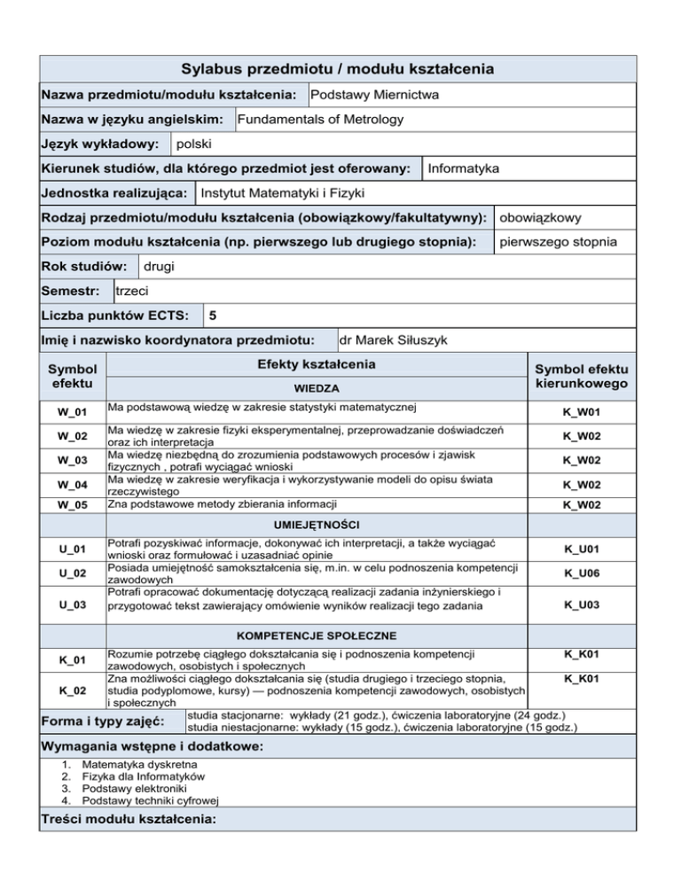 Sylabus przedmiotu / modułu kształcenia Nazwa przedmiotu/modułu kształcenia: Podstawy Miernictwa Nazwa w języku angielskim: Język wykładowy: Fundamentals of Metrology polski Kierunek studiów, dla którego przedmiot jest oferowany: Informatyka Jednostka realizująca: Instytut Matematyki i Fizyki Rodzaj przedmiotu/modułu kształcenia (obowiązkowy/fakultatywny): obowiązkowy Poziom modułu kształcenia (np. pierwszego lub drugiego stopnia): Rok studiów: Semestr: drugi trzeci Liczba punktów ECTS: 5 Imię i nazwisko koordynatora przedmiotu: W_02 W_03 W_04 W_05 dr Marek Siłuszyk Efekty kształcenia Symbol efektu W_01 pierwszego stopnia WIEDZA Ma podstawową wiedzę w zakresie statystyki matematycznej Ma wiedzę w zakresie fizyki eksperymentalnej, przeprowadzanie doświadczeń oraz ich interpretacja Ma wiedzę niezbędną do zrozumienia podstawowych procesów i zjawisk fizycznych , potrafi wyciągać wnioski Ma wiedzę w zakresie weryfikacja i wykorzystywanie modeli do opisu świata rzeczywistego Zna podstawowe metody zbierania informacji Symbol efektu kierunkowego K_W01 K_W02 K_W02 K_W02 K_W02 UMIEJĘTNOŚCI U_01 U_02 U_03 Potrafi pozyskiwać informacje, dokonywać ich interpretacji, a także wyciągać wnioski oraz formułować i uzasadniać opinie Posiada umiejętność samokształcenia się, m.in. w celu podnoszenia kompetencji zawodowych Potrafi opracować dokumentację dotyczącą realizacji zadania inżynierskiego i przygotować tekst zawierający omówienie wyników realizacji tego zadania K_U01 K_U06 K_U03 KOMPETENCJE SPOŁECZNE K_K01 Rozumie potrzebę ciągłego dokształcania się i podnoszenia kompetencji zawodowych, osobistych i społecznych K_K01 Zna możliwości ciągłego dokształcania się (studia drugiego i trzeciego stopnia, K_02 studia podyplomowe, kursy) — podnoszenia kompetencji zawodowych, osobistych i społecznych studia stacjonarne: wykłady (21 godz.), ćwiczenia laboratoryjne (24 godz.) Forma i typy zajęć: studia niestacjonarne: wykłady (15 godz.), ćwiczenia laboratoryjne (15 godz.) K_01 Wymagania wstępne i dodatkowe: 1. 2. 3. 4. Matematyka dyskretna Fizyka dla Informatyków Podstawy elektroniki Podstawy techniki cyfrowej Treści modułu kształcenia: 1. System jednostek SI. jednostki pochodne, krotność jednostek, wzorce jednostek elektrycznych i czasu, organizacja działania GUM 2. Elementy teorii błędów. źródła i rodzaje błędów, statystyczna metoda szacowania błędów/niepewności , rozkład błędów Gaussa, szacowanie błędów/ niepewności metodą różniczki zupełnej, 3. Podstawowe mierniki analogowe. zakres pomiarowy, elektromechaniczne, inne typy mierników analogowych rozdzielczość i klasa przyrządu, mierniki 4. Mostki i układy kompensacyjne mostek stało i zmiennoprądowy, układy kompensacyjne i komparacyjne 5. Pomiary cyfrowe przetwarzanie analogowo-cyfrowe, przetwarzanie cyfrowo-analogowe, woltomierz cyfrowy i multimetr 6. Mierniki częstotliwości i generatory funkcyjne. mierniki częstotliwości, pomiary czasu, generatory funkcyjne 7. Oscyloskopy działanie oscyloskopu zarejestrowanych przebiegów analogowego, oscyloskop cyfrowy, analiza matematyczna 8. Czujniki klasyczne: pomiary wielkości nieelektrycznych, tensometry, czujniki akustyczne i temperaturowe 9. Detektory. fale akustyczne i elektromagnetyczne, detektory ultradźwiękowe, detektory optyczne 10. Komputerowe systemy pomiarowe. czujniki inteligentne, rejestratory, interfejsy 11. Komputerowe systemy pomiarowe c.d. karty komputerowe i programy pomiarowe Literatura podstawowa: 1. J. Taylor, Wstęp do analizy błędu pomiarowego, PWN, Warszawa 2011. 2. J. Dusza, Podstawy miernictwa, Wyd. PW , Warszawa, 2007 Literatura dodatkowa: 1. A. Marcyniuk, Podstawy miernictwa elektrycznego, Wyd. Pol. Śl., Gliwice, 2002. 2. W. Nawrocki, Komputerowe systemy pomiarowe, WKŁ, Warszawa 2007. 3. S. Tumański, Technika pomiarowa, WNT, Warszawa 2007. 4. J. Parchański, Miernictwo Elektryczne i Elektroniczne, WSiP, Warszawa, 1995 Planowane formy/działania/metody dydaktyczne: Wykład z zastosowaniem technik multimedialnych, ćwiczenia laboratoryjne w pracowni miernictwa, wykonywanie doświadczeń w formie wirtualnej oraz praktycznych. Zamieszczanie na stronach internetowych problemów i zadań laboratoryjnych Sposoby weryfikacji efektów kształcenia osiąganych przez studenta: Efekt W_02 będzie sprawdzany na egzaminie pisemnym. Na egzaminie pisemnym zadania będą dotyczyły wybranych problemów miernictwa, przykładowe zadania: • określanie niepewności pomiarów danych stablicowanych, • budowa mierników, oscyloskopu • zastosowanie mostków i układów kompensacyjnych • symulacja doświadczeń, • pomiar wielkości nieelektrycznych, Efekt U_01 i U_06 będzie systematycznie sprawdzany na zajęciach. Zadania na następne laboratorium muszą być dostępne co najmniej tydzień przed zajęciami. Student, na podstawie podanej literatury, musi się do nich samodzielnie lub korzystając z konsultacji przygotować. Materiały do zajęć - instrukcje laboratoryjne będą zamieszczanie na stronach internetowych. Efekt K_01 będzie weryfikowane, w oparciu o posiadaną wiedzę i umiejętności w czasie zajęć laboratoryjnych, a także będą sprawdzane na egzaminie. Forma i warunki zaliczenia: Moduł kończy się zaliczeniem z oceną. Ocena końcowa jest wystawiana na podstawie zajęć laboratoryjnych i jednego kolokwium pisemnego przeprowadzonego na ostatnim wykładzie. Na zaliczenie laboratorium składają się oceny cząstkowe uzyskane na regularnych zajęciach z nauczycielem akademickim oraz z samodzielnie wykonanego zadania indywidualnego według schematu: Regularne zajęcia – 39 pkt., Obrona zadania indywidualnego – 21 pkt. Zajęcia laboratoryjne będą zaliczone w wypadku uzyskania co najmniej połowy punktów z poszczególnych form aktywności studenta: regularne zajęcia – co najmniej 20 pkt., obrona indywidualnego zadania – co najmniej 10 pkt. Na tej formie