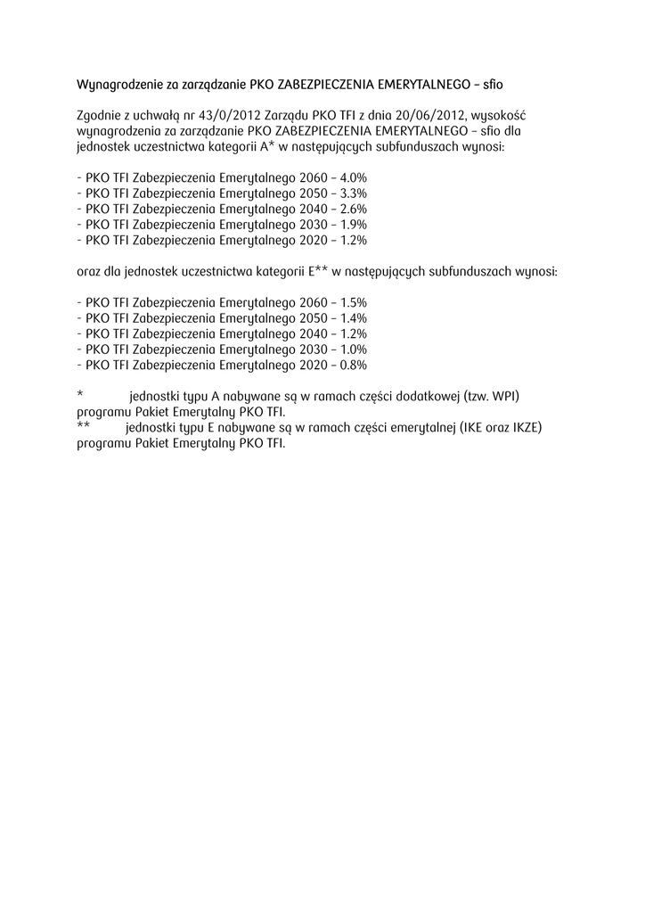 Wynagrodzenie za zarządzanie PKO ZABEZPIECZENIA EMERYTALNEGO – sfio Zgodnie z uchwałą nr 43/0/2012 Zarządu PKO TFI z dnia 20/06/2012, wysokość wynagrodzenia za zarządzanie PKO ZABEZPIECZENIA EMERYTALNEGO – sfio dla jednostek uczestnictwa kategorii A* w następujących subfunduszach wynosi: - PKO TFI Zabezpieczenia Emerytalnego 2060 – 4.0% - PKO TFI Zabezpieczenia Emerytalnego 2050 – 3.3% - PKO TFI Zabezpieczenia Emerytalnego 2040 – 2.6% - PKO TFI Zabezpieczenia Emerytalnego 2030 – 1.9% - PKO TFI Zabezpieczenia Emerytalnego 2020 – 1.2% oraz dla jednostek uczestnictwa kategorii E** w następujących subfunduszach wynosi: - PKO TFI Zabezpieczenia Emerytalnego 2060 – 1.5% - PKO TFI Zabezpieczenia Emerytalnego 2050 – 1.4% - PKO TFI Zabezpieczenia Emerytalnego 2040 – 1.2% - PKO TFI Zabezpieczenia Emerytalnego 2030 – 1.0% - PKO TFI Zabezpieczenia Emerytalnego 2020 – 0.8% * jednostki typu A nabywane są w ramach części dodatkowej (tzw. WPI) programu Pakiet Emerytalny PKO TFI. ** jednostki typu E nabywane są w ramach części emerytalnej (IKE oraz IKZE) programu Pakiet Emerytalny PKO TFI.