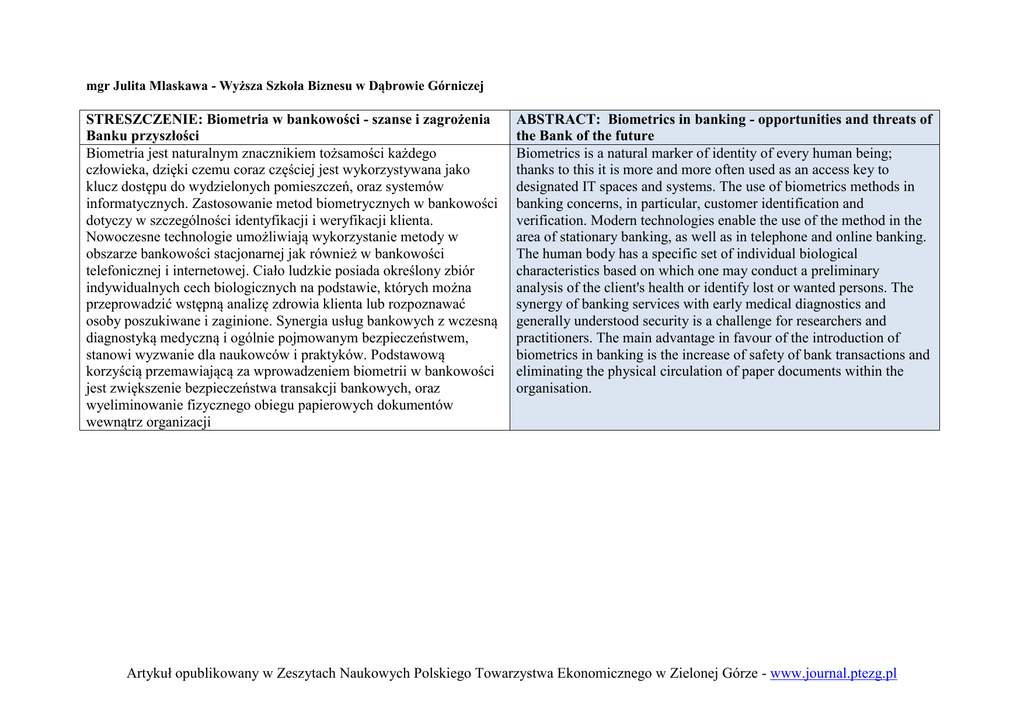 mgr Julita Mlaskawa - Wyższa Szkoła Biznesu w Dąbrowie Górniczej STRESZCZENIE: Biometria w bankowości - szanse i zagrożenia Banku przyszłości Biometria jest naturalnym znacznikiem tożsamości każdego człowieka, dzięki czemu coraz częściej jest wykorzystywana jako klucz dostępu do wydzielonych pomieszczeń, oraz systemów informatycznych. Zastosowanie metod biometrycznych w bankowości dotyczy w szczególności identyfikacji i weryfikacji klienta. Nowoczesne technologie umożliwiają wykorzystanie metody w obszarze bankowości stacjonarnej jak również w bankowości telefonicznej i internetowej. Ciało ludzkie posiada określony zbiór indywidualnych cech biologicznych na podstawie, których można przeprowadzić wstępną analizę zdrowia klienta lub rozpoznawać osoby poszukiwane i zaginione. Synergia usług bankowych z wczesną diagnostyką medyczną i ogólnie pojmowanym bezpieczeństwem, stanowi wyzwanie dla naukowców i praktyków. Podstawową korzyścią przemawiającą za wprowadzeniem biometrii w bankowości jest zwiększenie bezpieczeństwa transakcji bankowych, oraz wyeliminowanie fizycznego obiegu papierowych dokumentów wewnątrz organizacji ABSTRACT: Biometrics in banking - opportunities and threats of the Bank of the future Biometrics is a natural marker of identity of every human being; thanks to this it is more and more often used as an access key to designated IT spaces and systems. The use of biometrics methods in banking concerns, in particular, customer identification and verification. Modern technologies enable the use of the method in the area of stationary banking, as well as in telephone and online banking. The human body has a specific set of individual biological characteristics based on which one may conduct a preliminary analysis of the client's health or identify lost or wanted persons. The synergy of banking services with early medical diagnostics and generally understood security is a challenge for researchers and practitioners. The main advantage in favour of the introduction of biometrics in banking is the increase of safety of bank transactions and eliminating the physical circulation of paper documents within the organisation. Artykuł opublikowany w Zeszytach Naukowych Polskiego Towarzystwa Ekonomicznego w Zielonej Górze - www.journal.ptezg.pl