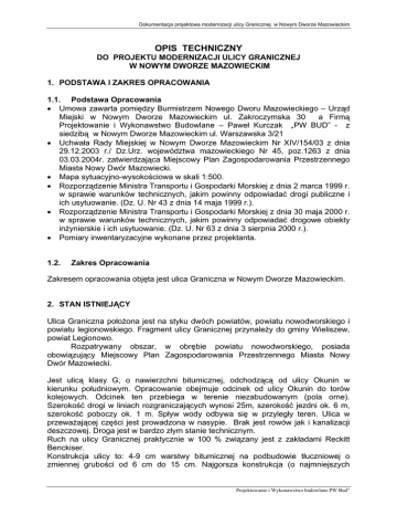 Dokumentacja projektowa modernizacji ulicy Granicznej w Nowym Dworze Mazowieckim OPIS TECHNICZNY DO PROJEKTU MODERNIZACJI ULICY GRANICZNEJ W NOWYM DWORZE MAZOWIECKIM 1. PODSTAWA I ZAKRES OPRACOWANIA 1.1. Podstawa Opracowania • Umowa zawarta pomiędzy Burmistrzem Nowego Dworu Mazowieckiego – Urząd Miejski w Nowym Dworze Mazowieckim ul. Zakroczymska 30 a Firmą Projektowanie i Wykonawstwo Budowlane – Paweł Kurczak „PW BUD” - z siedzibą w Nowym Dworze Mazowieckim ul. Warszawska 3/21 • Uchwała Rady Miejskiej w Nowym Dworze Mazowieckim Nr XIV/154/03 z dnia 29.12.2003 r./ Dz.Urz. województwa mazowieckiego Nr 45, poz.1263 z dnia 03.03.2004r. zatwierdzająca Miejscowy Plan Zagospodarowania Przestrzennego Miasta Nowy Dwór Mazowiecki. • Mapa sytuacyjno-wysokościowa w skali 1:500. • Rozporządzenie Ministra Transportu i Gospodarki Morskiej z dnia 2 marca 1999 r. w sprawie warunków technicznych, jakim powinny odpowiadać drogi publiczne i ich usytuowanie. (Dz. U. Nr 43 z dnia 14 maja 1999 r.). • Rozporządzenie Ministra Transportu i Gospodarki Morskiej z dnia 30 maja 2000 r. w sprawie warunków technicznych, jakim powinny odpowiadać drogowe obiekty inżynierskie i ich usytuowanie. (Dz. U. Nr 63 z dnia 3 sierpnia 2000 r.). • Pomiary inwentaryzacyjne wykonane przez projektanta. 1.2. Zakres Opracowania Zakresem opracowania objęta jest ulica Graniczna w Nowym Dworze Mazowieckim. 2. STAN ISTNIEJĄCY Ulica Graniczna położona jest na styku dwóch powiatów, powiatu nowodworskiego i powiatu legionowskiego. Fragment ulicy Granicznej przynależy do gminy Wieliszew, powiat Legionowo. Rozpatrywany obszar, w obrębie powiatu nowodworskiego, posiada obowiązujący Miejscowy Plan Zagospodarowania Przestrzennego Miasta Nowy Dwór Mazowiecki. Jest ulicą klasy G, o nawierzchni bitumicznej, odchodzącą od ulicy Okunin w kierunku południowym. Opracowanie obejmuje odcinek od ulicy Okunin do torów kolejowych. Odcinek ten przebiega w terenie niezabudowanym (pola orne). Szerokość drogi w liniach rozgraniczających wynosi 25m, szerokość jezdni ok. 6 m, szerokość poboczy ok. 1 m. Spływ wody odbywa się w przyległy teren. Ulica w przeważającej części jest prowadzona w nasypie. Brak jest rowów jak i kanalizacji deszczowej. Droga jest w bardzo złym stanie technicznym. Ruch na ulicy Granicznej praktycznie w 100 % związany jest z zakładami Reckitt Benckiser. Konstrukcja ulicy to: 4-9 cm warstwy bitumicznej na podbudowie tłuczniowej o zmiennej grubości od 6 cm do 15 cm. Najgorsza konstrukcja (o najmniejszych Projektowanie i Wykonawstwo budowlane PW Bud” Dokumentacja projektowa modernizacji ulicy Granicznej w Nowym Dworze Mazowieckim grubościach warstw występuje na odcinku bezpośrednio przylegającym do ulicy Okunin – droga wojewódzka nr 631. Warunki gruntowo-wodne zaliczyć można do prostych. Pod warstwą gruntów nasypowych (głównie gruntów piaszczystych) oraz pod warstwą humusu – występują wyłącznie grunty niespoiste (piaszczyste), zasadniczo o uziarnieniu piasków średnich oraz piasków drobnych. W gruntach piaszczystych do głębokości 3,0-3,5 m p.p.t. – za wyjątkiem jednego otworu badawczego nie nawiercono poziomu wód gruntowych. W jednym otworze poziom wód gruntowych stabilizował się na głębokości 2,8 m p.p.t. Generalizując – w obszarach objętych badaniami występują głównie grunty o dobrych właściwościach wodoprzepuszczalnych. 3. ROZWIĄZANIA PROJEKTOWE 3. 1. Parametry Projektowe Parametry projektowe przyjęto w oparciu o Rozporządzenie Ministra Transportu i Gospodarki Morskiej z dnia 2 marca 1999 roku w sprawie Warunków Technicznych jakim powinny odpowiadać drogi publiczne i ich usytuowanie (Dz. Ustaw Rz. P. Nr 43 z dnia 14.05.1999 r), biorąc pod uwagę warunki wynikające z ustaleń miejscowego planu zagospodarowania przestrzennego. 3.2. Rozwiązania sytuacyjne i wysokościowe 3.2.1 W ciągu ulicy Granicznej: · projektuje się wykonać poszerzenie ulicy z obecnych 6 m do 7 m. · poszerzenie dokonane będzie po jednej stronie ulicy- po stronie prawej idąc zgodnie z pikietażem · przewiduje się modernizację jezdni poprzez zdjęcie warstw istniejących, dogęszczenie podłoża, wykonanie mieszanki mineralno-cementowo-emulsyjnej na dolną warstwę podbudowy z wykorzystaniem destruktu i materiału z rozbiórki podbudowy tłuczniowej, a następnie ułożenie warstw bitumicznych · w związku z wykonaniem nowych nakładek bitumicznych rzędne wysokościowe drogi zwiększą się o ok. 26 cm na odcinku przechodzącym przez pola orne (na odcinku zakładów Reckitt Benckiser pozostaną bez istotnych zmian) · pochylenie poprzeczne jezdni na odcinku prostym wynosi 2.0 % jednostronnie w stronę poszerzaną, a przy zakładach przewiduję się wykonać jako daszkowe. · pochylenie poprzeczne jezdni na łuku jest jednostronne 3,5%. · przewiduje się usunąć 3 drzewa, zlokalizowane w środkowym odcinku ulicy Granicznej, po lewej stronie. W sąsiedztwie zakładów przwiduje się wykonanie lokalnych korekt rzędnych wjazdów w celu dopasowania do nowoprojektowanej jezdni. Istniejąca podbudowa wjazdów winna być jeśli to możliwe tylko adoptowana (lokalne korekty rzędnych) Projektowanie i Wykonawstwo budowlane PW Bud” Dokumentacja projektowa modernizacji ulicy Granicznej w Nowym Dworze Mazowieckim 3.2.2 Projektowane włączenie do ulicy Okunin należy wykonać zgodnie z uzgodnieniami z zarządcą drogi wojewódzkiej nr 631 ( uzgodnienia załączone w części uzgodnieniowej niniejszej dokumentacji). Krawężnik na łuku lewym (patrząc zgodnie z pikietażem) wykonać jako wtopiony w celu odprowadzenia wody. Pobocze gruntowe należy umocnić kruszywem naturalnym. Na grubości warstwy ścieralnej należy przy połączeniu ulicy Granicznej z ulicą Okunin wykonać zakład na szerokości 30 cm w ciągu ulicy wojewódzkiej. (patrz. Rysunek Szczegóły konstrukcyjne) 3.2.3 Przy projektowaniu niwelety uwzględniono następujące wymogi: 