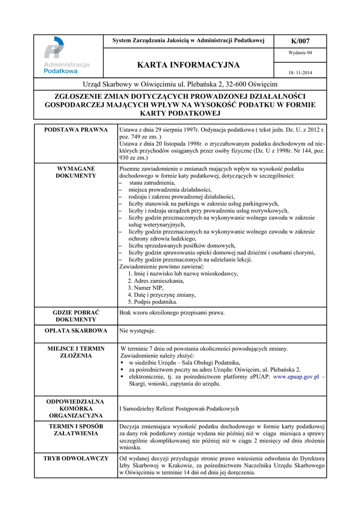 System Zarządzania Jakością w Administracji Podatkowej K/007 Wydanie 04 KARTA INFORMACYJNA 18- 11-2014 Urząd Skarbowy w Oświęcimiu ul. Plebańska 2, 32-600 Oświęcim ZGŁOSZENIE ZMIAN DOTYCZĄCYCH PROWADZONEJ DZIAŁALNOŚCI GOSPODARCZEJ MAJĄCYCH WPŁYW NA WYSOKOŚĆ PODATKU W FORMIE KARTY PODATKOWEJ PODSTAWA PRAWNA WYMAGANE DOKUMENTY GDZIE POBRAĆ DOKUMENTY OPŁATA SKARBOWA MIEJSCE I TERMIN ZŁOŻENIA ODPOWIEDZIALNA KOMÓRKA ORGANIZACYJNA Ustawa z dnia 29 sierpnia 1997r. Ordynacja podatkowa ( tekst jedn. Dz. U. z 2012 r. poz. 749 ze zm. ) Ustawa z dnia 20 listopada 1998r. o zryczałtowanym podatku dochodowym od niektórych przychodów osiąganych przez osoby fizyczne (Dz. U z 1998r. Nr 144, poz. 930 ze zm.) Pisemne zawiadomienie o zmianach mających wpływ na wysokość podatku dochodowego w formie katy podatkowej, dotyczących w szczególności: – stanu zatrudnienia, – miejsca prowadzenia działalności, – rodzaju i zakresu prowadzonej działalności, – liczby stanowisk na parkingu w zakresie usług parkingowych, – liczby i rodzaju urządzeń przy prowadzeniu usług rozrywkowych, – liczby godzin przeznaczonych na wykonywanie wolnego zawodu w zakresie usług weterynaryjnych, – liczby godzin przeznaczonych na wykonywanie wolnego zawodu w zakresie ochrony zdrowia ludzkiego, – liczba sprzedawanych posiłków domowych, – liczby godzin sprawowania opieki domowej nad dziećmi i osobami chorymi, – liczby godzin przeznaczonych na udzielanie lekcji. Zawiadomienie powinno zawierać: 1. Imię i nazwisko lub nazwę wnioskodawcy, 2. Adres zamieszkania, 3. Numer NIP, 4. Datę i przyczynę zmiany, 5. Podpis podatnika. Brak wzoru określonego przepisami prawa. Nie występuje. W terminie 7 dniu od powstania okoliczności powodujących zmiany. Zawiadomienie należy złożyć: w siedzibie Urzędu – Sala Obsługi Podatnika, za pośrednictwem poczty na adres Urzędu: Oświęcim, ul. Plebańska 2. elektronicznie, tj. za pośrednictwem platformy ePUAP: www.epuap.gov.pl – Skargi, wnioski, zapytania do urzędu. I Samodzielny Referat Postępowań Podatkowych TERMIN I SPOSÓB ZAŁATWIENIA Decyzja zmieniająca wysokość podatku dochodowego w formie karty podatkowej za dany rok podatkowy zostaje wydana nie później niż w ciągu miesiąca a sprawy szczególnie skomplikowanej nie później niż w ciągu 2 miesięcy od dnia złożenia wniosku. TRYB ODWOŁAWCZY Od wydanej decyzji przysługuje stronie prawo wniesienia odwołania do Dyrektora Izby Skarbowej w Krakowie, za pośrednictwem Naczelnika Urzędu Skarbowego w Oświęcimiu w terminie 14 dni od dnia jej doręczenia. DODATKOWE INFORMACJE Dodatkowe informacje można uzyskać w pokoju nr 8a, tel. 0 338466498 Karta informacyjna: ZGŁOSZENIE ZMIAN DOTYCZĄCYCH PROWADZONEJ DZIAŁALNOŚCI GOSPODARCZEJ MAJĄCYCH WPŁYW NA WYSOKOŚĆ PODATKU W FORMIE KARTY PODATKOWEJ Opracowano na podstawie Systemu Zarządzania Jakością w Administracji Podatkowej 2/2