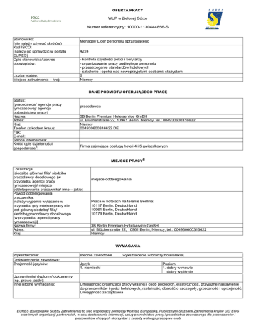 OFERTA PRACY WUP w Zielonej Górze Numer referencyjny: 10000-1130444856-S Stanowisko: (nie należy używać skrótów) Kod ISCO: (należy go sprawdzić w portalu EURES) Opis stanowiska/ zakres obowiązków: Liczba etatów: Miejsce zatrudnienia – kraj: Menager/ Lider personelu sprzątającego 4224 - kontrola czystości pokoi i korytarzy - organizowanie pracy podległego personelu - przestrzeganie standardów hotelowych - szkolenie i opeka nad nowoprzyjętymi osobami/ stażystami 5 Niemcy DANE PODMIOTU OFERUJĄCEGO PRACĘ Status: (pracodawca/ agencja pracy tymczasowej/ agencja pośrednictwa pracy) Nazwa: Adres: Kraj: Telefon (z kodem kraju): Fax: E-mail: Strona internetowa: Krótki opis działalności gospodarczeji: pracodawca 3B Berlin Premium Hotelservice GmBH ul. Blücherstraße 22, 10961 Berlin, Niemcy, tel.: 004930600316622 Niemcy 004930600316622 DE Firma zajmująca obsługą hoteli 4 i 5 gwiazdkowych MIEJSCE PRACYii Lokalizacja: [siedziba główna/ filia/ siedziba pracodawcy docelowego (w przypadku agencji pracy tymczasowej)/ miejsce oddelegowania pracownika/ inne – jakie] Powód oddelegowania pracownika: [należy wypełnić wyłącznie w przypadku gdy miejsce pracy nie jest główną siedzibą/ filią/ siedzibą pracodawcy docelowego (w przypadku agencji pracy tymczasowej)] Nazwa firmy: Adres: Kraj: miejsce oddelegowania Praca w hotelach na terenie Berllina: 10117 Berlin, Deutschland 10961 Berlin, Deutschland 10179 Berlin, Deutschland 3B Berlin Premium Hotelservice GmBH ul. Blücherstraße 22, 10961 Berlin, Niemcy, tel.: 004930600316622 Niemcy WYMAGANIA Wykształcenie: Doświadczenie zawodowe: Znajomość języków: Uprawnienia/ dyplomy/ dokumenty (np. prawo jazdy): Inne istotne wymagania: średnie zawodowe Język 1. niemiecki wykształcenie w branży hotelarskiej Poziom 1. dobry w mowie dobry w piśmie Umiejętność organizacji pracy własnej i osób podległch, elastyczność, przyjazne nastawienie do pracowników i gości hotelowych, rzetelność, dbałość o szczegóły, grzeczność i uprzejmość. Umiejętność zarządzania EURES (Europejskie Służby Zatrudnienia) to sieć współpracy pomiędzy Komisją Europejską, Publicznymi Służbami Zatrudnienia krajów UE/ EOG oraz innych organizacji partnerskich, w celu dostarczania informacji, usług pośrednictwa pracy i poradnictwa zawodowego dla pracodawców i pracowników chcących skorzystać z zasady wolnego przepływu osób WYNAGRODZENIE I WARUNKI ZATRUDNIENIA Wysokość pensji brutto: Wysokość pensji netto: Waluta, w jakiej wypłacana jest pensja: Rodzaj stawki wynagrodzenia: (godzinowa/ tygodniowa/ miesięczna/ roczna/ inna) Premie: Dodatkowe świadczenia (zakwaterowanie, wyżywienie, koszty związane ze zmianą miejsca zamieszkania, koszty podróży itp.): Nazwa firmy, z którą zostanie podpisana umowa: Rodzaj umowy: (umowa o pracę, umowa zlecenia, wolontariat, praktyka zawodowa/ staż, praca zdalna, agencja pracy tymczasowej, inne): Wymiar czasu pracy (praca na pełen etat/ część etatu): Czas trwania umowy: (nieokreślony/ określony) 9,55 Liczba godzin tygodniowo: Zmiany i praca w dni wolne: Data rozpoczęcia: Inne informacje: 35,00 Czas pracy jest zmienny i zależy od dyżurów- równiez praca w weekendy i święta. Euro Czasowy ze stawką godzinową Wynagrodzenie zgodne z układem zbiorowym. Pracodawca oferuje możliwość uczestniczenia w kursie językowym. Szczegóły ustalane są z wybranymi kandydatami. 3B Berlin Premium Hotelservice GmBH umowa o pracę pełen wymiar Data wygaśnięcia umowy (w przypadku umowy na czas określony): określony 2015-12-31 Czas pracy jest zmienny i zależy od dyżurów- równiez praca w weekendy i święta. SPOSÓB SKŁADANIA WNIOSKU Wymagane dokumenty (list motywacyjny, CV itp.): CV w jezyku niemieckim należy przesłać do pracodawcy na adres e-mail bądź pocztą tradycyjną na adres: [email protected] 3B Berlin Premium Hotelservice GmbH Frau Claudia Schüßler Blücherstraße 22 10961 Berlin Berlin Deutschland Język, w którym muszą być sporządzone przedkładane dokumenty: Do kogo należy wysłać dokumenty: (do pracodawcy/ doradcy EURES) Gdzie należy wysłać dokumenty: (adres, adres e-mail, nr faksu z kodem kraju itp.) Dane teleadresowe doradcy EURES lub przedstawiciela pracodawcy: (nazwisko, adres, telefon, fax, e-mail itp.) niemiecki do pracodawcy CV w jezyku niemieckim należy przesłać do pracodawcy na adres e-mail bądź pocztą tradycyjną na adres: [email protected] 3B Berlin Premium Hotelservice GmbH Frau Claudia Schüßler Blücherstraße 22 10961 Berlin Berlin Deutschland CV w jezyku niemieckim należy przesłać do pracodawcy na adres e-mail bądź pocztą tradycyjną na adres: [email protected] 3B Berlin Premium Hotelservice GmbH Frau Claudia Schüßler Blücherstraße 22 10961 Berlin Berlin Deutschland DODATKOWE INFORMACJE EURES (Europejskie Służby Zatrudnienia) to sieć współpracy pomiędzy Komisją Europejską, Publicznymi Służbami Zatrudnienia krajów UE/ EOG oraz innych organizacji partnerskich, w celu dostarczania informacji, usług pośrednictwa pracy i poradnictwa zawodowego dla pracodawców i pracowników chcących skorzystać z zasady wolnego przepływu osób WAŻNOŚĆ 2015-08-03 Data publikacji: Termin przedkładania podań o pracę / 2015-12-31 zakończenia ważności oferty: Uprzejmie informujemy, że skontaktujemy się wyłącznie z wybranymi kandydatami. UWAGA: 1. Umowa z zagranicznym pracodawcą jest zawierana, co do zasady, zgodnie z prawem kraju zatrudnienia. Oznacza to, że wszystkie roszczenia odnośnie warunków, które obejmuje umowa, można kierować wyłącznie do odpowiedniego sądu w kraju zatrudnienia. Publiczne służby zatrudnienia (EURES) nie mogą pośredniczyć ani reprezentować pracownika w sądzie kraju zatrudnienia w przypadku sporu z pracodawcą. 2. Publiczne służby zatrudnienia (EURES) dokładają wszelkich starań, aby zapewnić rzetelność i wiarygodność ofert pracy zgłoszonych w lokalnym urzędz