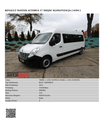 RENAULT MASTER AUTOBUS 17 MIEJSC KLIMATYZACJA [ 6594 ] Cena: Typ Nadwozia: Rok Produkcji: Przebieg: Rodzaj Paliwa: Moc: Skrzynia Biegów: Kolor: Liczba Drzwi: 78900 + 23% VATPLN 18346 + 23% VATEUR BUS / MINIBUS 2011 154540km. DIESEL 125 MANUALNA biały 3 INFORMACJE DODATKOWE ● ● ● bezwypadkowy sprowadzony zarejestrowany w polsce WYPOSAŻENIE ● ● ● ● ● ● ● ● ● ● ABS centralny zamek elektryczne lusterka immobiliser klimatyzacja komputer kontrola trakcji radio / cd wspomaganie kierownicy elektryczne szyby OPIS NUMER OFERTY- 6594 Perfekcyjnie utrzymany Renault Master bus, autobus 17 miejsc. Rok produkcji 2011, kolor biały. Auto prezentuje się rewelacyjnie. Jest bezwypadkowe, w pełni sprawne. Wzorowo utrzymane wnętrze. Wszystko działa tak jak powinno. Powłoka lakiernicza nie budzi zastrzeżeń. Idealna praca silnika, skrzyni biegów i zawieszenia. Silnik 2.3 dci ma moc 125KM. Auto wyposażone w klimatyzację. Każdy fotel zaopatrzony jest w pasy bezpieczeństwa, oświetlenie i nawiew. Uruchomienie silnika następuje po wcześniejszym zbadaniu stanu trzeźwości kierowcy. W przypadku gdy kierowca jest nietrzeźwy uruchomienie silnika jest niemożliwe. DMC auta 3870 kg. Wyposażenie: - ABS, ASR - poduszka powietrzna kierowcy i pasażera - klimatyzacja - kamera cofania - wspomaganie kierownicy - kierownica wielofunkcyjna - immobiliser - centralny zamek - elektryczne szyby i lusterka - radio CD - 6 biegów - 17 miejsc - indywidualne oświetlenie i nawiew - pasy bezpieczeństwa - system Interlock- badający stan trzeźwości kierowcy Podana cena jest CENĄ NETTO!!. Wystawiamy Fakturę VAT. MOŻLIWOŚĆ KREDYTOWANIA LUB LEASINGOWANIA, 100% WARTOŚCI AUTA, PROCEDURA UPROSZCZONA, WYMAGANE DOKUMENTY NIP, REGON, WPIS DO EWIDENCJI, DOWÓD OSOBISTY. WIĘCEJ INFORMACJI NA STRONIE WWW.AUTO-PLUS.COM.PL NINIEJSZE OGŁOSZENIE JEST WYŁĄCZNIE INFORMACJĄ HANDLOWĄ I NIE STANOWI OFERTY W MYŚL art. 66, § 1. KODEKSU CYWILNEGO. SPRZEDAJĄCY NIE ODPOWIADA ZA EWENTUALNE BŁĘDY LUB NIEAKTUALNOŚĆ OGŁOSZENIA.