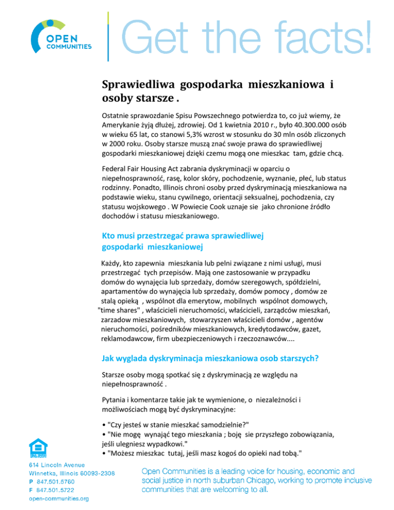 Sprawiedliwa gospodarka mieszkaniowa i osoby starsze . Ostatnie sprawozdanie Spisu Powszechnego potwierdza to, co już wiemy, że Amerykanie żyją dłużej, zdrowiej. Od 1 kwietnia 2010 r., było 40.300.000 osób w wieku 65 lat, co stanowi 5,3% wzrost w stosunku do 30 mln osób zliczonych w 2000 roku. Osoby starsze muszą znać swoje prawa do sprawiedliwej gospodarki mieszkaniowej dzięki czemu mogą one mieszkac tam, gdzie chcą. Federal Fair Housing Act zabrania dyskryminacji w oparciu o niepełnosprawność, rasę, kolor skóry, pochodzenie, wyznanie, płeć, lub status rodzinny. Ponadto, Illinois chroni osoby przed dyskryminacją mieszkaniowa na podstawie wieku, stanu cywilnego, orientacji seksualnej, pochodzenia, czy statusu wojskowego . W Powiecie Cook uznaje sie jako chronione źródło dochodów i statusu mieszkaniowego. Kto musi przestrzegać prawa sprawiedliwej gospodarki mieszkaniowej Każdy, kto zapewnia mieszkania lub pelni związane z nimi usługi, musi przestrzegać tych przepisów. Mają one zastosowanie w przypadku domów do wynajęcia lub sprzedaży, domów szeregowych, spółdzielni, apartamentów do wynajęcia lub sprzedaży, domów pomocy , domów ze stalą opieką , wspólnot dla emerytow, mobilnych wspólnot domowych, "time shares" , właścicieli nieruchomości, właścicieli, zarządców mieszkań, zarzadow mieszkaniowych, stowarzyszen właścicieli domów , agentów nieruchomości, pośredników mieszkaniowych, kredytodawców, gazet, reklamodawcow, firm ubezpieczeniowych i rzeczoznawców.... Jak wyglada dyskryminacja mieszkaniowa osob starszych? Starsze osoby mogą spotkać się z dyskryminacją ze względu na niepełnosprawność . Pytania i komentarze takie jak te wymienione, o niezależności i możliwościach mogą być dyskryminacyjne: • "Czy jesteś w stanie mieszkać samodzielnie?" • "Nie mogę wynająć tego mieszkania ; boję sie przyszłego zobowiązania, jeśli ulegniesz wypadkowi." • "Możesz mieszkac tutaj, jeśli masz kogoś do opieki nad tobą." • "Dlaczego otrzymujesz świadczenia socjalne ?" • "Będę musiał przejrzeć twoja dokumentację medyczną." Oświadczenia kierujące osoby starsze do poszczególnych typów mieszkań mogą być dyskryminacyjne: • "Mieszkańcy poruszający sie z urządzeniem podpierającym mieszkają na 1 piętrze." • "Nasi aktywni seniorzy mieszkają w tych mieszkaniach." • "Mieszkańcy na wózkach używają jadalni na drugim pietrze." • "Nie pozwalamy ludziom mieszkać w tych mieszkaniach z 24-godzinną opieką osobistą." • "doskonała okazja dla osób aktywnych”. Odmienne traktowanie w zakresie czynszu, kaucji lub płatności ubezpieczeniowych mogą być dyskryminacyjne: • "Trzeba dodatkowo zapłacić za zamieszkującą wspólnie pomoc medyczną." • "Można używać dla wózka inwalidzkiego tylko windy serwisowej ". • "Osoby, które używają wózków inwalidzkich powodują dodatkowe uszkodzenia , będziesz musiał zaplacić podwójny depozyt." Sprawiedliwe prawo mieszkaniowe chroni również osoby starsze, jeśli chodzi o finansowanie swoich domów. Banki, pożyczkodawcy, firmy ubezpieczeniowe nie mogą ustanawiać różnych stawek kredytów hipotecznych, różnych terminów, lub odmówić negocjacji z Tobą, z powodu twojego wieku lub niepełnosprawności. Co mogę zrobić, jeśli byłem dyskryminowany? Jeśli uważasz, że jesteś ofiarą dyskryminacji mieszkaniowej, lub po prostu chcesz lepiej zrozumieć swoje prawa i obowiązki mieszkaniowe, skontaktuj sie z Open Comunities na telefon (847) 501-5760 lub e-mail [email protected] Stworzony przez Sztab Open Comunities 11/12. Prace, które stały się podstawą tej publikacji zostały wsparte w części z grantu Departamentu Mieszkalnictwa i Rozwoju Miast. Treśc i ustalenia podane są do publicznej wiadomości. Autor i wydawca jest wyłącznie odpowiedzialny za prawidłowość oświadczeń i interpretacji zawartych w niniejszej publikacji. Takie interpretacje nie muszą odzwierciedlać poglądów rządu federalnego. Niniejsza broszura nie jest przeznaczona do zastąpienia porady adwokata.. What can I do if I have been discriminated against? If you believe you are the victim of housing discrimination, or would simply like to gain a better understanding of your fair housing rights and responsibilities, contact Open Communities at (847) 501-5760 or email [email protected]. The work that provided the basis for this publication was supported in part by a grant from the U. S. Department of Housing and Urban Development. The substance and findings of the work are dedicated to the public. The author and publisher are solely responsible for the accuracy of the statements and interpretations contained in this publication. Such interpretations do not necessarily reflect the views of the Federal Government. This is not intended to replace the advice of an attorney. (December 2012 – Older Adults - Polish)
