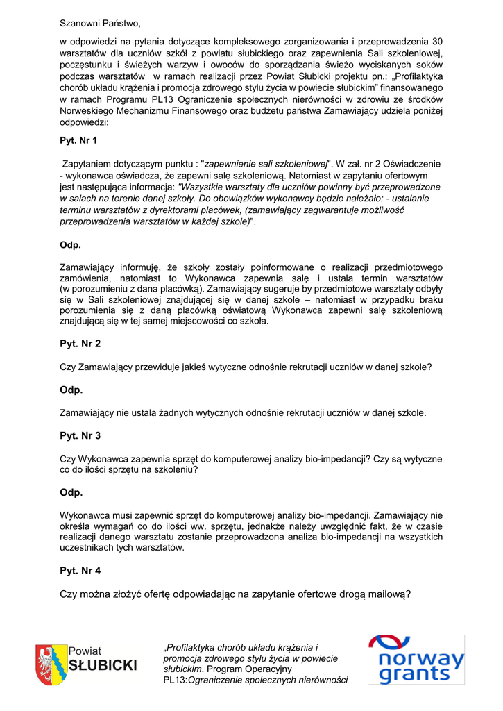 Szanowni Państwo, w odpowiedzi na pytania dotyczące kompleksowego zorganizowania i przeprowadzenia 30 warsztatów dla uczniów szkół z powiatu słubickiego oraz zapewnienia Sali szkoleniowej, poczęstunku i świeżych warzyw i owoców do sporządzania świeżo wyciskanych soków podczas warsztatów w ramach realizacji przez Powiat Słubicki projektu pn.: „Profilaktyka chorób układu krążenia i promocja zdrowego stylu życia w powiecie słubickim” finansowanego w ramach Programu PL13 Ograniczenie społecznych nierówności w zdrowiu ze środków Norweskiego Mechanizmu Finansowego oraz budżetu państwa Zamawiający udziela poniżej odpowiedzi: Pyt. Nr 1 Zapytaniem dotyczącym punktu : "zapewnienie sali szkoleniowej". W zał. nr 2 Oświadczenie - wykonawca oświadcza, że zapewni salę szkoleniową. Natomiast w zapytaniu ofertowym jest następująca informacja: "Wszystkie warsztaty dla uczniów powinny być przeprowadzone w salach na terenie danej szkoły. Do obowiązków wykonawcy będzie należało: - ustalanie terminu warsztatów z dyrektorami placówek, (zamawiający zagwarantuje możliwość przeprowadzenia warsztatów w każdej szkole)". Odp. Zamawiający informuję, że szkoły zostały poinformowane o realizacji przedmiotowego zamówienia, natomiast to Wykonawca zapewnia salę i ustala termin warsztatów (w porozumieniu z dana placówką). Zamawiający sugeruje by przedmiotowe warsztaty odbyły się w Sali szkoleniowej znajdującej się w danej szkole – natomiast w przypadku braku porozumienia się z daną placówką oświatową Wykonawca zapewni salę szkoleniową znajdującą się w tej samej miejscowości co szkoła. Pyt. Nr 2 Czy Zamawiający przewiduje jakieś wytyczne odnośnie rekrutacji uczniów w danej szkole? Odp. Zamawiający nie ustala żadnych wytycznych odnośnie rekrutacji uczniów w danej szkole. Pyt. Nr 3 Czy Wykonawca zapewnia sprzęt do komputerowej analizy bio-impedancji? Czy są wytyczne co do ilości sprzętu na szkoleniu? Odp. Wykonawca musi zapewnić sprzęt do komputerowej analizy bio-impedancji. Zamawiający nie określa wymagań co do ilości ww. sprzętu, jednakże należy uwzględnić fakt, że w czasie realizacji danego warsztatu zostanie przeprowadzona analiza bio-impedancji na wszystkich uczestnikach tych warsztatów. Pyt. Nr 4 Czy można złożyć ofertę odpowiadając na zapytanie ofertowe drogą mailową? „Profilaktyka chorób układu krążenia i promocja zdrowego stylu życia w powiecie słubickim. Program Operacyjny PL13:Ograniczenie społecznych nierówności w zdrowiu.” Odp. Ofertę należy złożyć – zgodnie z rozdz. IX zapytania ofertowego - pisemnie za pośrednictwem poczty lub osobiście w siedzibie Starostwa Powiatowego przy ul. Piłsudskiego 20 w Słubicach (na parterze w Biurze Obsługi Interesanta) w zamkniętej kopercie opisanej następująco: „Oferta – warsztaty szkoleniowe dla uczniów – nie otwierać przed dniem 22 marca 2016 r. godz. 1300 ” „Profilaktyka chorób układu krążenia i promocja zdrowego stylu życia w powiecie słubickim. Program Operacyjny PL13:Ograniczenie społecznych nierówności w zdrowiu.”