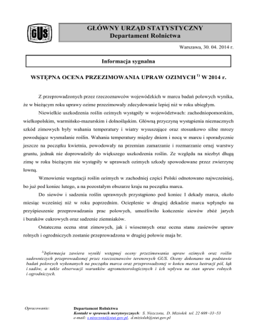 GŁÓWNY URZĄD STATYSTYCZNY Departament Rolnictwa Warszawa, 30. 04. 2014 r. Informacja sygnalna WSTĘPNA OCENA PRZEZIMOWANIA UPRAW OZIMYCH 1) W 2014 r. Z przeprowadzonych przez rzeczoznawców wojewódzkich w marcu badań polowych wynika, że w bieżącym roku uprawy ozime przezimowały zdecydowanie lepiej niż w roku ubiegłym. Niewielkie uszkodzenia roślin ozimych wystąpiły w województwach: zachodniopomorskim, wielkopolskim, warmińsko-mazurskim i dolnośląskim. Główną przyczyną wystąpienia nieznacznych szkód zimowych były wahania temperatury i wiatry wysuszające oraz stosunkowo silne mrozy powodujące wysmalanie roślin. Wahania temperatury między dniem i nocą w marcu i sporadycznie jeszcze na początku kwietnia, powodowały na przemian zamarzanie i rozmarzanie ornej warstwy gruntu, jednak nie doprowadziły do większego uszkodzenia roślin. Ze względu na niezbyt długą zimę w roku bieżącym nie wystąpiły w uprawach ozimych szkody spowodowane przez zwierzynę łowną. Wznowienie wegetacji roślin ozimych w zachodniej części Polski odnotowano najwcześniej, bo już pod koniec lutego, a na pozostałym obszarze kraju na początku marca. Do siewów i sadzenia roślin uprawnych przystąpiono pod koniec I dekady marca, około miesiąc wcześniej niż w roku poprzednim. Ocieplenie w drugiej dekadzie marca wpłynęło na przyśpieszenie przeprowadzania prac polowych, umożliwiło kończenie siewów zbóż jarych i buraków cukrowych oraz sadzenie ziemniaków. Ostateczna ocena strat zimowych, jak i wiosennych oraz ocena stanu zasiewów upraw rolnych i ogrodniczych zostanie przeprowadzona w drugiej połowie maja br. Informacja zawiera wyniki wstępnej oceny przezimowania upraw ozimych oraz roślin sadowniczych przeprowadzonej przez rzeczoznawców terenowych GUS. Oceny dokonano na podstawie badań polowych wykonanych na początku marca oraz przeprowadzonej w końcu marca lustracji pól, łąk i sadów, a także obserwacji warunków agrometeorologicznych i ich wpływu na stan upraw rolnych i ogrodniczych. 1) Opracowanie: Departament Rolnictwa Kontakt w sprawach merytorycznych: S. Niszczota, D. Miziołek tel. 22 608−33−53 e-mail: [email protected], [email protected] Ocena stanu roślin ozimych zasianych jesienią 2013 r. pod zbiory w 2014 r. Warunki agrometeorologiczne jesienią 2013 roku sprzyjały prowadzeniu prac polowych oraz były korzystne dla kiełkowania i wzrostu roślin ozimych na terenie całego kraju. W okresie od sierpnia do października było ciepło, a uwilgotnienie gleby na ogół wystarczające. Jedynie w początkowej fazie wschodów zbóż i rzepaku obserwowano rejonami niedobory wilgoci w glebie, utrudniające wschody roślin. Uprawy ozime w końcowej fazie rozwoju jesienią 2013 r. - przed wejściem w stan zimowego spoczynku – były dobrze rozkrzewione, a często nawet nadmiernie wyrośnięte. Przebieg pogody w listopadzie nie stwarzał zagrożenia dla roślin. Z oceny przeprowadzonej w listopadzie przez rzeczoznawców wojewódzkich GUS wynika, że powierzchnia zasiewów zbóż ozimych pod zbiory 2014 r. wyniosła około 4,4 mln ha, tj. na poziomie roku ubiegłego, przy czym: • pszenicy ozimej zasiano na powierzchni o około 3% mniej niż w 2013 roku, • powierzchnia zasiewów żyta wyniosła około 1% mniej niż w 2013 roku, • oszacowano, że pszenżyta ozimego zasiano o około 6% więcej niż w 2013 roku, • powierzchnia zasiewów jęczmienia ozimego była na poziomie 2013 roku, • powierzchnia zasiewów mieszanek zbożowych ozimych wyniosła o około 40% mniej niż w 2013 roku. Powierzchnię pod zbiory 2014 r. obsianą rzepakiem i rzepikiem ozimym szacuje się na ponad 0,8 mln ha. Stan zasiewów zbóż ozimych pod zbiory 2014 r., przed wejściem w stan zimowego spoczynku był lepszy od ubiegłorocznego. Oceniono go na 3,6 – 3,8 stopnia kwalifikacyjnego. Najwyżej oceniono stan plantacji: pszenicy ozimej, jęczmienia ozimego i rzepaku ozimego, tj. na 3,8 stopnia kwalifikacyjnego. Najniżej oceniono stan plantacji: żyta i mieszanek zbożowych ozimych (na 3,6 stopnia). W przekroju wojewódzkim stan zasiewów zbóż ozimych był zróżnicowany. Oceny stanu poszczególnych gatunków zbóż ozimych wahały się: dla pszenicy - od 3,5 stopnia kwalifikacyjnego w województwach: kujawsko- pomorskim i łódzkim do 4,2 w województwie opolskim i 4,1 stopnia w województwie śląskim; dla żyta - od 3,4 stopnia kwalifikacyjnego w województwie wielkopolskim do 4,4 w województwie śląskim; 2 dla jęczmienia - od 3,6 stopnia kwalifikacyjnego w województwach: dolnośląskim, kujawsko-pomorskim, łódzkim, pomorskim i wielkopolskim do 4,5 w województwie śląskim; dla pszenżyta - od 3,5 stopnia kwalifikacyjnego w województwach kujawsko-pomorskim i łódzkim do 4,6 w województwie śląskim; dla mieszanek zbożowych - od 3,4 stopnia kwalifikacyjnego w województwach podkarpackim i wielkopolskim do 4,0 w województwach: lubelskim, opolskim, śląskim i świętokrzyskim. Plantacje rzepaku i rzepiku ozimego oceniono na 3,8 stopnia kwalifikacyjnego. Oceny plantacji wahały się od 3,5 stopnia kwalifikacyjnego w województwie lubelskim do 4,2 stopnia kwalifikacyjnego w województwach: małopolskim, podkarpackim i śląskim. Tabl. 1. Ocena stanu zasiewów ozimin w listopadzie 2013 r. 2007 2008 Wyszczególnienie 2009 2010 2011 2012 2013 w stopniach kwalifikacyjnych a) Pszenica 3,7 3,8 3,6 3,5 3,5 3,7 3,8 Żyto 3,6 3,7 3,6 3,4 3,4 3,6 3,6 Jęczmień 3,7 3,8 3,7 3,5 3,6 3,7 3,8 Pszenżyto 3,6 3,8 3,6 3,5 3,5 3,6 3,7 Mieszanki zbożowe 3,5 3,6 3,6 3,4 3,4 3,5 3,6 Rzepak i rzepik 3,7 3,9 3,8 3,4 3,8 3,8 3,8 a) Stopień „5” oznacza stan bardzo dobry, „4”– dobry, „3”– dostateczny, „2” – słaby, „1”– zły, klęskowy. W optymalnych terminach agrotechnicznych zasiano około 80,3% powierzchni pszenicy ozimej (w 2012 r. – 84,7%), około 76,7% powierzchni żyta (w 2012 r. – 75,0%), około 85,9% powierzchni jęczmienia ozimego (w 2012