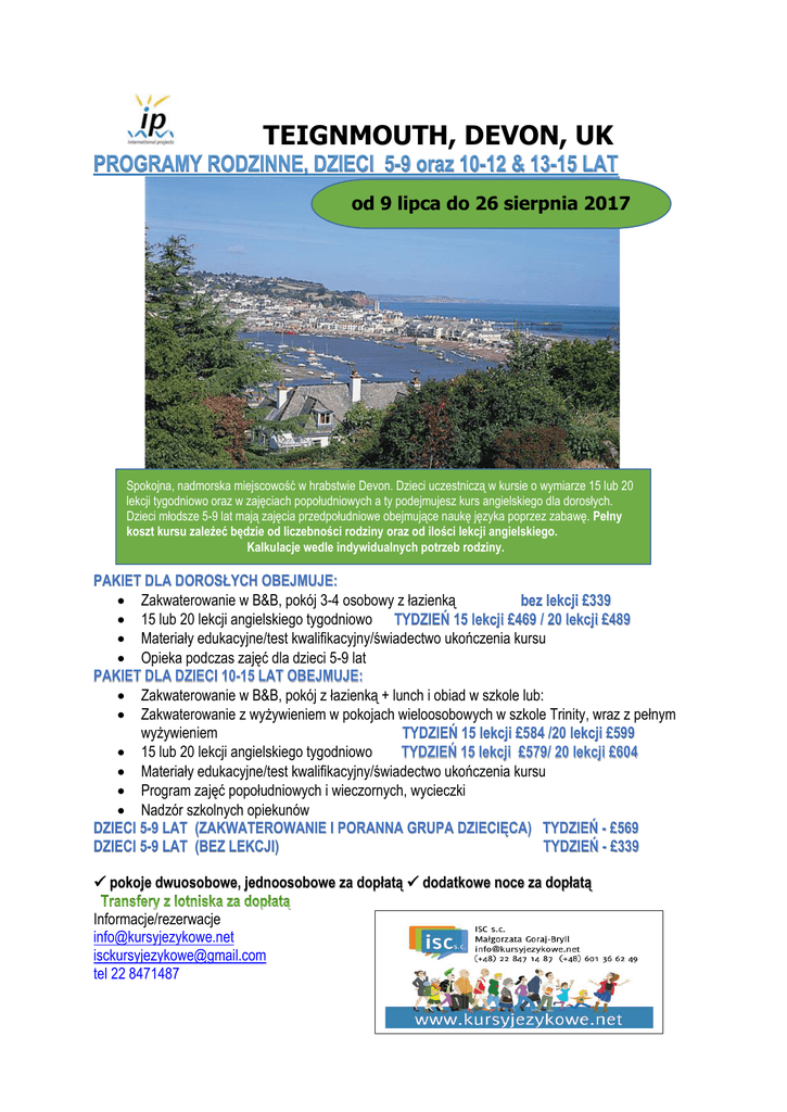 TEIGNMOUTH, DEVON, UK od 9 lipca do 26 sierpnia 2017 Spokojna, nadmorska miejscowość w hrabstwie Devon. Dzieci uczestniczą w kursie o wymiarze 15 lub 20 lekcji tygodniowo oraz w zajęciach popołudniowych a ty podejmujesz kurs angielskiego dla dorosłych. Dzieci młodsze 5-9 lat mają zajęcia przedpołudniowe obejmujące naukę języka poprzez zabawę. Pełny koszt kursu zależeć będzie od liczebności rodziny oraz od ilości lekcji angielskiego. Kalkulacje wedle indywidualnych potrzeb rodziny. PAKIET DLA DOROSŁYCH OBEJMUJE: Zakwaterowanie w B&B, pokój 3-4 osobowy z łazienką bez lekcji £339 15 lub 20 lekcji angielskiego tygodniowo TYDZIEŃ 15 lekcji £469 / 20 lekcji £489 Materiały edukacyjne/test kwalifikacyjny/świadectwo ukończenia kursu Opieka podczas zajęć dla dzieci 5-9 lat PAKIET DLA DZIECI 10-15 LAT OBEJMUJE: Zakwaterowanie w B&B, pokój z łazienką + lunch i obiad w szkole lub: Zakwaterowanie z wyżywieniem w pokojach wieloosobowych w szkole Trinity, wraz z pełnym wyżywieniem TYDZIEŃ 15 lekcji £584 /20 lekcji £599 15 lub 20 lekcji angielskiego tygodniowo TYDZIEŃ 15 lekcji £579/ 20 lekcji £604 Materiały edukacyjne/test kwalifikacyjny/świadectwo ukończenia kursu Program zajęć popołudniowych i wieczornych, wycieczki Nadzór szkolnych opiekunów DZIECI 5-9 LAT (ZAKWATEROWANIE I PORANNA GRUPA DZIECIĘCA) TYDZIEŃ - £569 DZIECI 5-9 LAT (BEZ LEKCJI) TYDZIEŃ - £339 pokoje dwuosobowe, jednoosobowe za dopłatą dodatkowe noce za dopłatą Informacje/rezerwacje [email protected] [email protected] tel 22 8471487